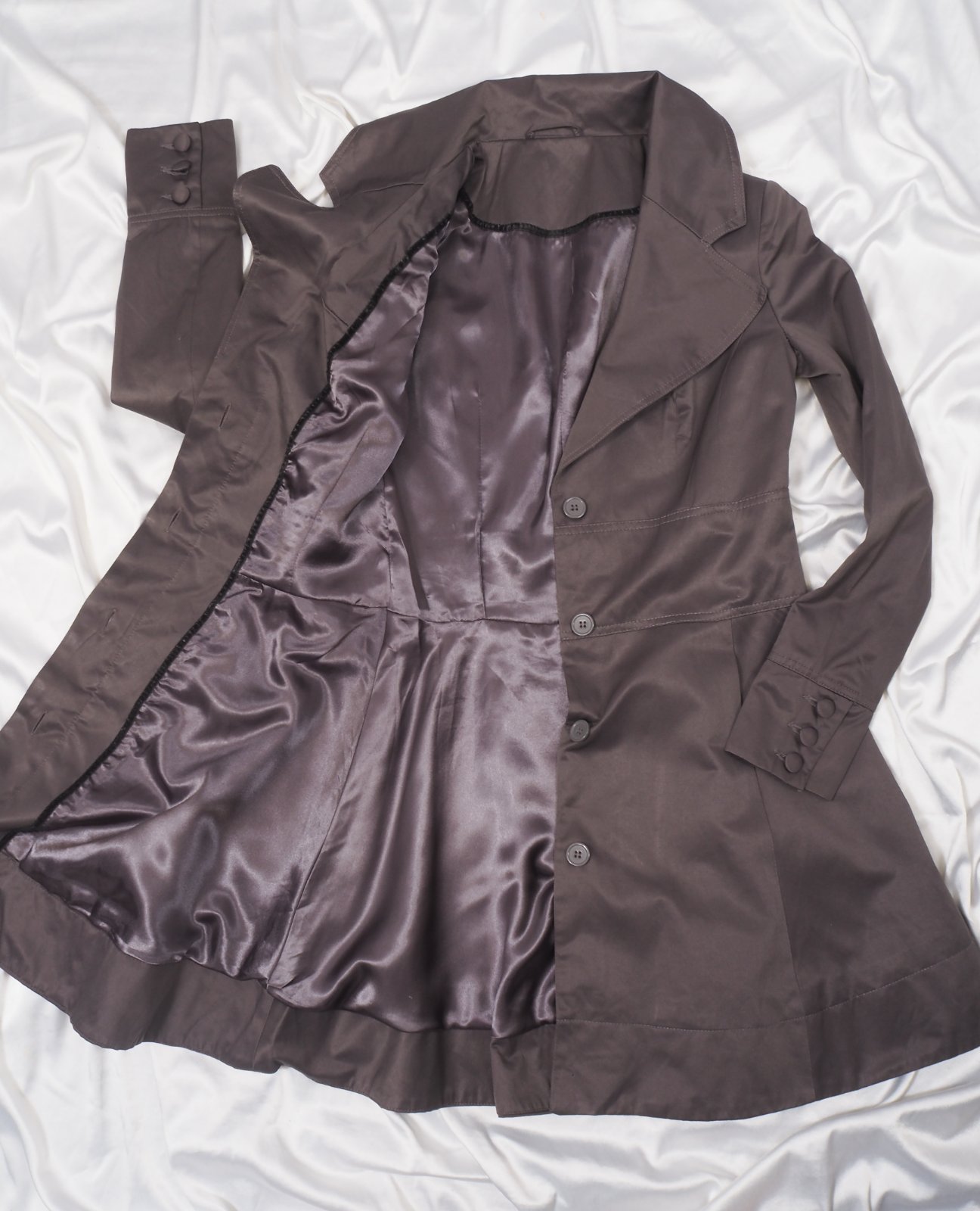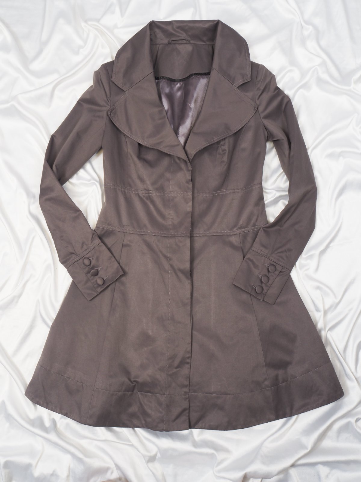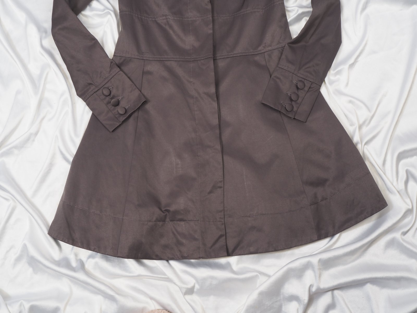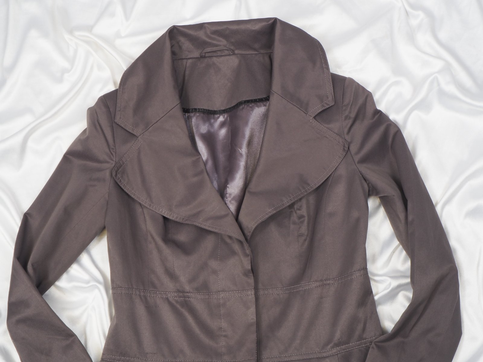 Kvalitný prechodný trenčkot, zapínanie na skryté gombíky, materiál 51% bavlna, 49% polyester, super stav.