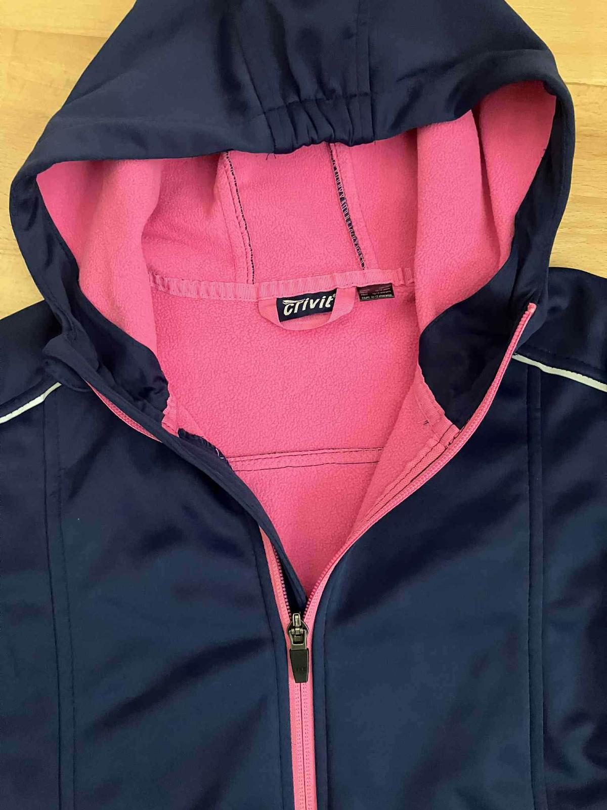 Tenka vetrovka, podsita len sietovinou, velkost 146 - 152, bez poskodeni, ako nova. Farebne pekna tmavomodra so sytou ruzovou. Rozmery: sirka 44,5 cm dlzka 61cm rukav merany od krku 67cm