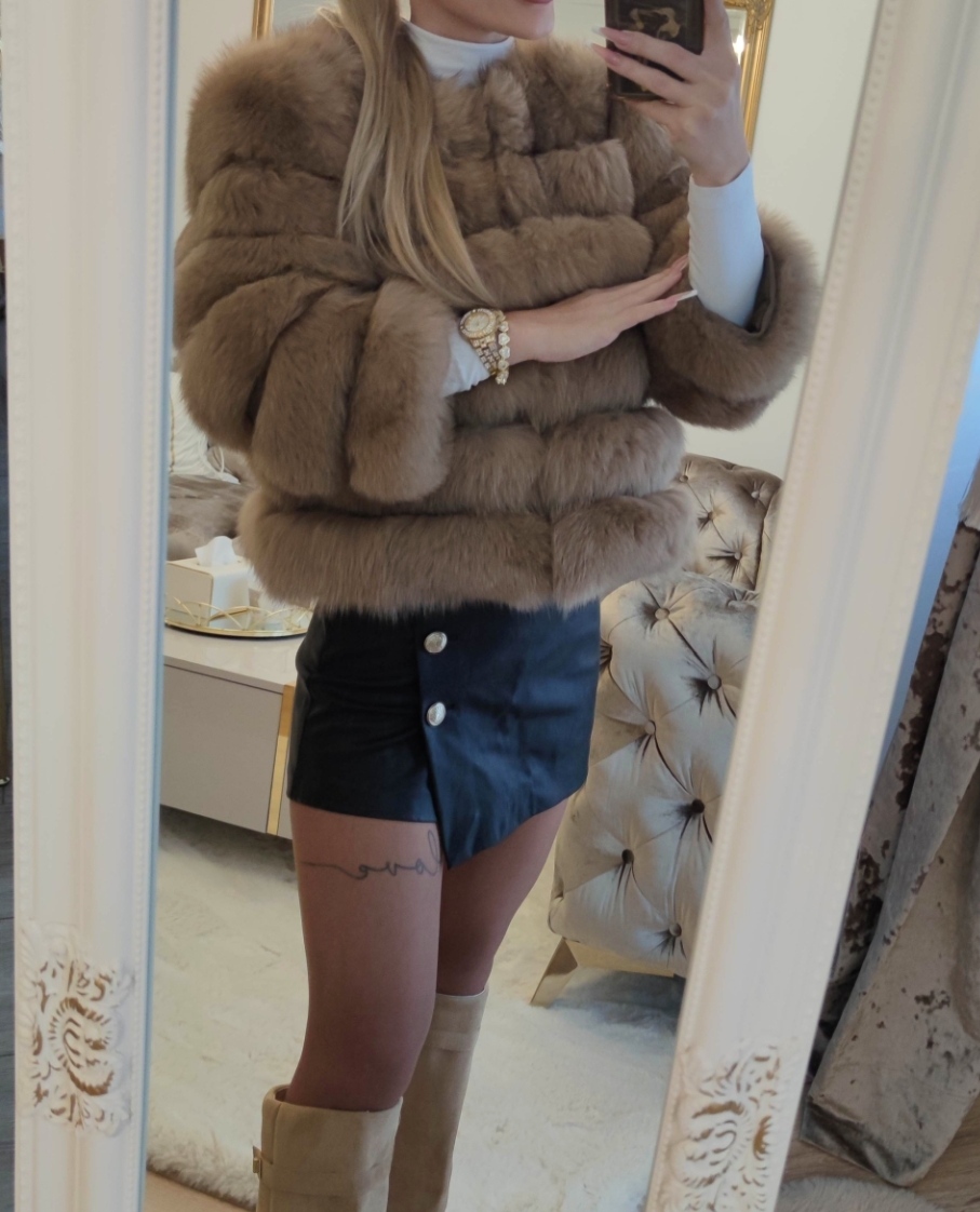 Elegantný kožuch so stojačikovým golierom, dĺžka 70cm, šírka v ramenách 45cm, vonkajšia dĺžka rukávov 60cm, spod pazuchy 41cm.