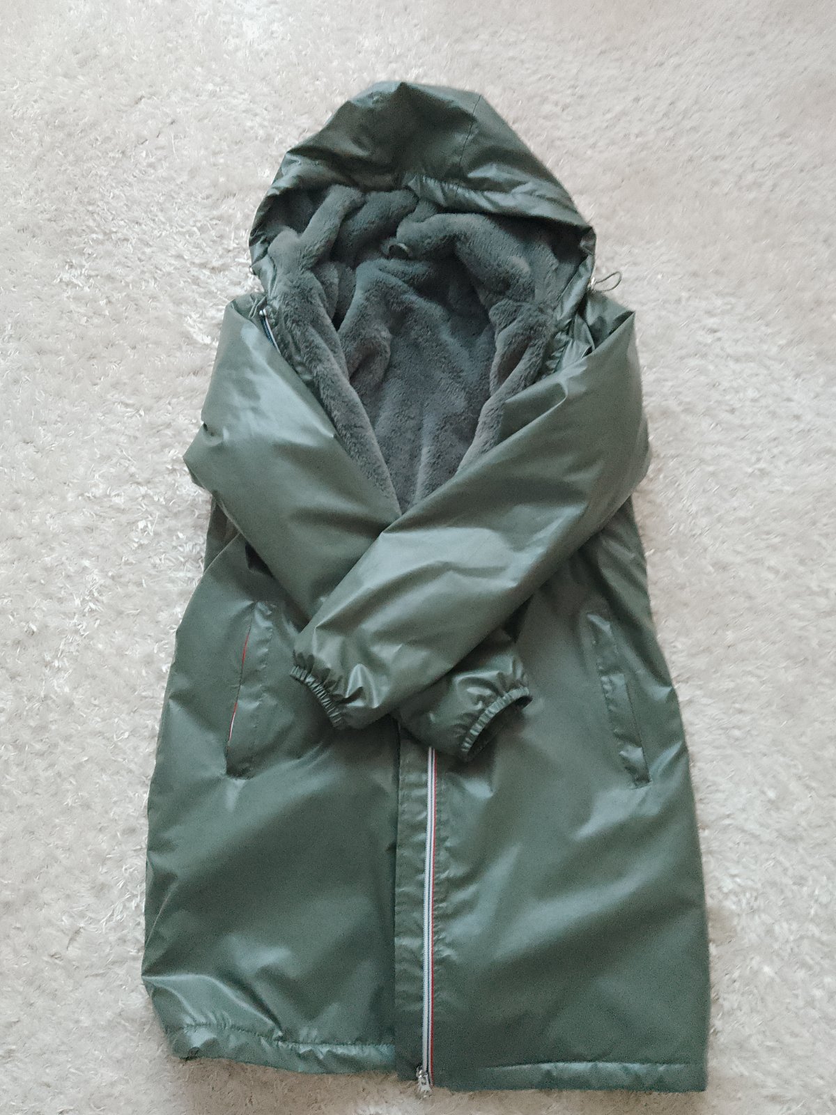 Predám zateplenu bundu v dobrom stave je ako nová.Obvod hrude 52cm. Dĺžka ramena 12,5. Dĺžka rukáva 61 cm. Dĺžka bundy 80cm