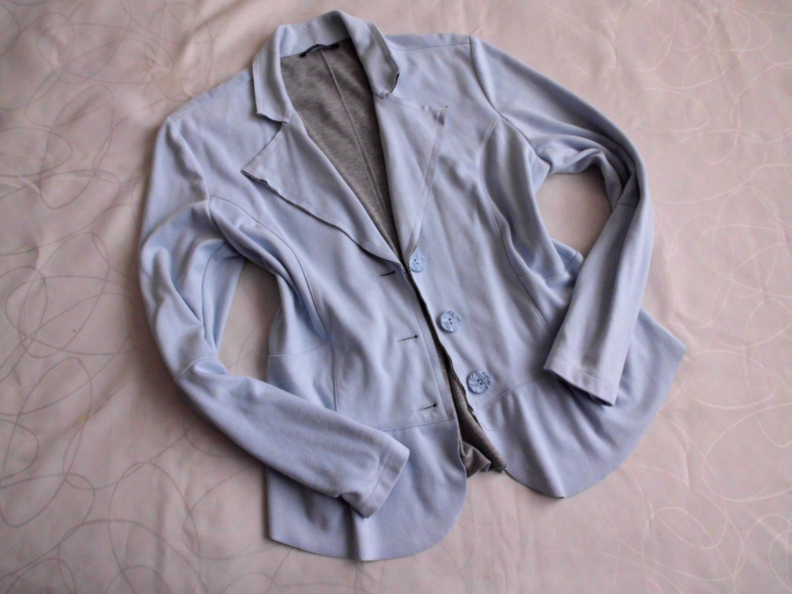Predám dámske sako Italy vel. M-L , dĺžka 60 cm, šírka 49 cm, rukáv 61 cm od pleca, príjemný zvláštny materiál akoby jelenica, pekný strih, bledomodrá farba , 2x oblečené , 100% top stav