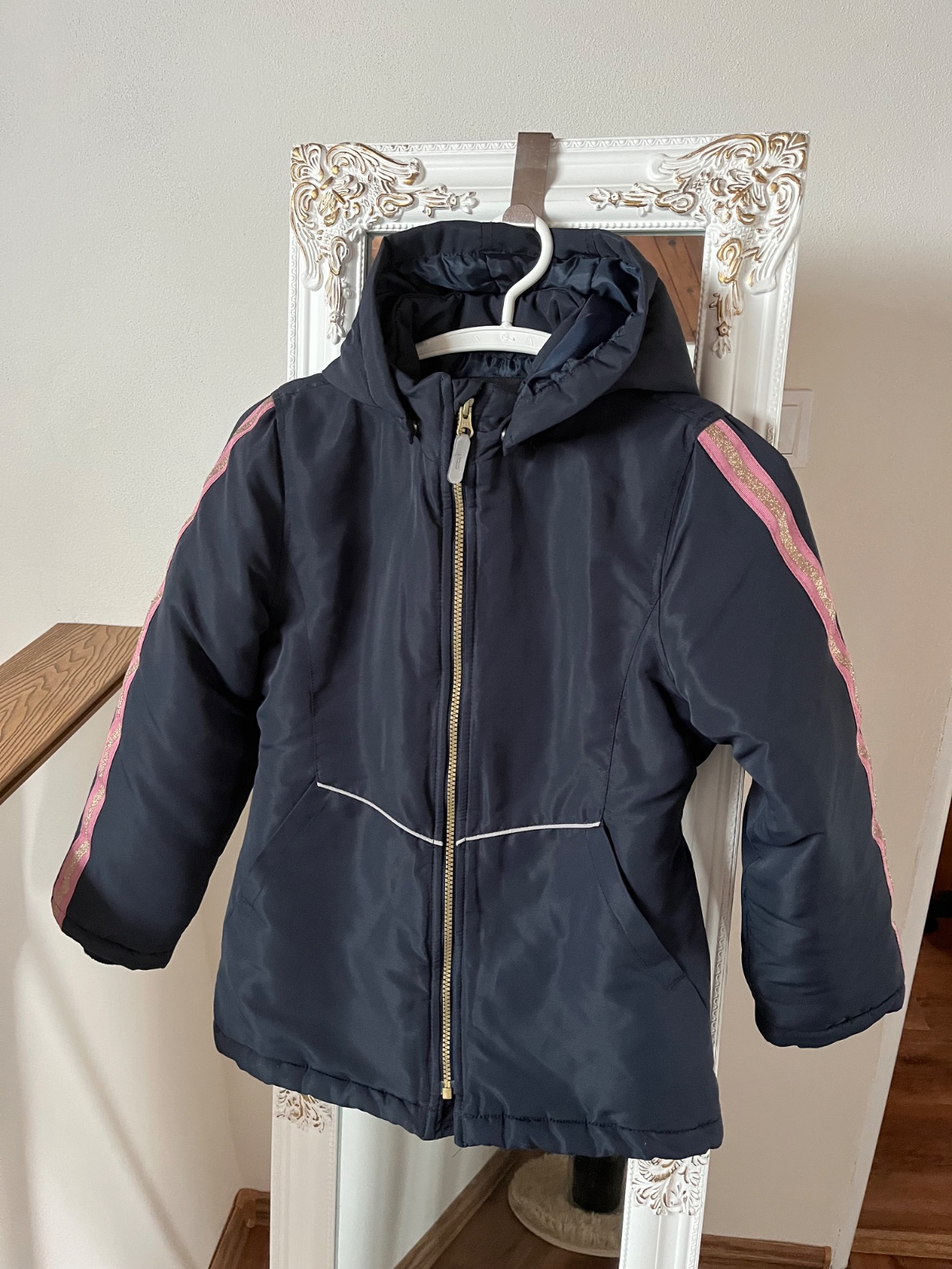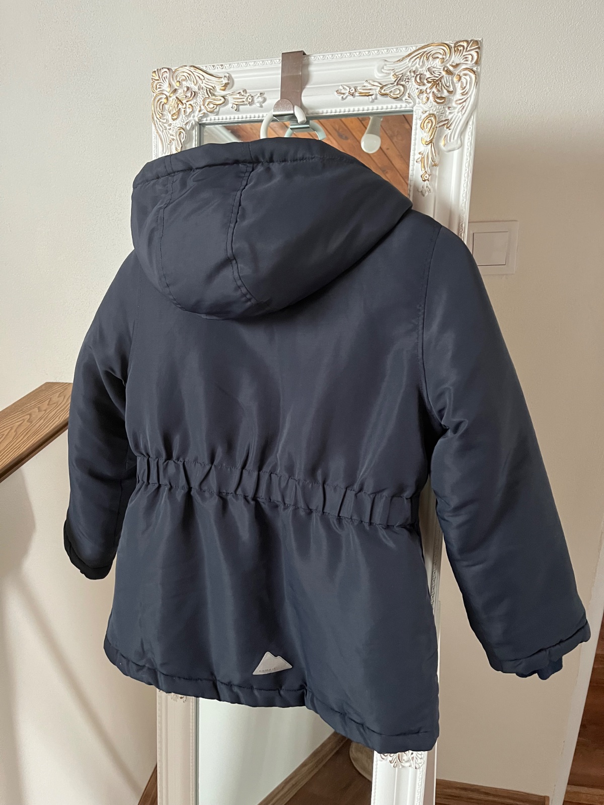 Tmavomodrá bundička vhodná na menšiu zimu alebo prechodné obdobie. Veľkosť 146, krásny stav. Rozmery medzi fotkami.
