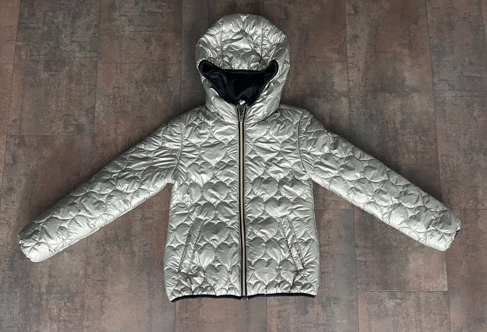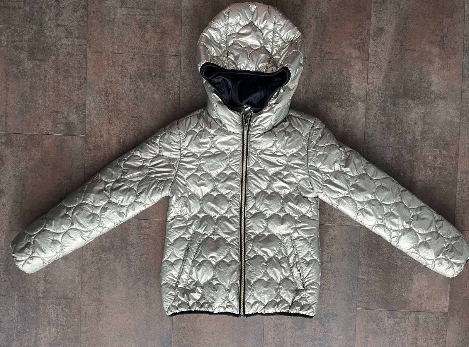 Ponúkam na predaj krásnu, teplú, zimnú bundu, zlatej farby, s metalickým leskom. Veľkosť 146/152. Bunda má prešívanie, kapucňu, ktorá je odopínateľná, s kožušinou, zapína sa na zips a patentky v p...