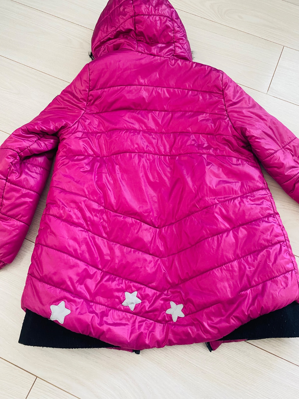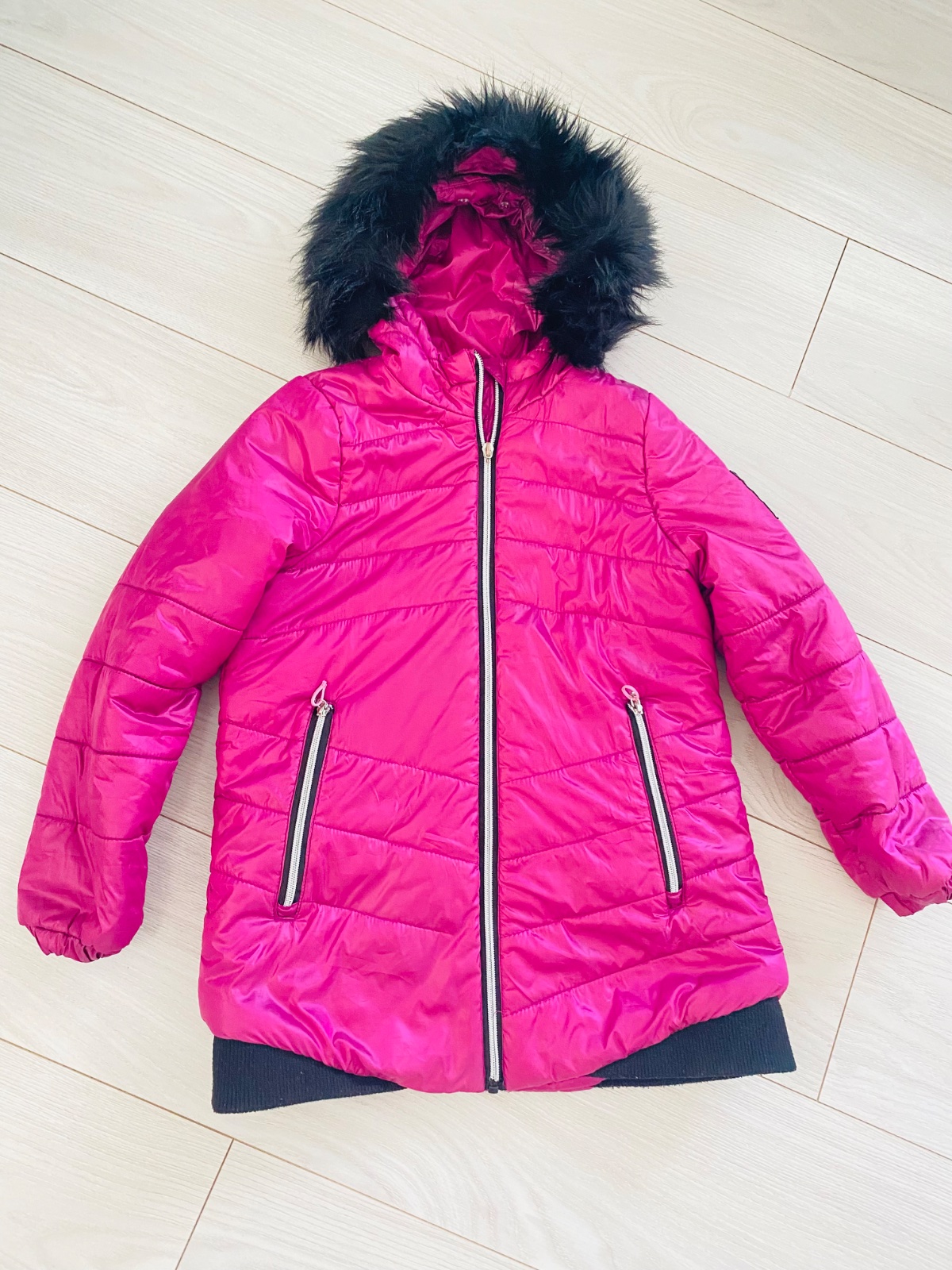 Nosena 2 sezony, ma uz zopar nedostatkov, ale stale posluzi, kozusina sa da odopnut, farba skor malinova, mozne nosit aj na chladnejsiu jesen je dlhsia po zadok.