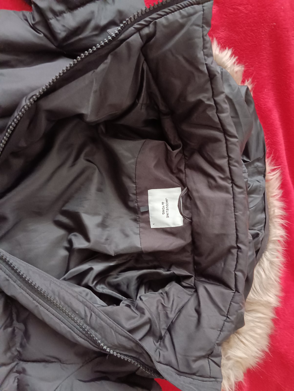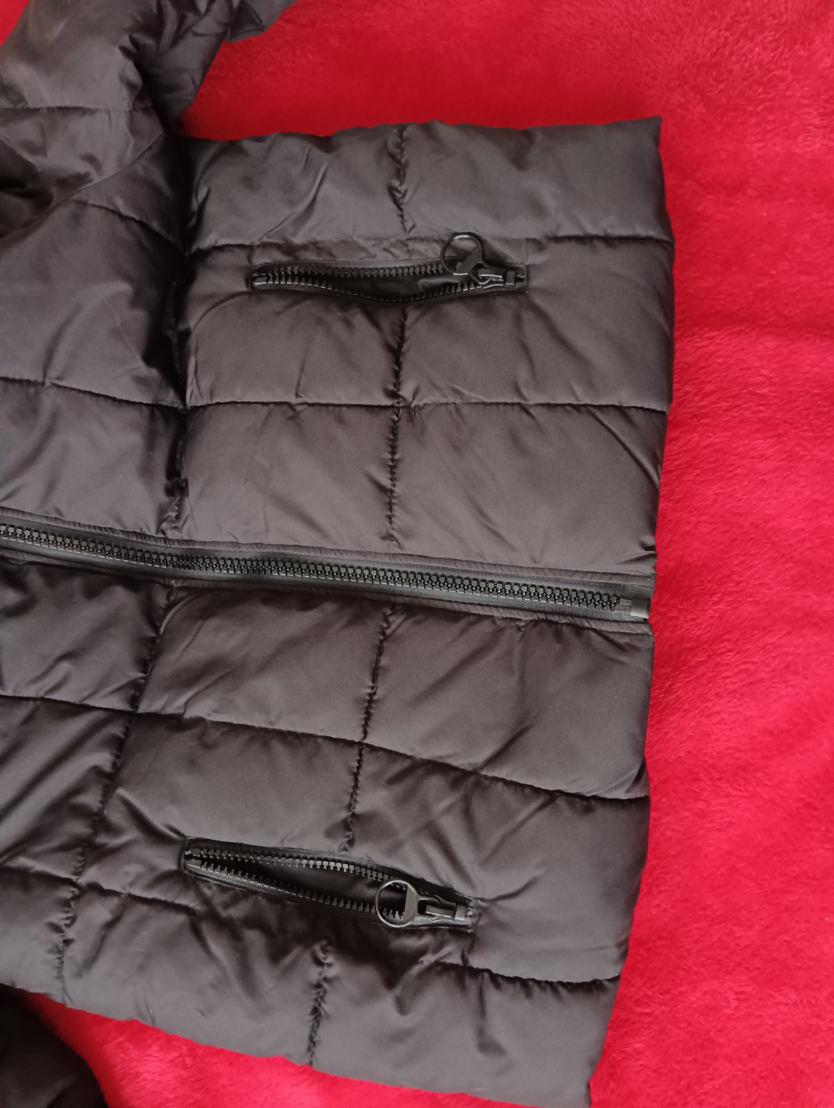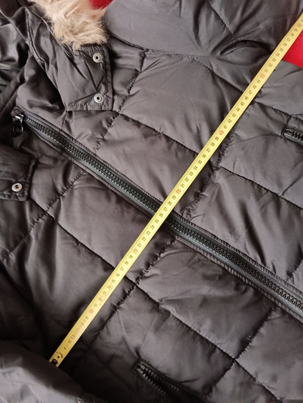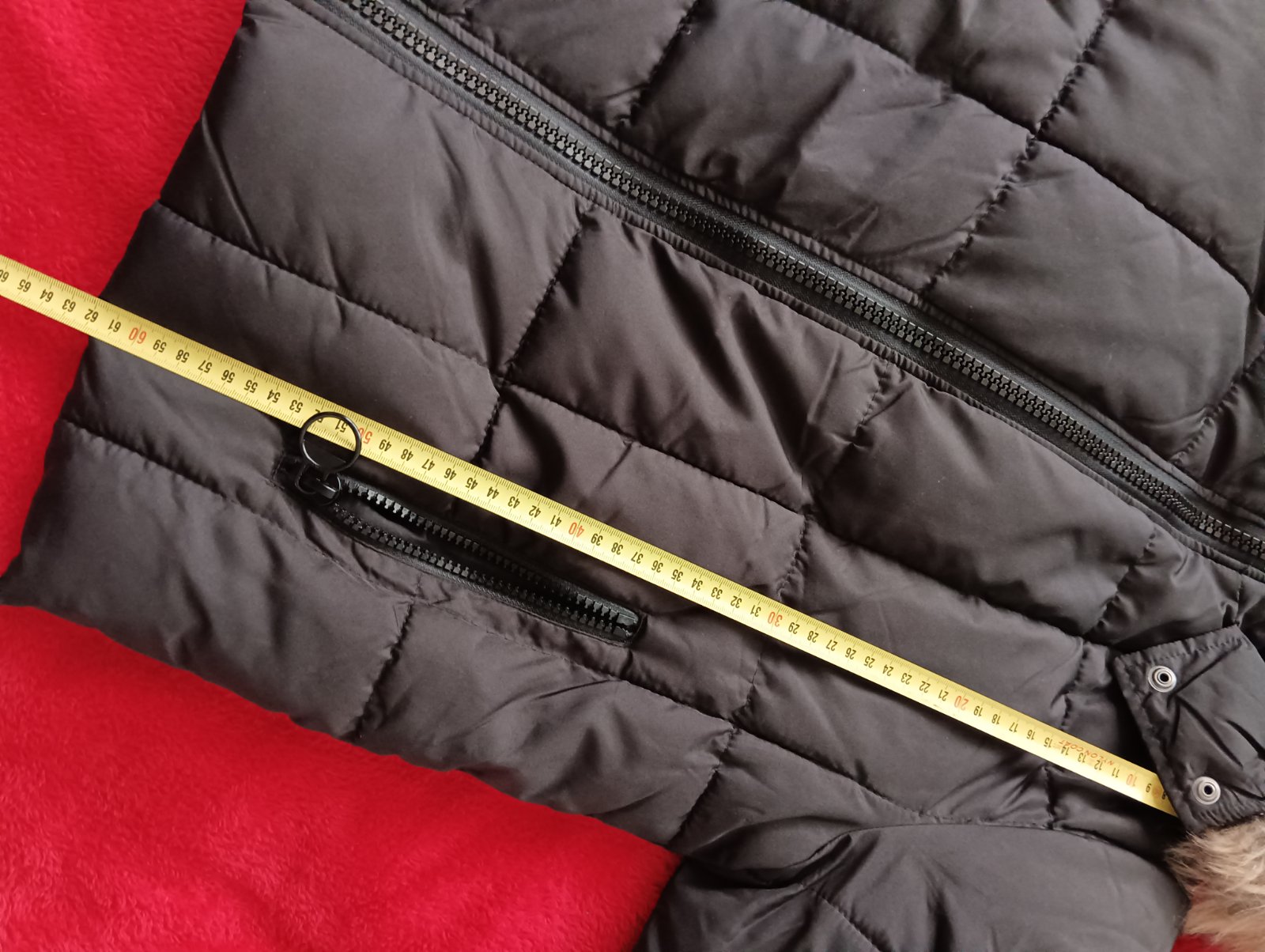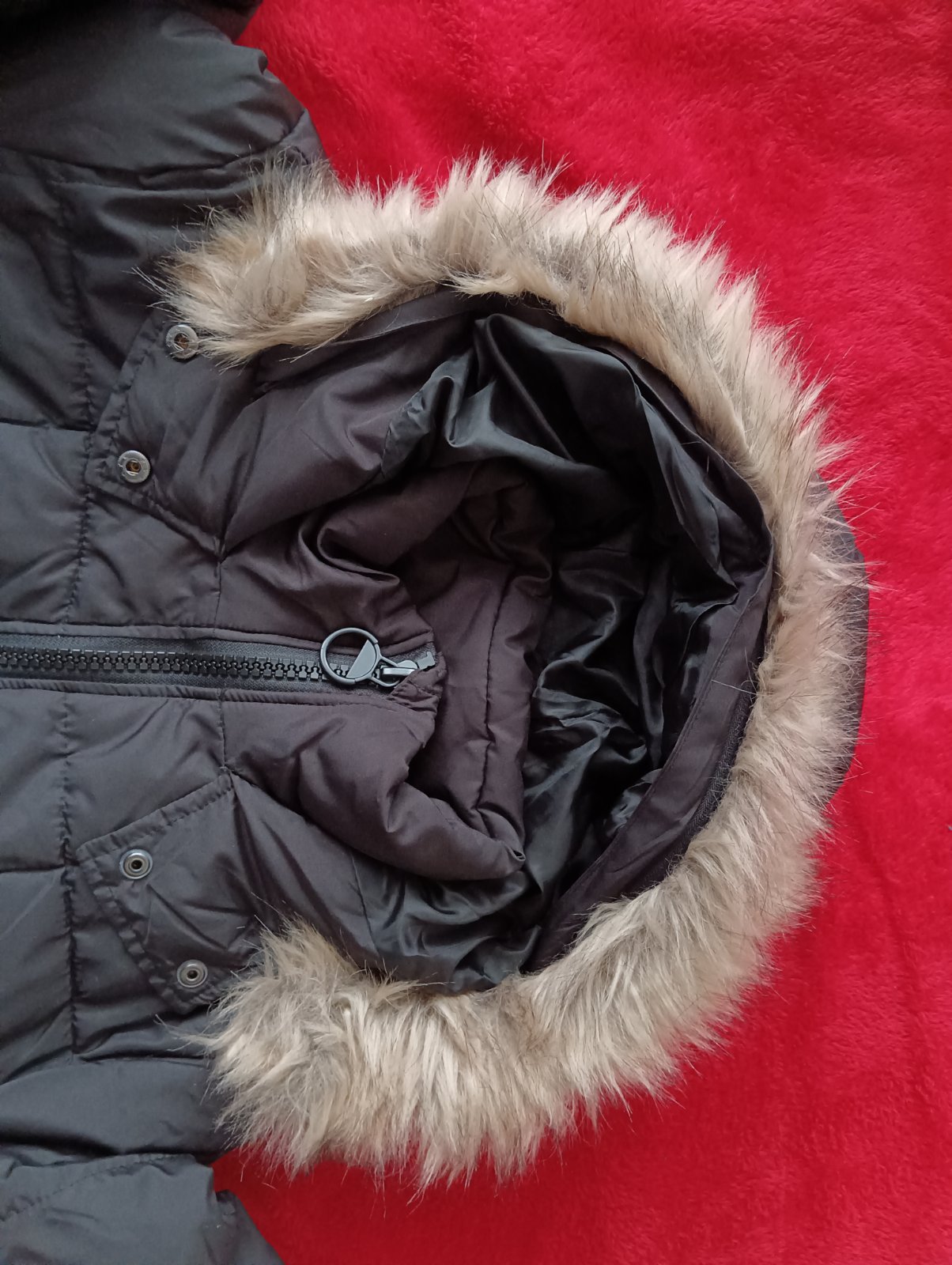 Dámska zimná bunda čiernej farby, s kapucou a odomínateľnou kožisinkou, ozdobné vonkalšie vrecká. Značka C&A, veľkosť písaná L, no podľa mňa menšia. Rozmery- šírka v podpazuší 51 cm, dĺžka od podpa...