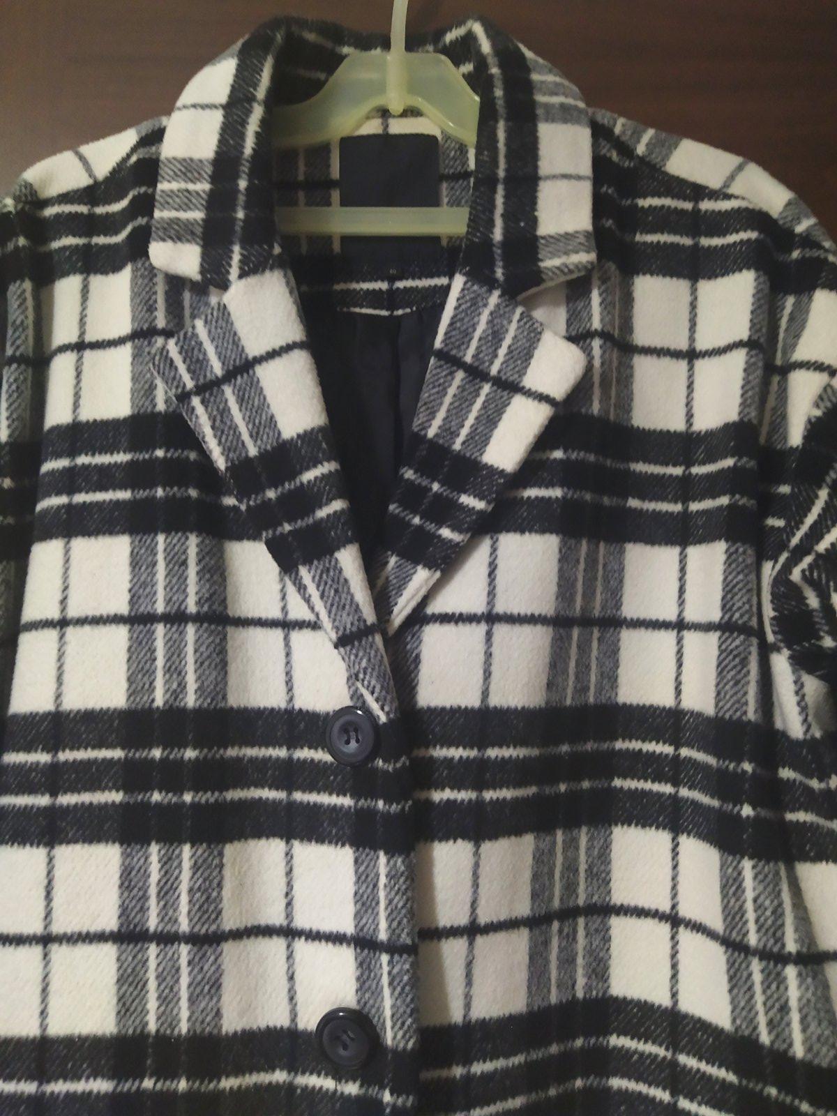 čierne káro na svetlom podklade, podšité čiernou podšívkovinou, veľmi dobrý stav, uv. veľ. 40 dl. 71cm, rukáv od krku 71cm spodný rukáv 39cm šírka pod pazuchami v kľude 46x2