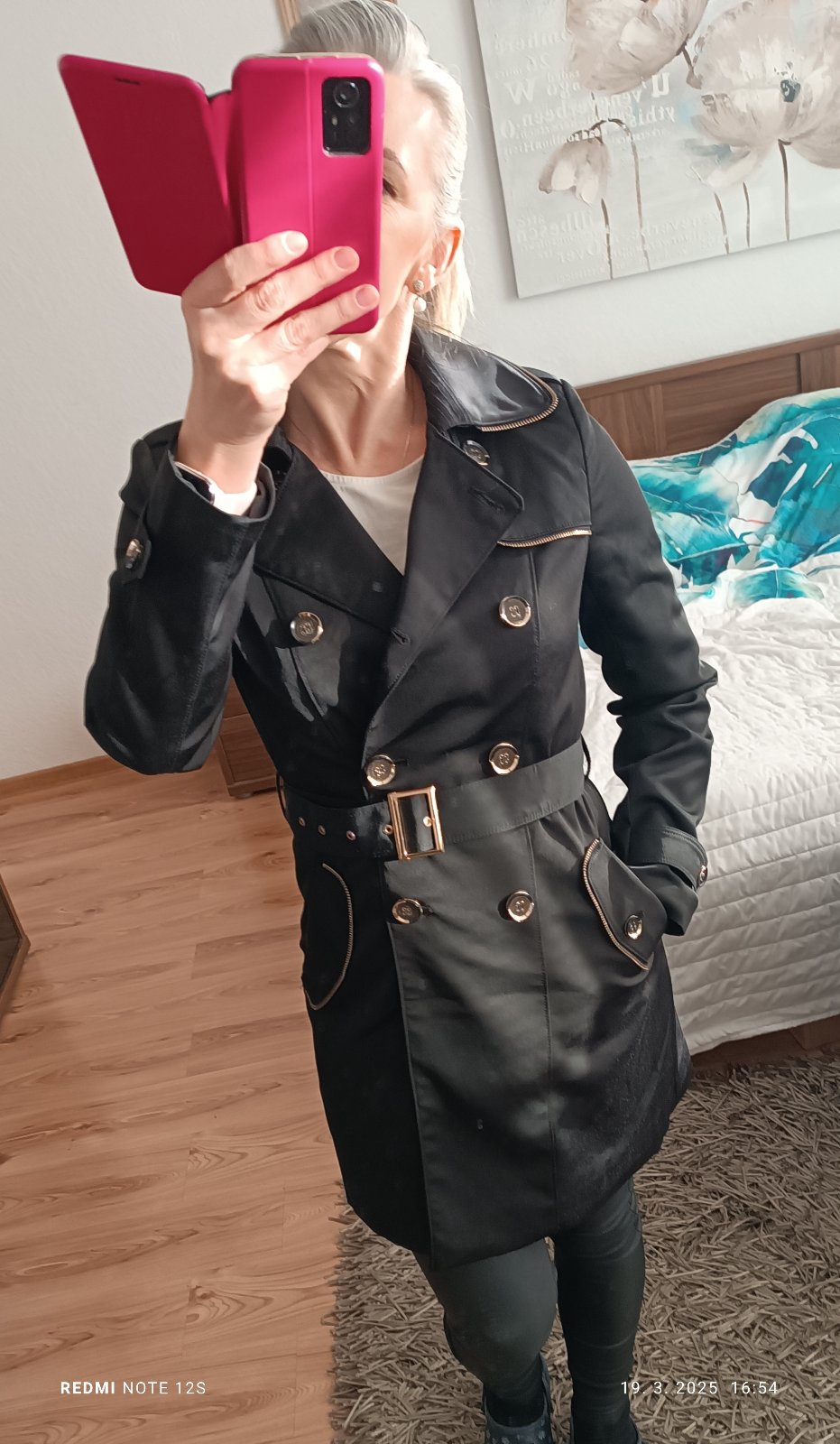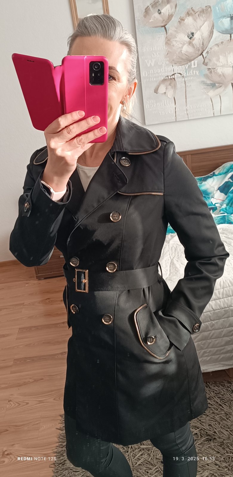 Trenčkot je nosený málo,bez akýchkoľvek poškodení, pekne prepracovaný so zlatými doplnkami. Farba sýta čierna. dĺžka 87 CM, rukáv od ramena 63 , šírka pod pazuchami 45 cm.