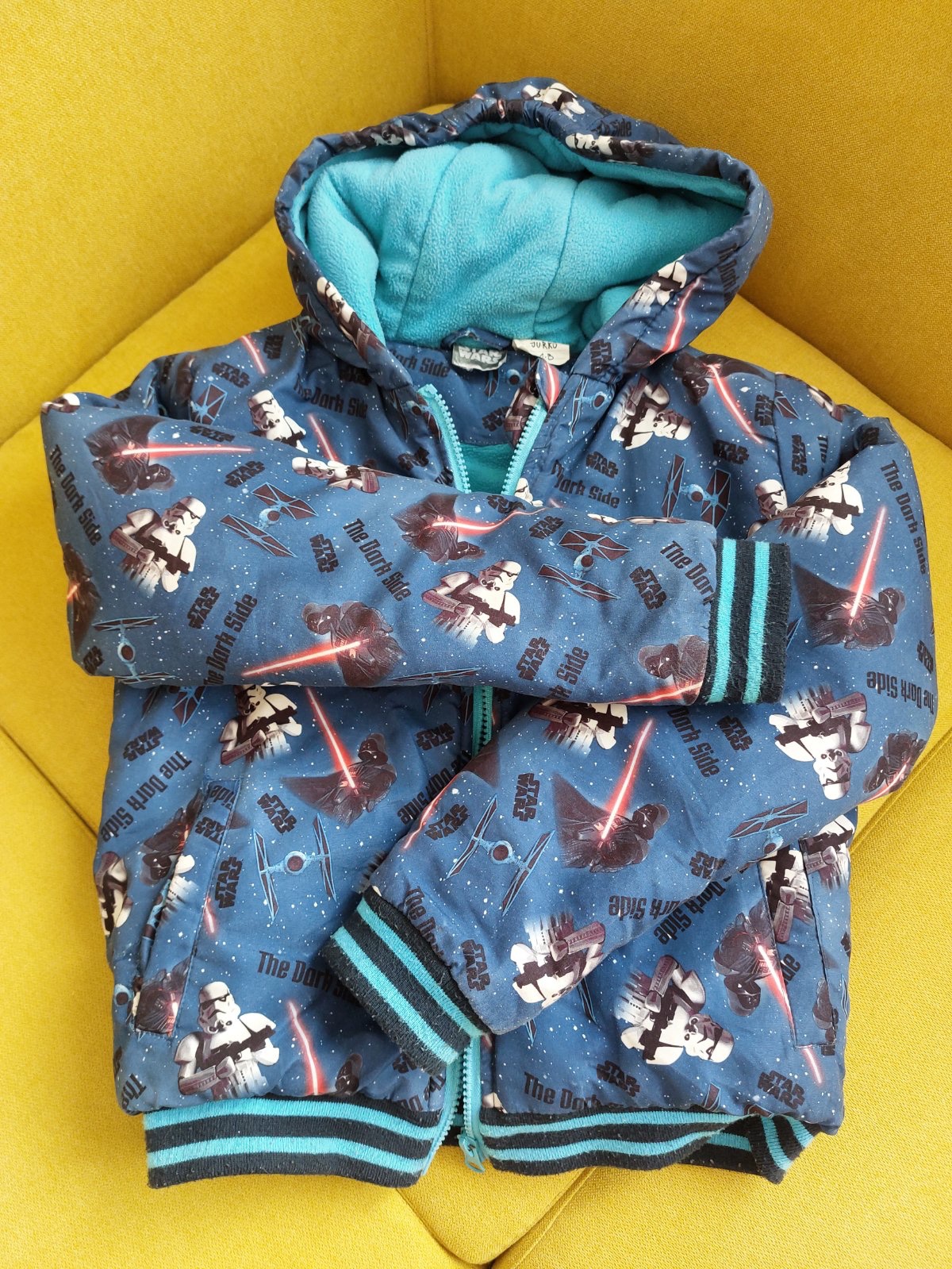 Bunda podsita flisom, kludne aj na teplejsiu zimu, u nas velmi oblubena. Velkostne 6-7rokov, motiv Star wars.