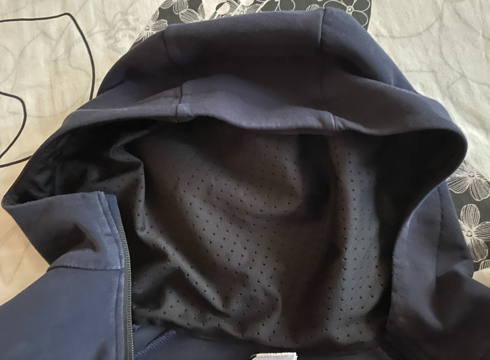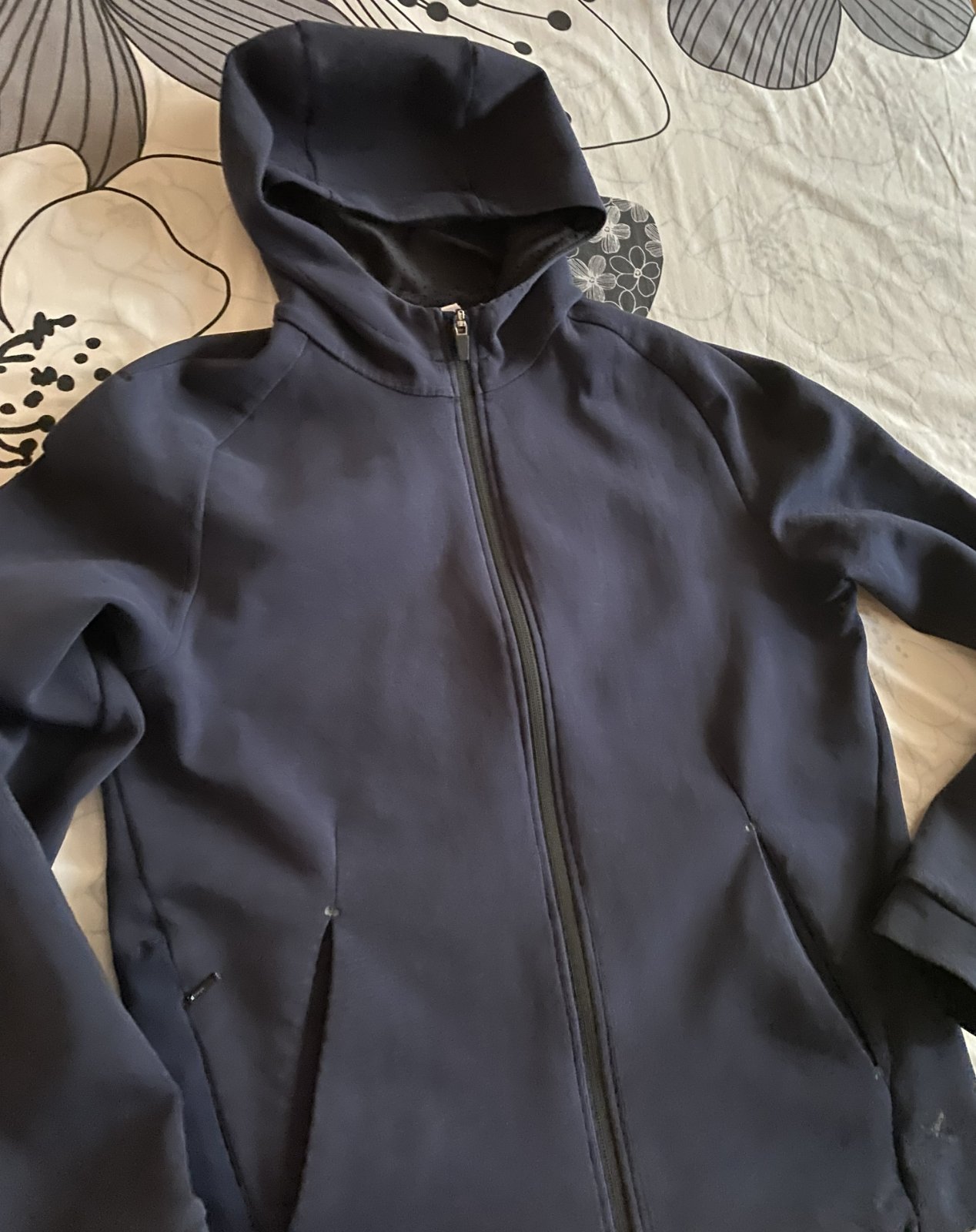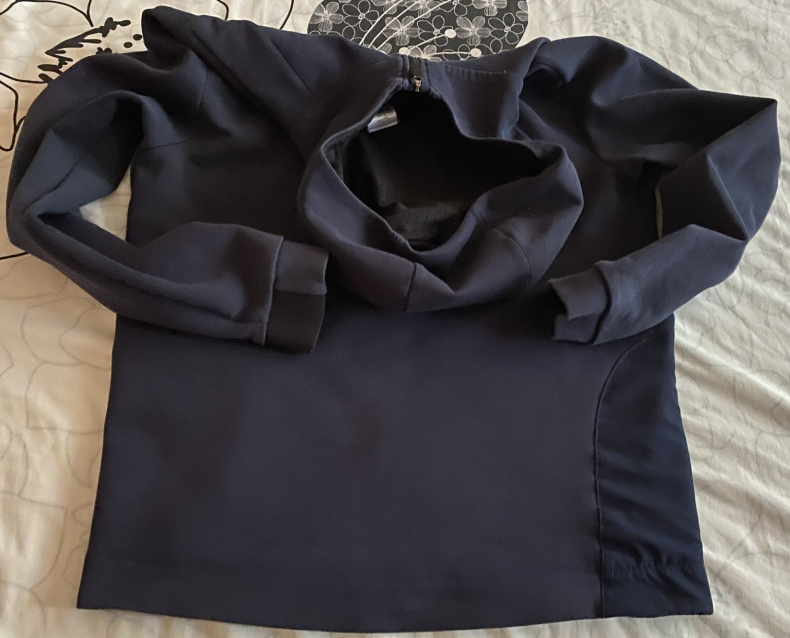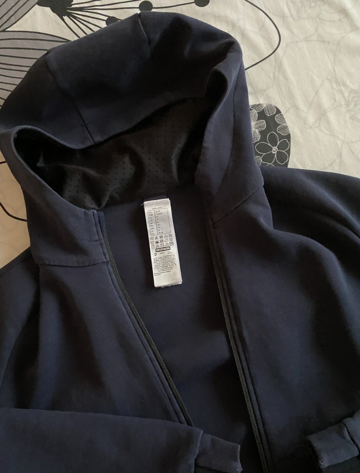 Športová bunda s kapucou Decathlon v. M, kupovaná nová, nosená na striedačku s inými, kvalitne prepracovaná, kopa pekných funkčných detailov, kapucka podšitá, vpredu zapínanie na zips s krytím krku, vpredu 2 vrecká + na boku vrecko so zipsom, odvetrávanie pod pazuchami, pekná nevypratá tmavomodrá farba - niektoré foto osvietené, materiál 86% polyester, 14% elastan je pružná, všade povolí. Miery: dĺžka od kapucky dolu: 65cm, šírka v podpazuší: 51cmx2, rukáv od kapucky vrátane dolnému lemu pružného lemu: 76cm