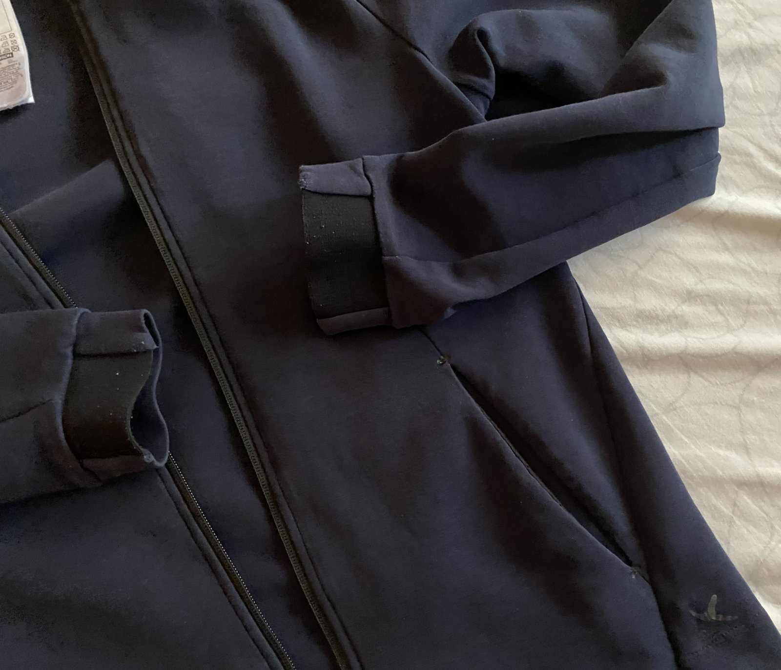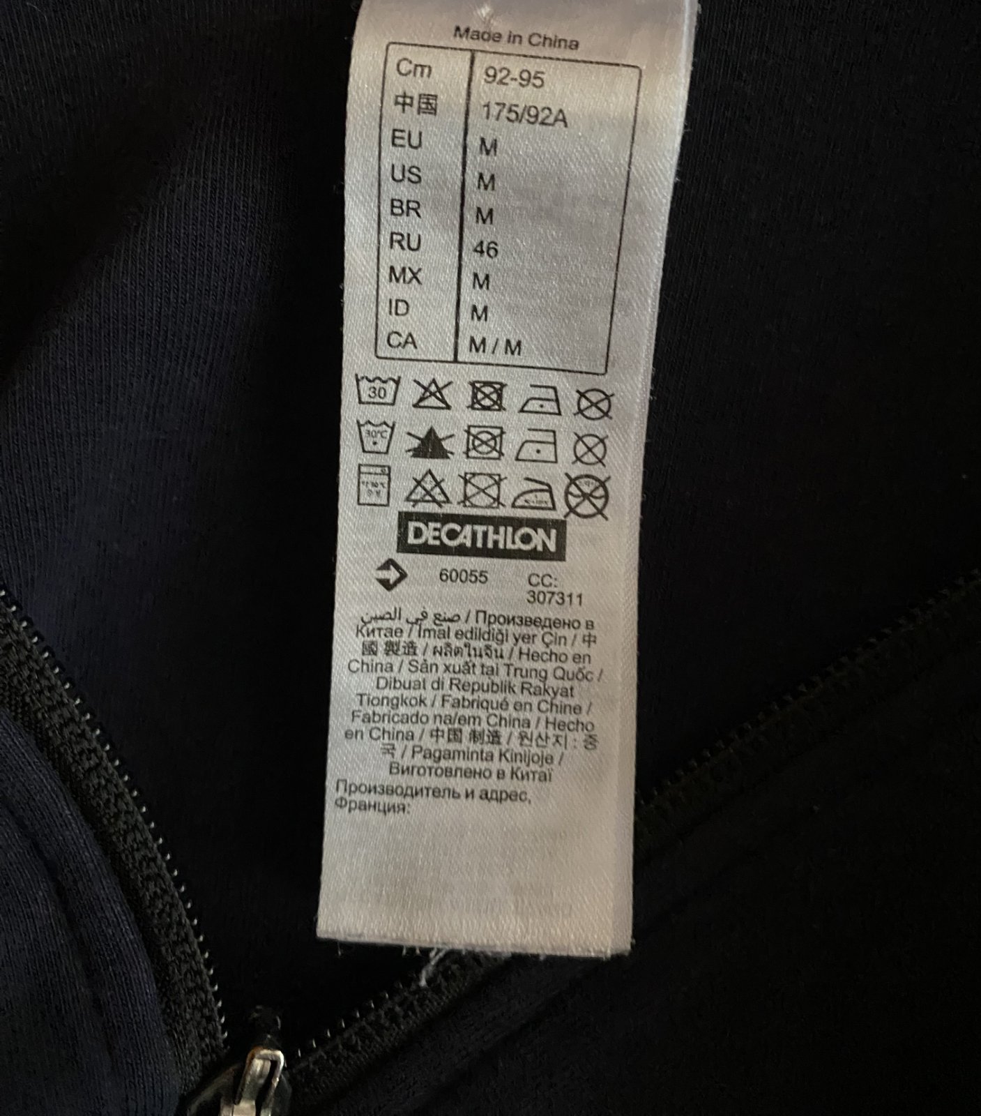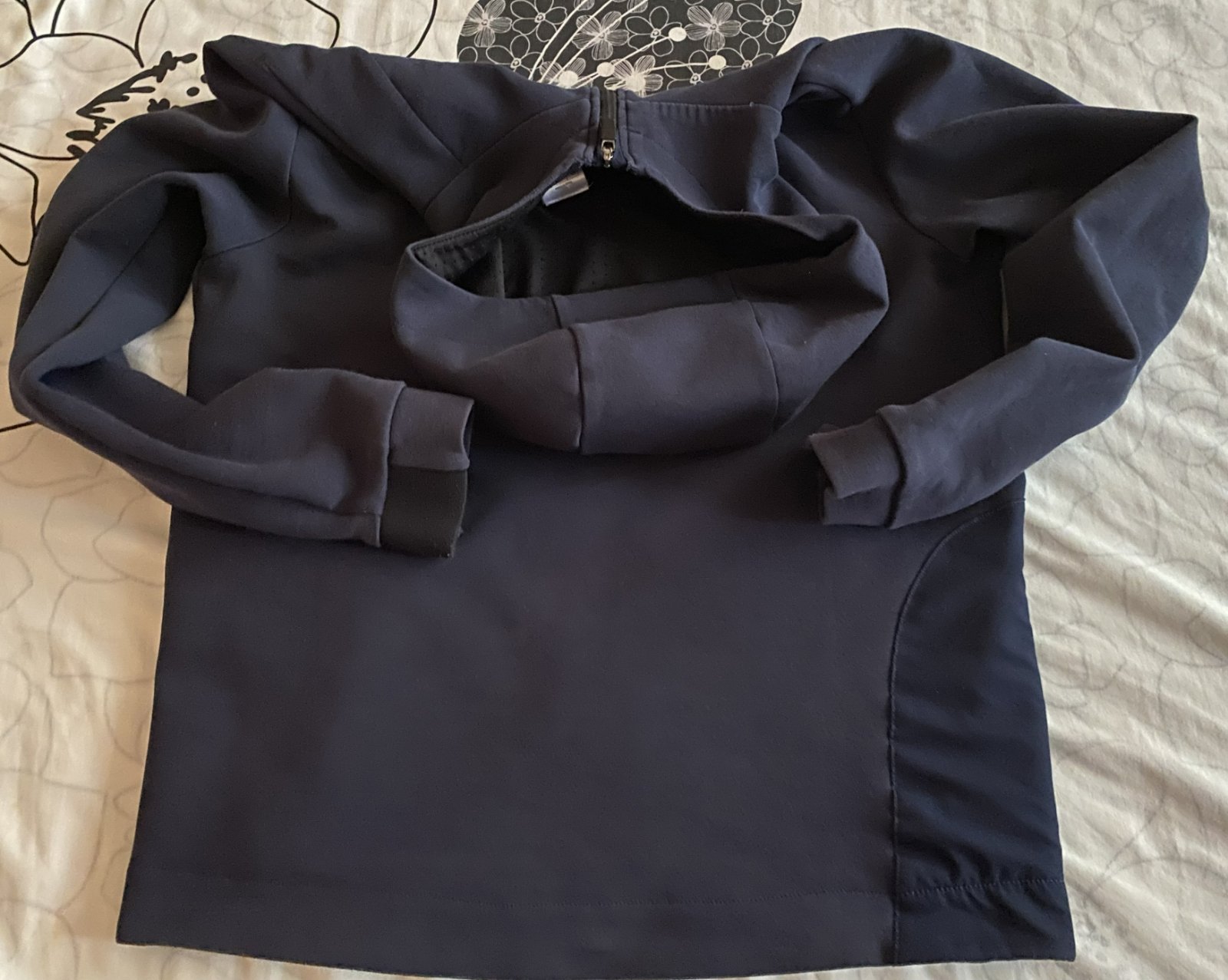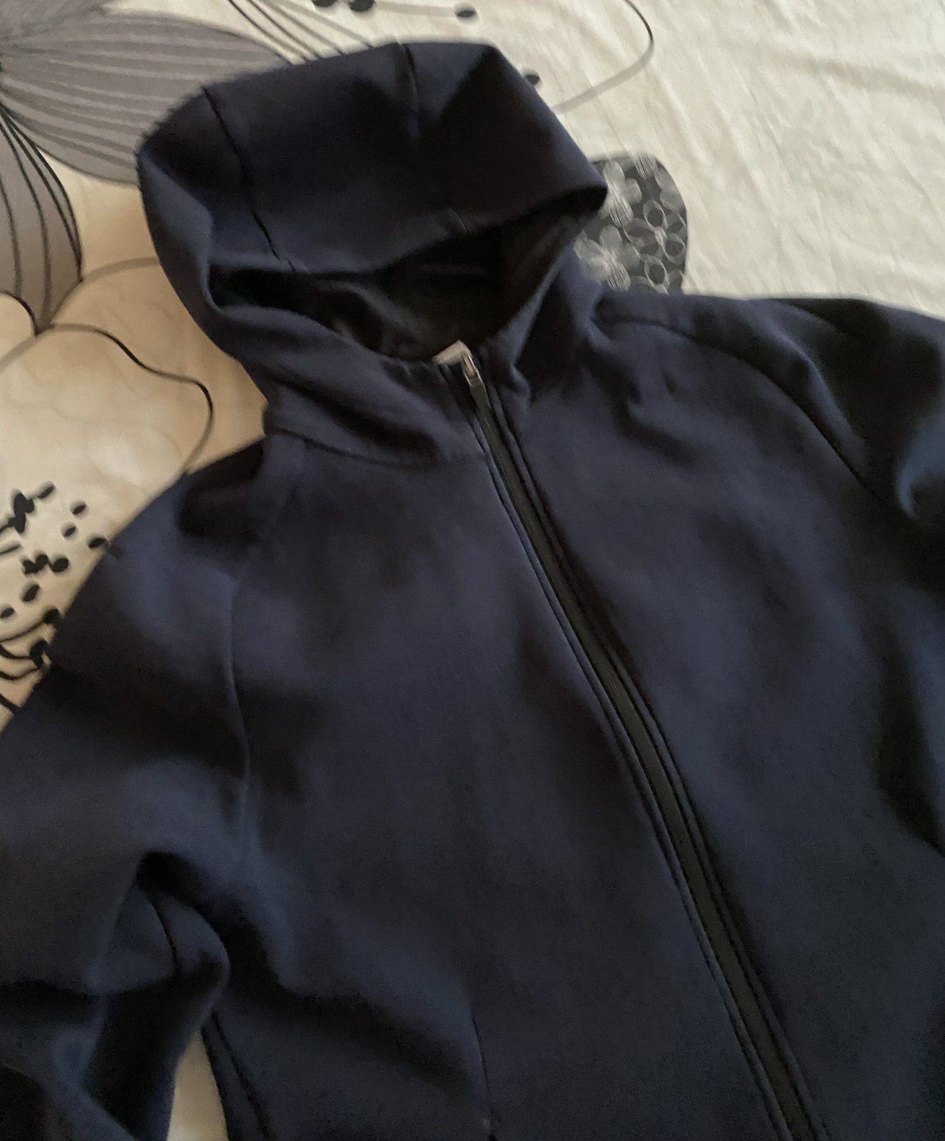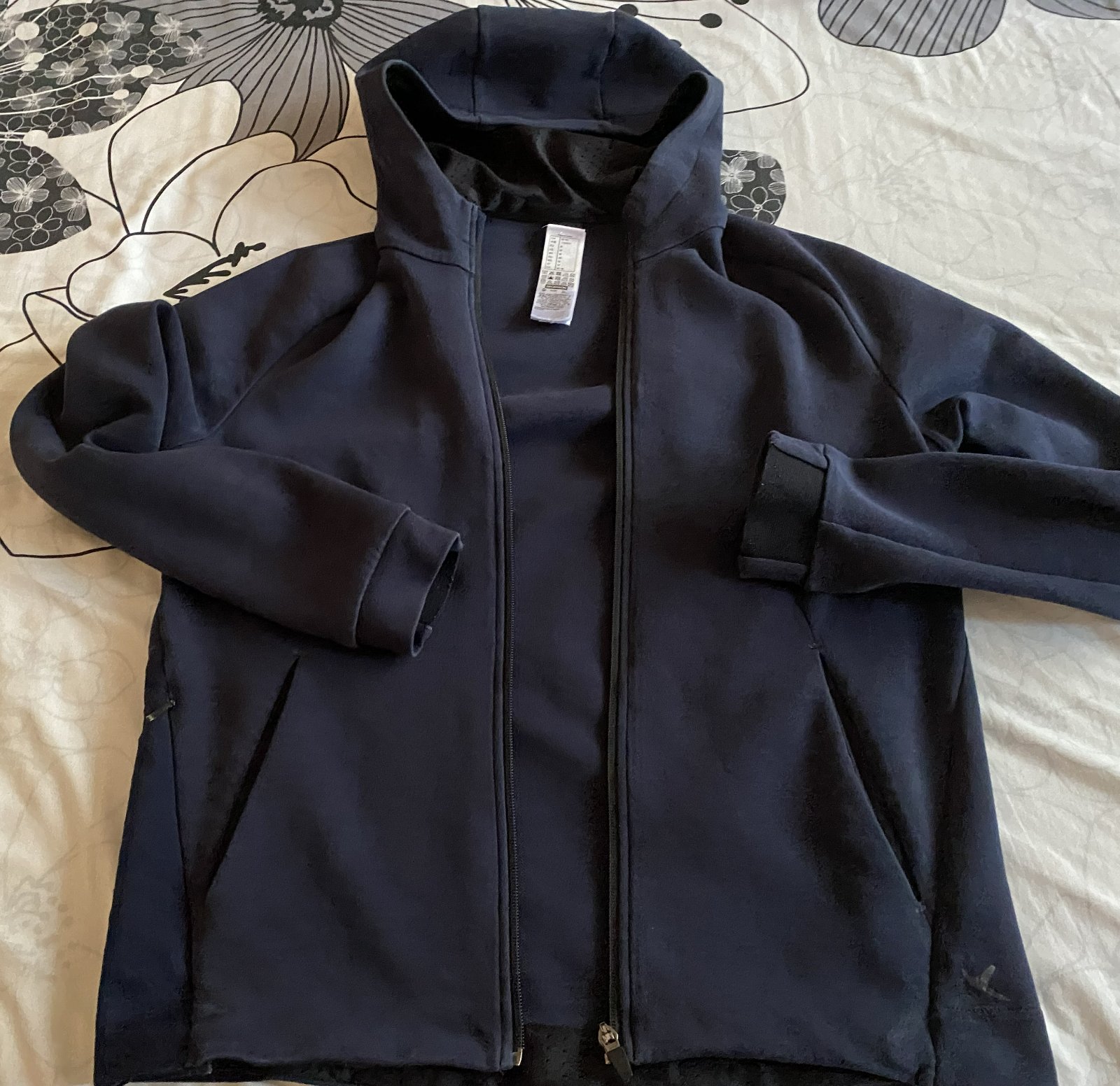 Športová bunda s kapucou Decathlon v. M, kupovaná nová, nosená na striedačku s inými, kvalitne prepracovaná, kopa pekných funkčných detailov, kapucka podšitá, vpredu zapínanie na zips s krytím krku, vpredu 2 vrecká + na boku vrecko so zipsom, odvetrávanie pod pazuchami, pekná nevypratá tmavomodrá farba - niektoré foto osvietené, materiál 86% polyester, 14% elastan je pružná, všade povolí. Miery: dĺžka od kapucky dolu: 65cm, šírka v podpazuší: 51cmx2, rukáv od kapucky vrátane dolnému lemu pružného lemu: 76cm