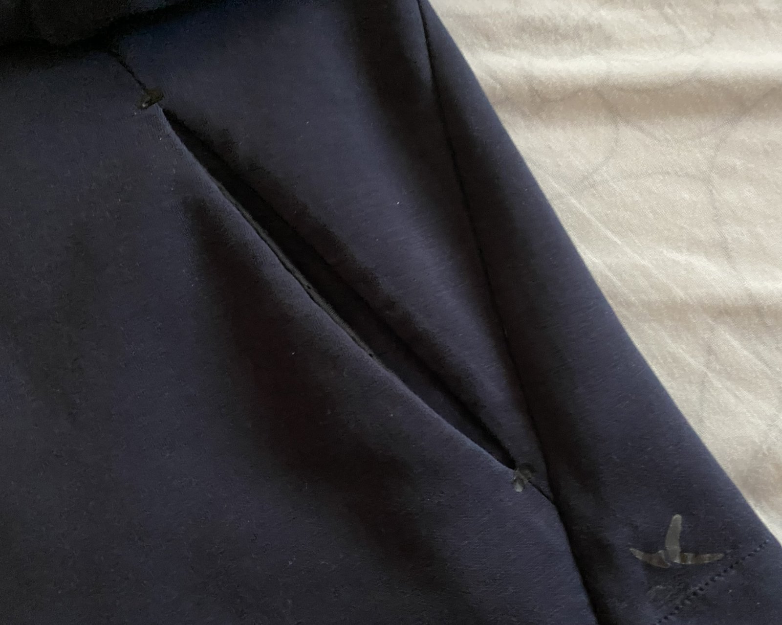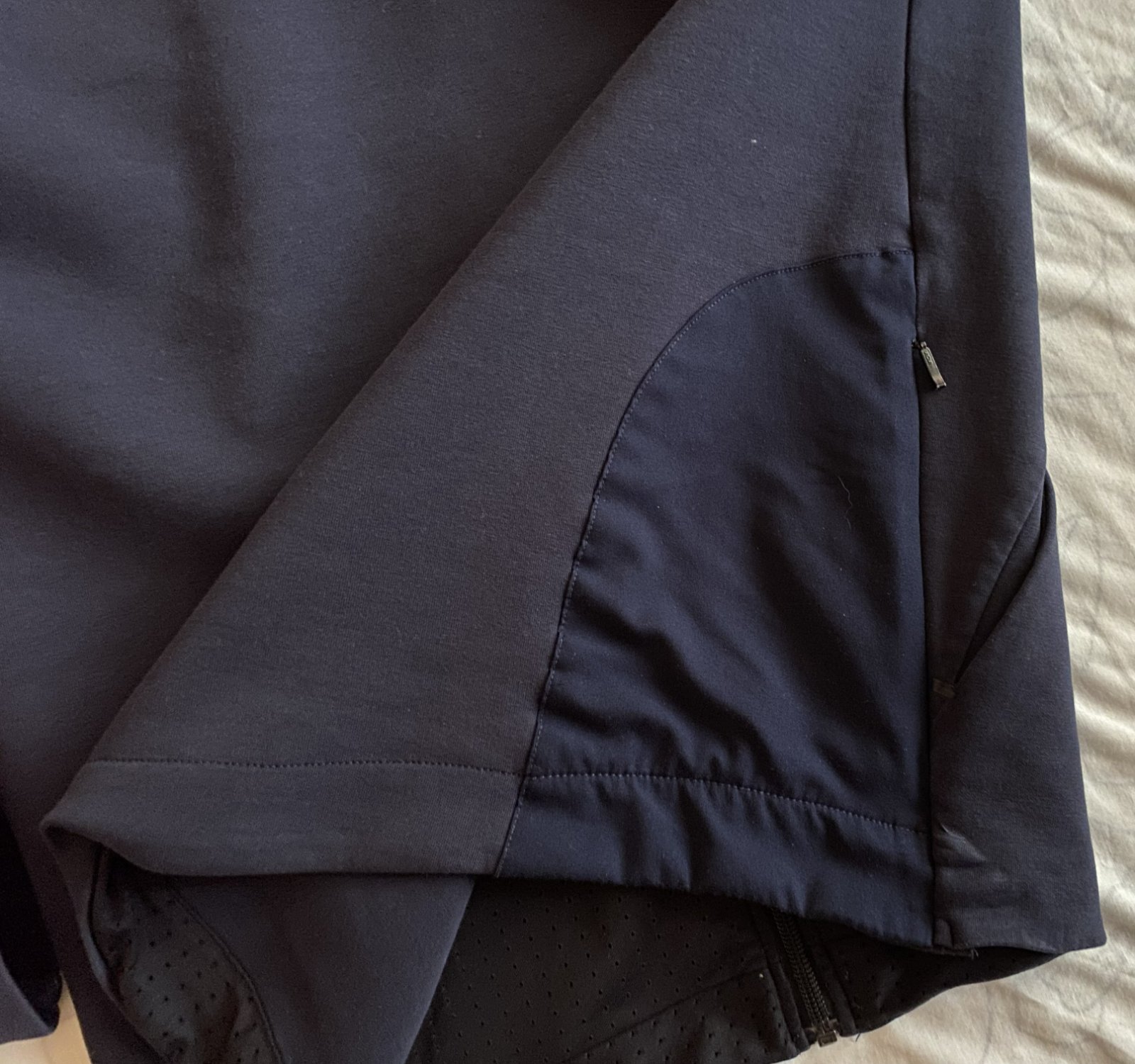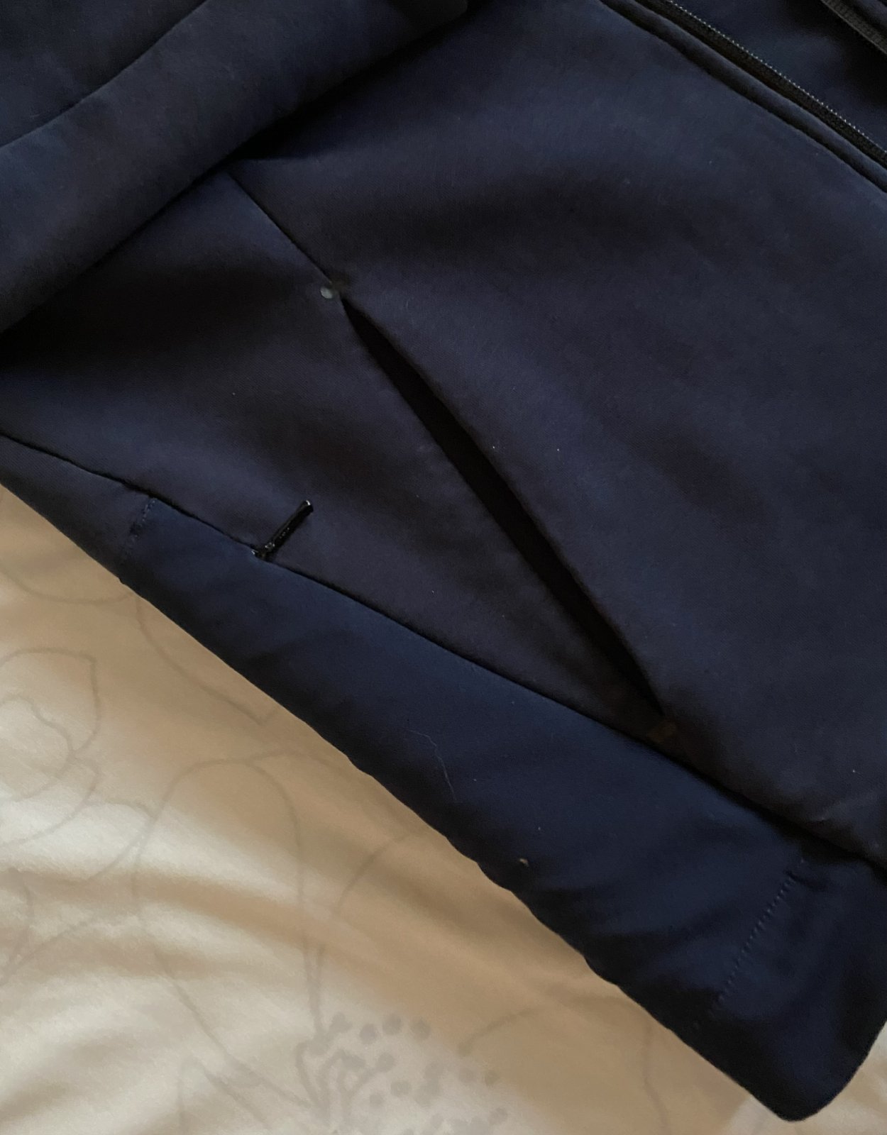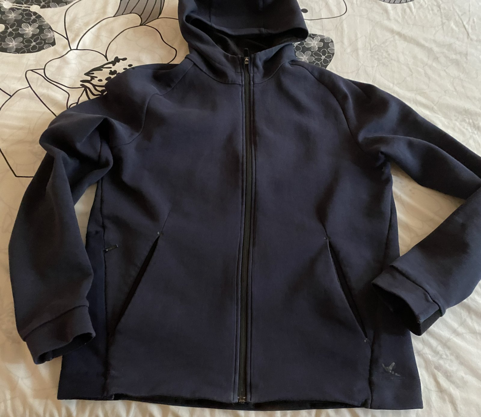 Športová bunda s kapucou Decathlon v. M, kupovaná nová, nosená na striedačku s inými, kvalitne prepracovaná, kopa pekných funkčných detailov, kapucka podšitá, vpredu zapínanie na zips s krytím krku, vpredu 2 vrecká + na boku vrecko so zipsom, odvetrávanie pod pazuchami, pekná nevypratá tmavomodrá farba - niektoré foto osvietené, materiál 86% polyester, 14% elastan je pružná, všade povolí. Miery: dĺžka od kapucky dolu: 65cm, šírka v podpazuší: 51cmx2, rukáv od kapucky vrátane dolnému lemu pružného lemu: 76cm