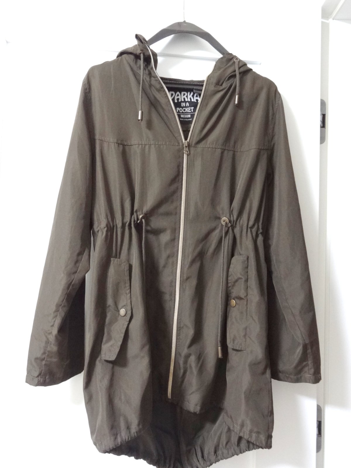 Dámska vetrovka/bunda...ľahká na jar/leto/jeseň ... s vreckami, s kapucou...v páse sa dá stiahnuť... veľmi dobrý stav... značka: PARKA... veľ. M/L ...dlžka 75 cm, šírka pod pazuchami 53 cm, šírka pás 49 cm