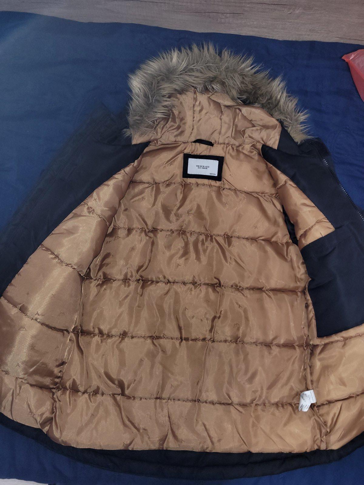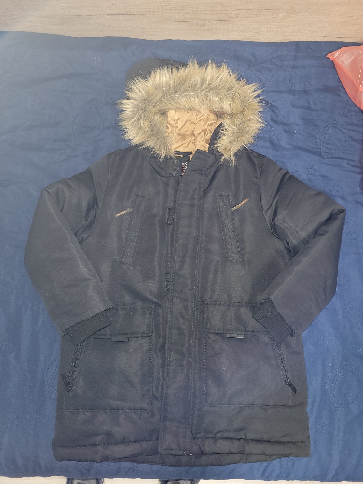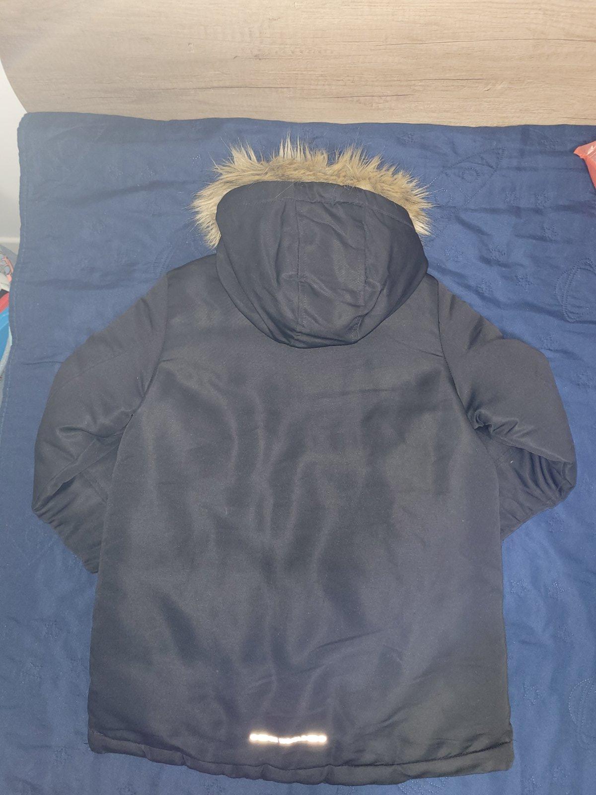 Krásna,tepla,predĺžená chlapčenská bunda na zimu.Veľka kapucňa.Nosená jednu zimu.