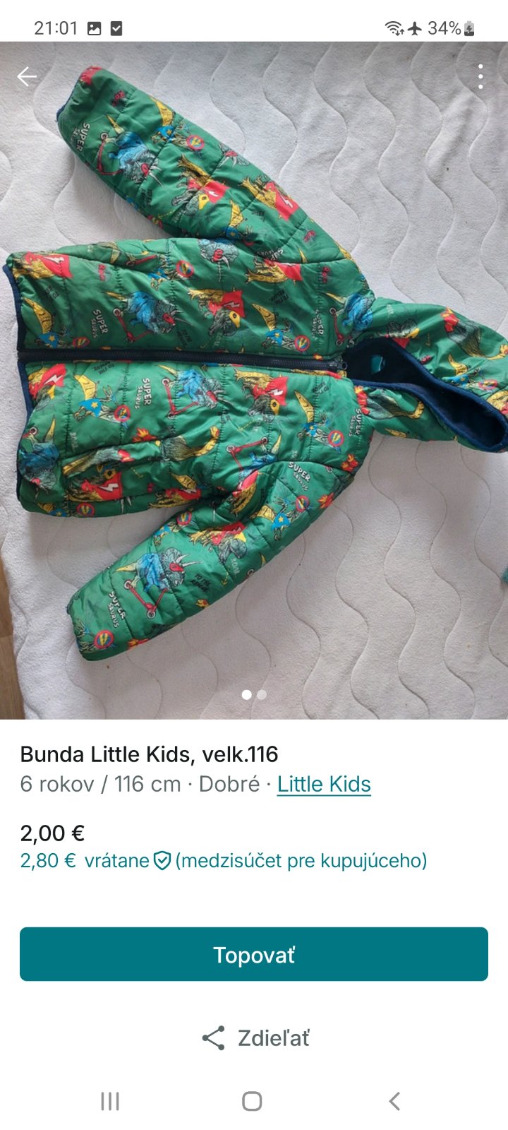Zimná bunda s dinosaurami. Bez poškodenia