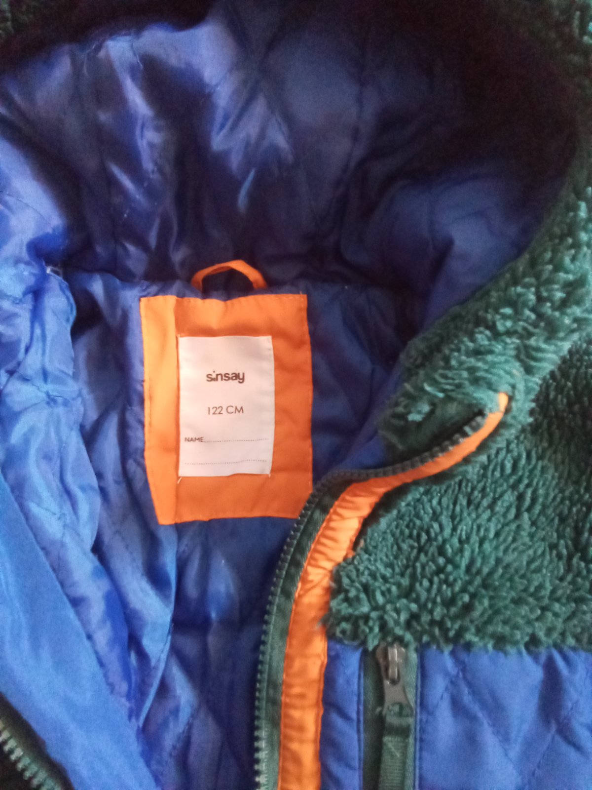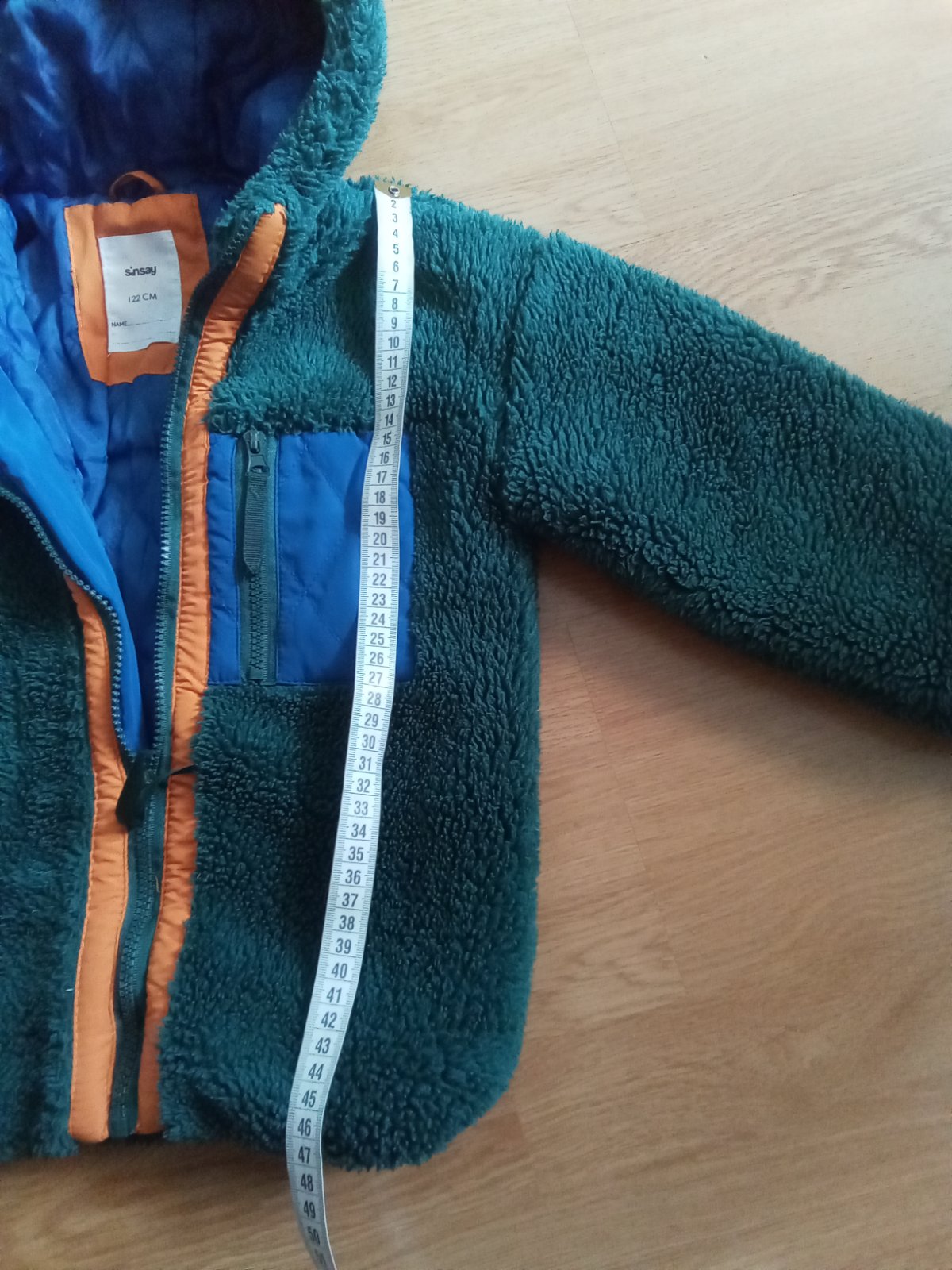 Nosená v dobrom stave. Piše 122, ale sedí na veľ. 116 ..dlžka od pleca 46cm, rukáv od krku 47cm, širka 2x40cm