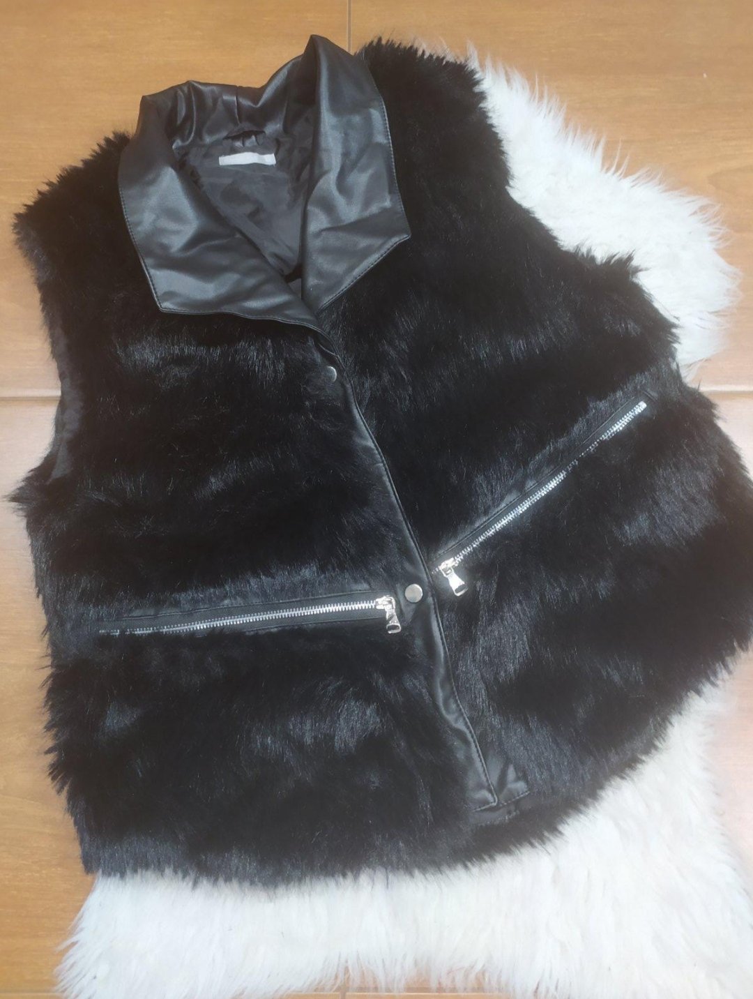 Krásna kožušinova vesta,doplnená koženkou.Je v top stave ,zapínanie na patenty,vpredu vrecká .