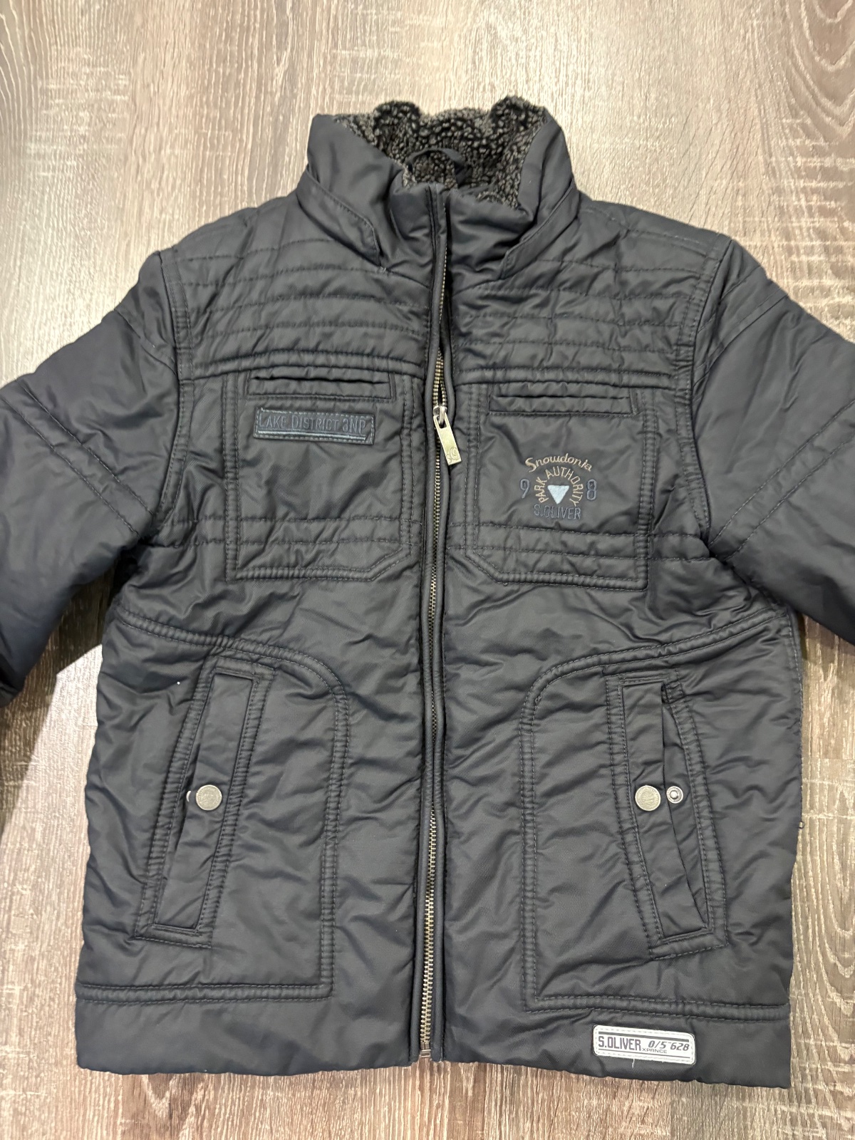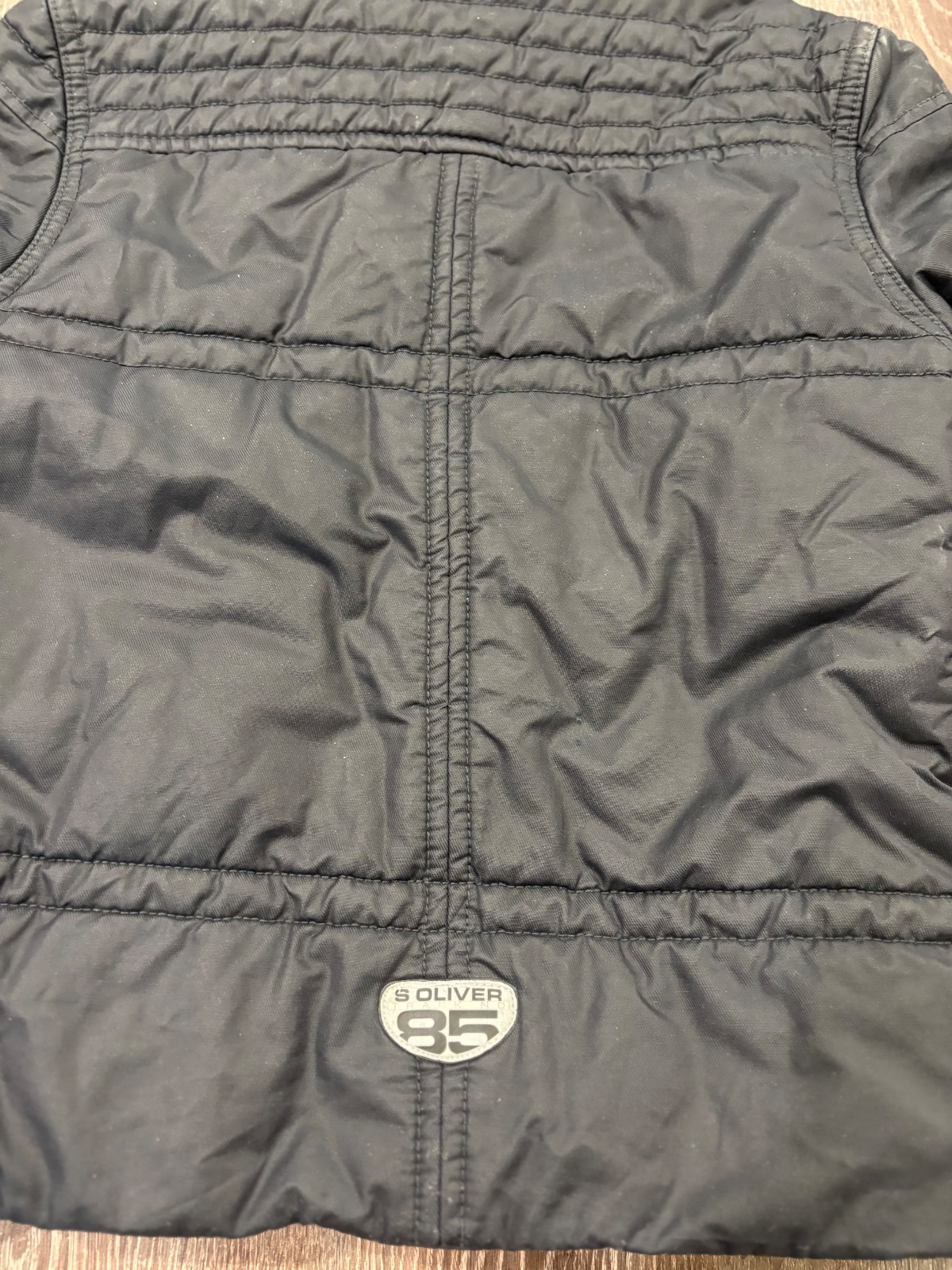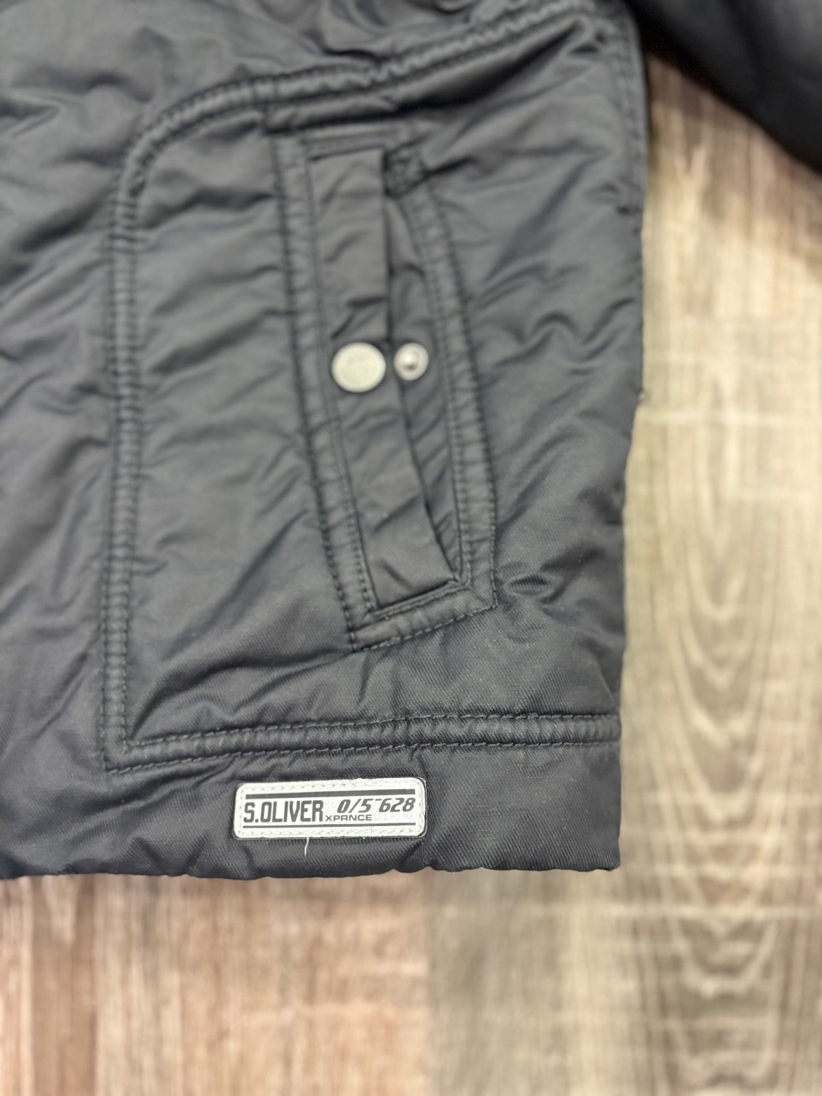 S.Oliver štylova chlapcenska vetrovka na prechodne obdobie,velkost 128/134,tmavosiva farba.Dlzka je 56cm,dlzka rukava od krku je 60cm a sirka v podpazusi je 43x2cm.Vzadu na chrbte 2 male bodky