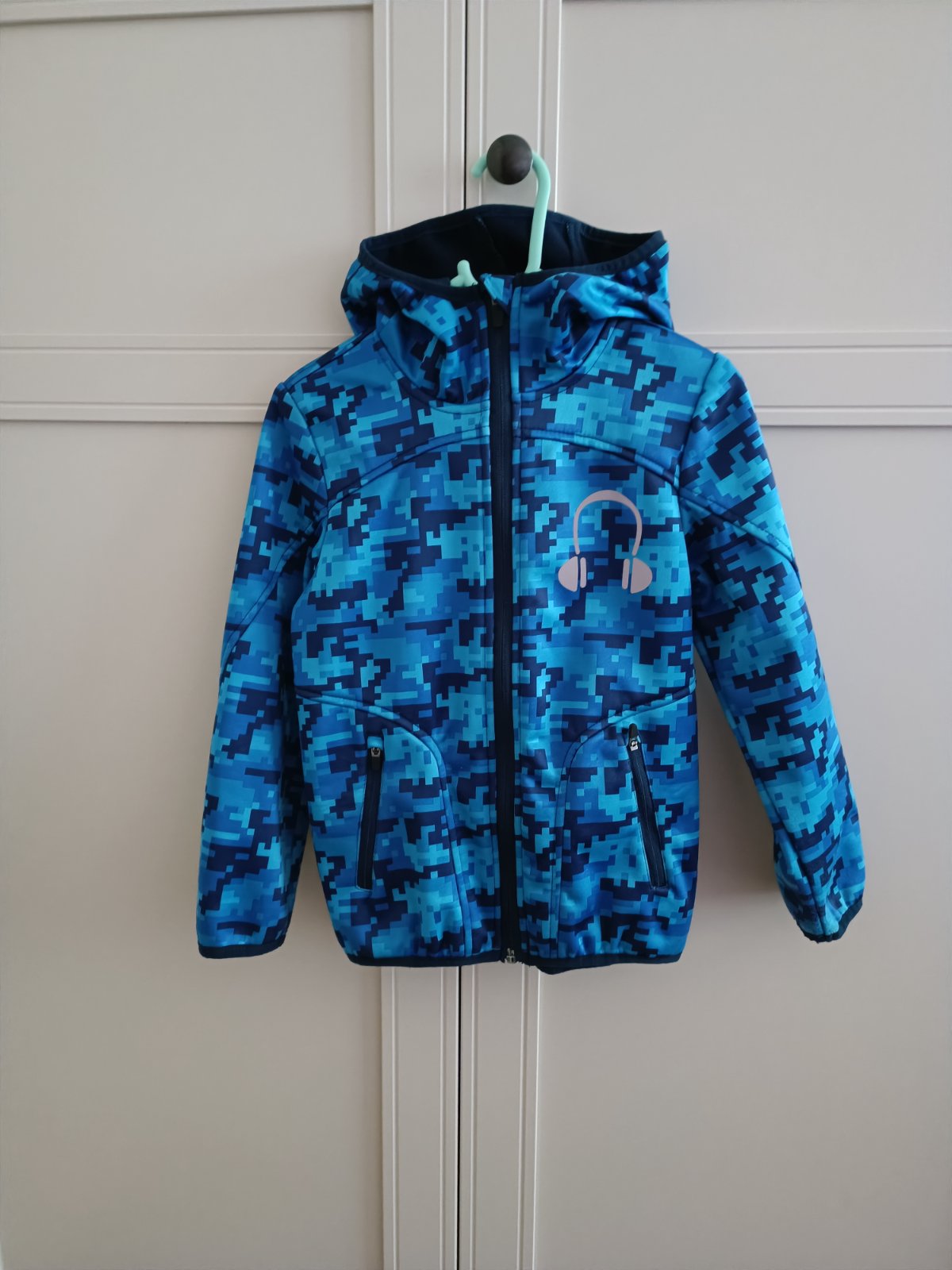 Posúvam softshellovú bundu. Synova obľúbená, vynosil ju pomerne dlho. Zvnútra mierne žmolky, trošku ošuchnuté rukávy, reflexné prvky. Všetko v galérii. Verím, že ešte poslúži. Sedí na užšiu, vyššiu...