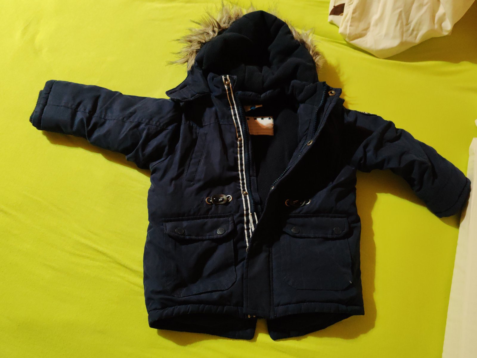 Predam detsku zimnu bundu v jazdeckom style znacky Mayoral velkost 104, vnutro prijemna mäkkučka kožušinka ,kapucňa na zips. Na jednom mieste na zadnej strane je krajčirkou zašita mini dierka/nafot...