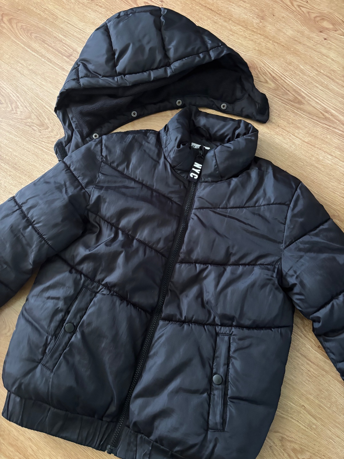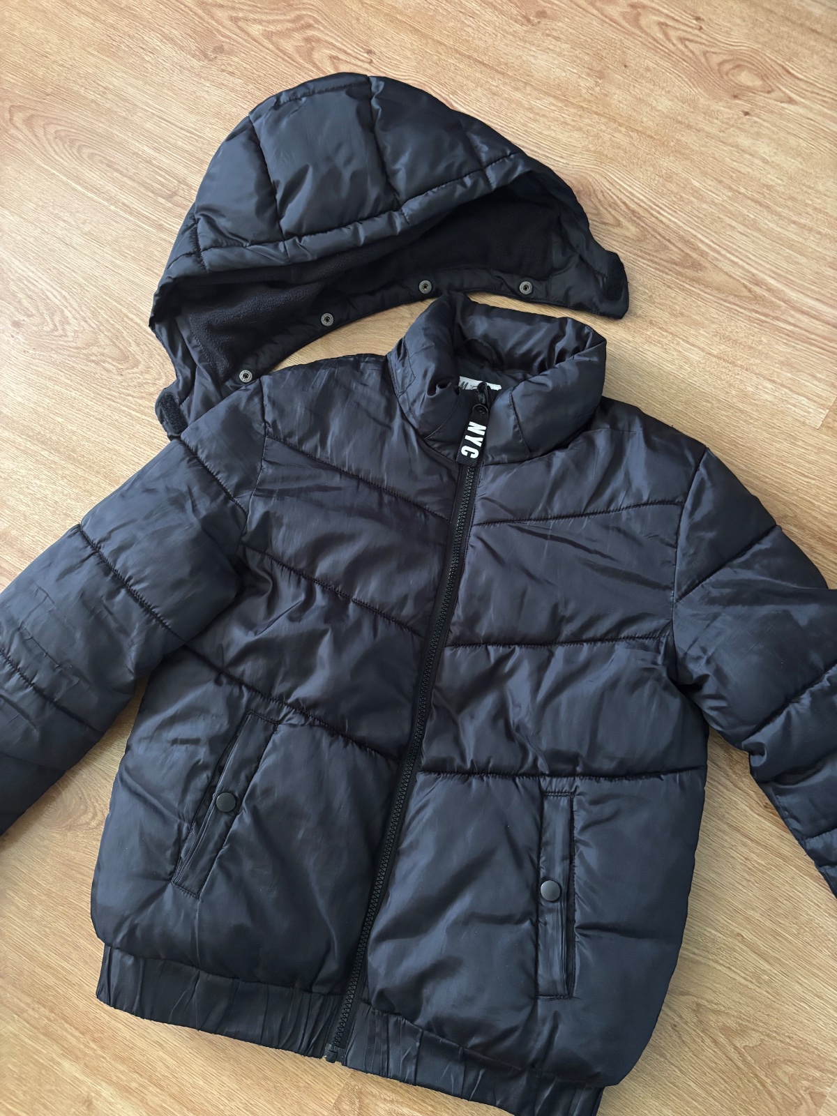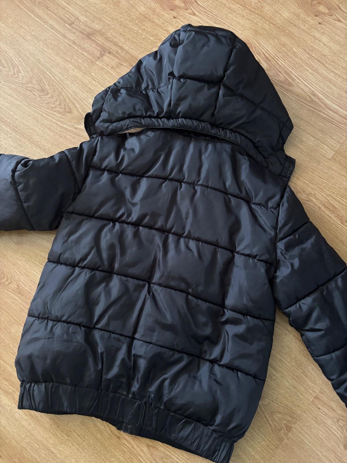 Krátka zimná bunda s odopínateľnou kapucňou, dĺžka 59 cm, rukáv od krku 72 cm, jemné poškodenie na rukáve, viď. foto