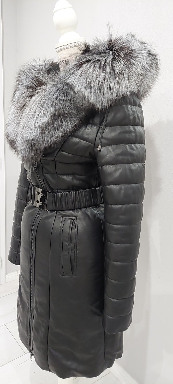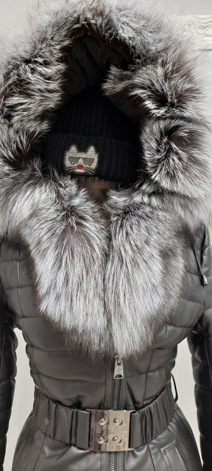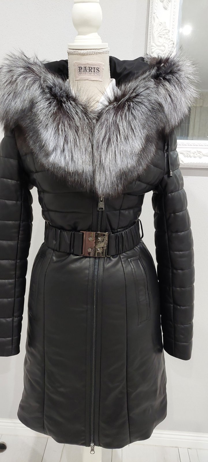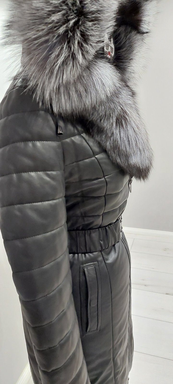 Čierna bunda z ekokože s kožušinou na golieri a rukávoch je nádherný model, ktorý je ozdobený cvokmi, ale zapína sa na vnútorný zips. Kožušina na golieri a rukávoch je výrazná a bunde dodáva luxusn...