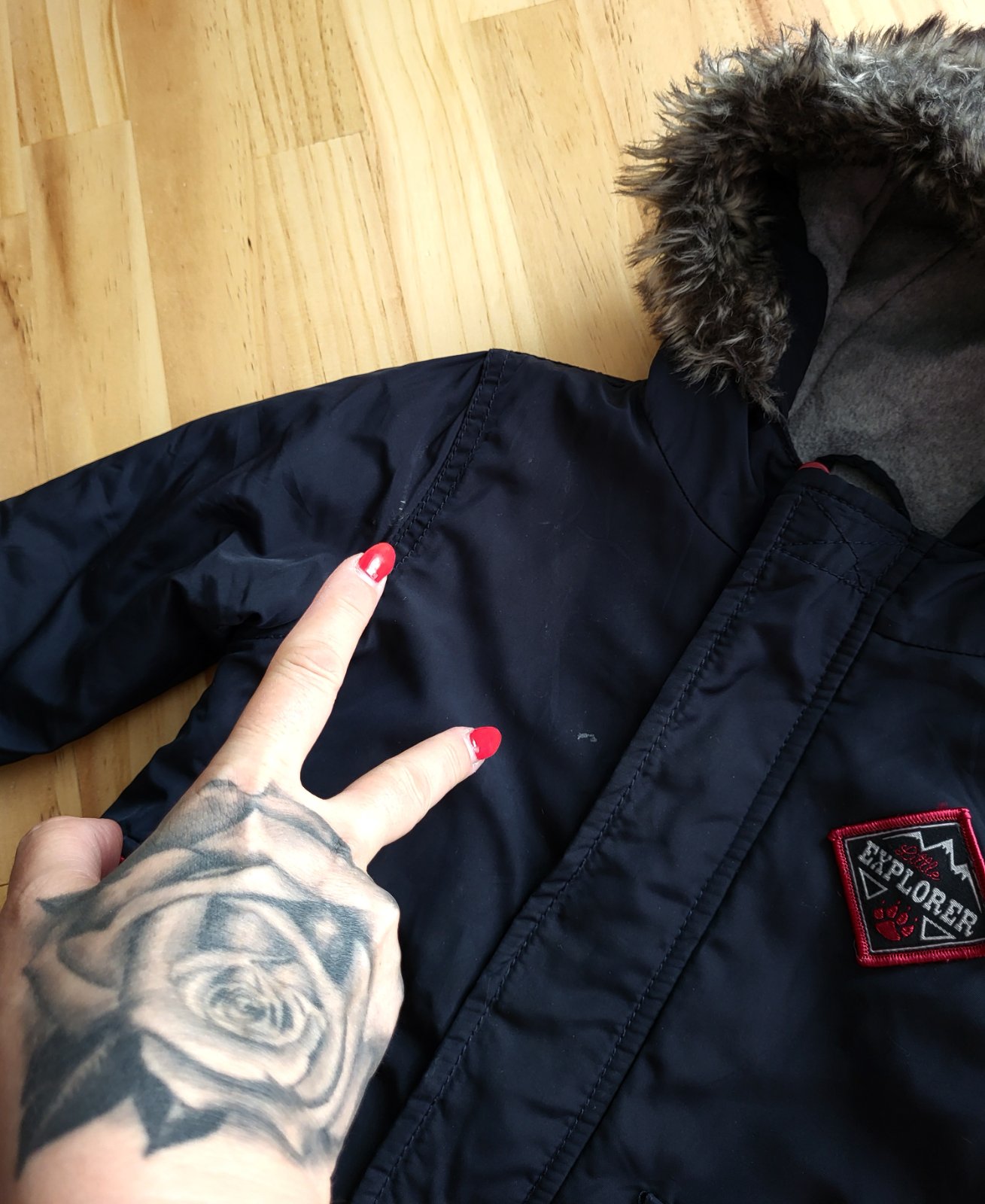 veľmi dobrý stav, konce rukávov so všitým elastickým patentom ktorý má žmolky, fliačiky na tele bundy pri zipse, pri ramene a väčší zozadu na konci rukáva, predné vačky na príklop na suchý zips, na pohľad veľmi pekná, poštovné doporučene 3,50 €