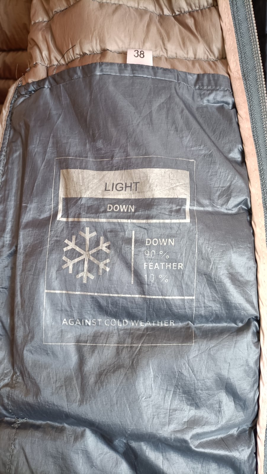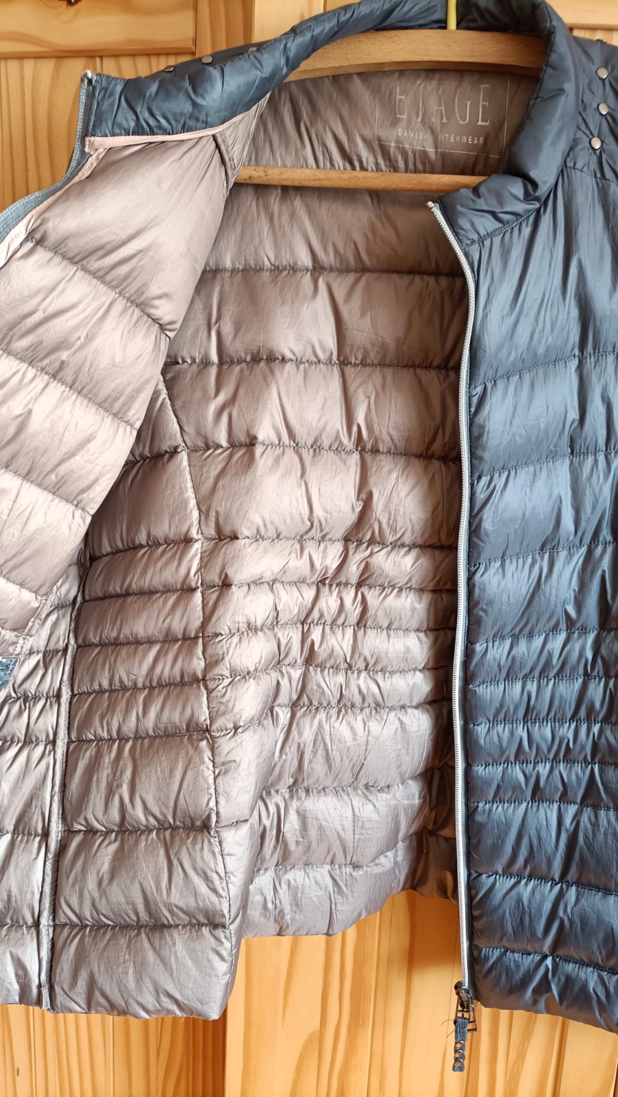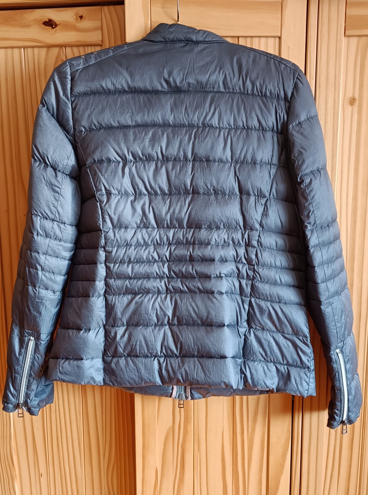 Lahučká páperová bunda (výplň - skutočné páperie) sivomodrej farby, bez kapucne. Veľmi pekný stav.