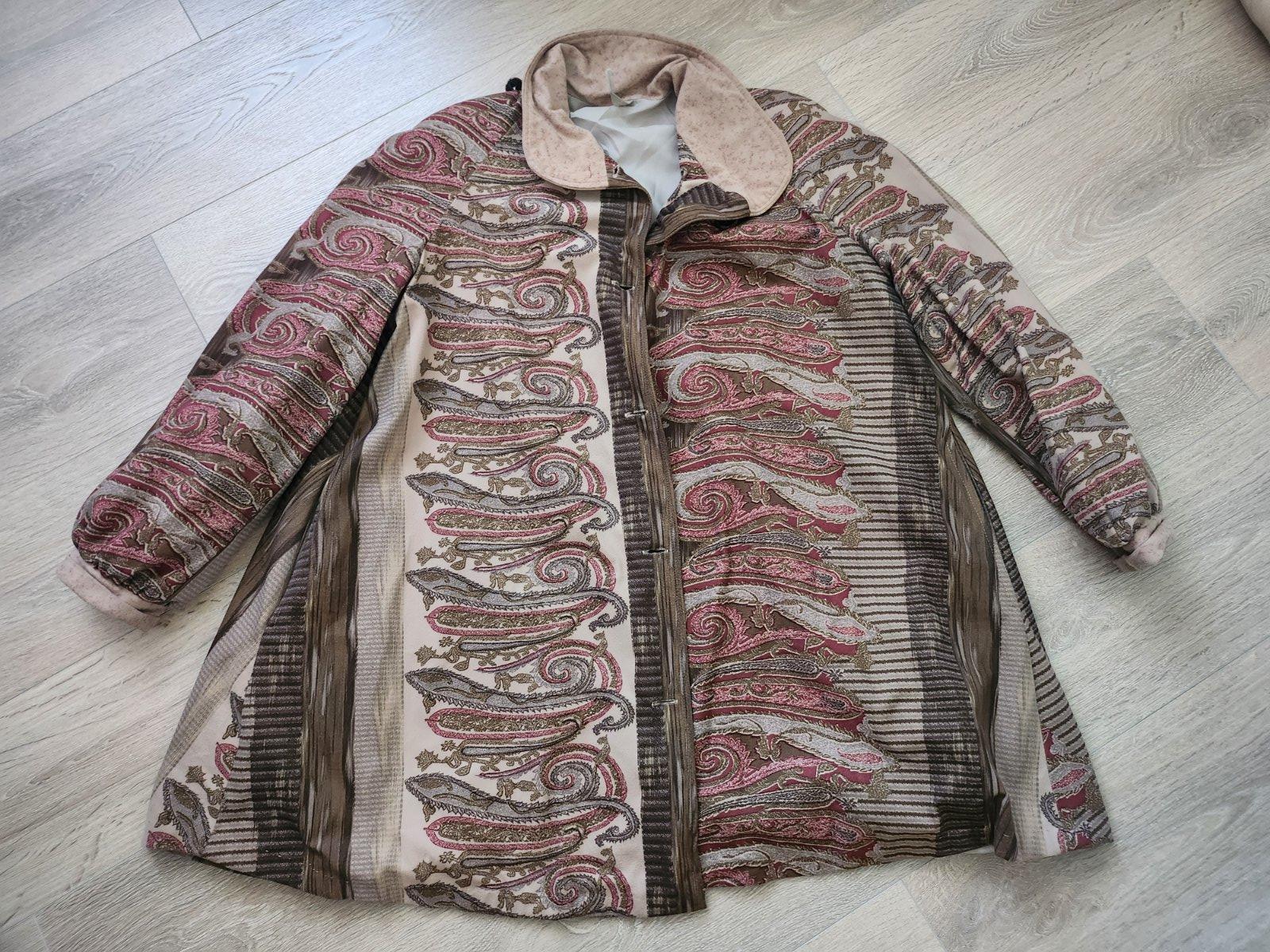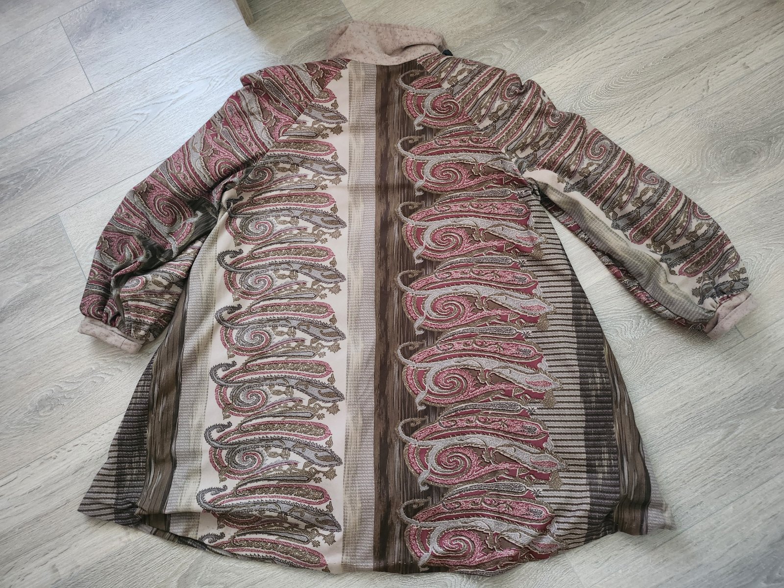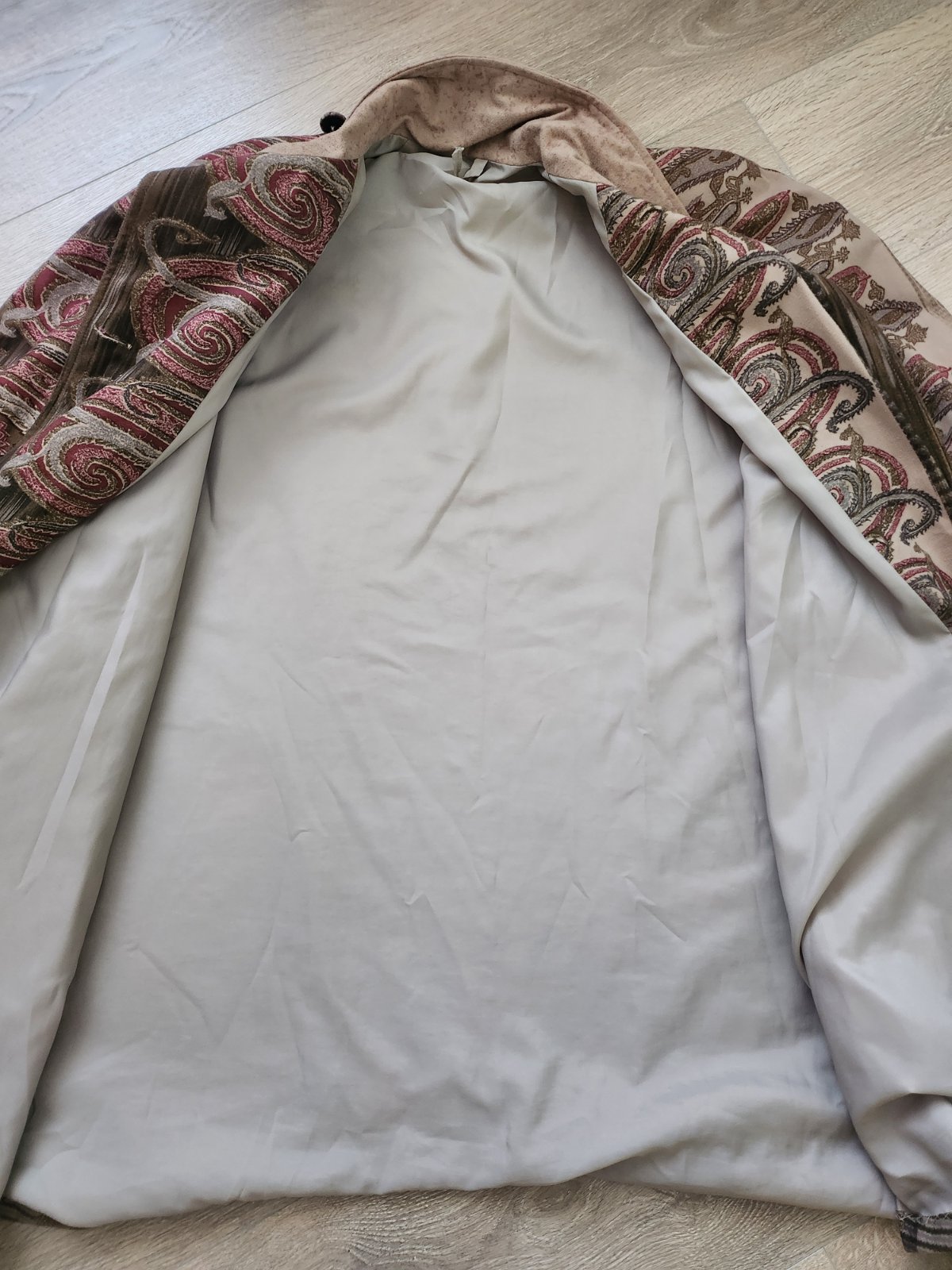 Krásny štýlový prechodný kabátik,veľ Uni vhodné pre veľ L-XXL.Nenoseny ,bez visačky zapínanie na gombíky Predný a zadný diel bukle,rukávy pletené Dl 112,šírka 56*2,v