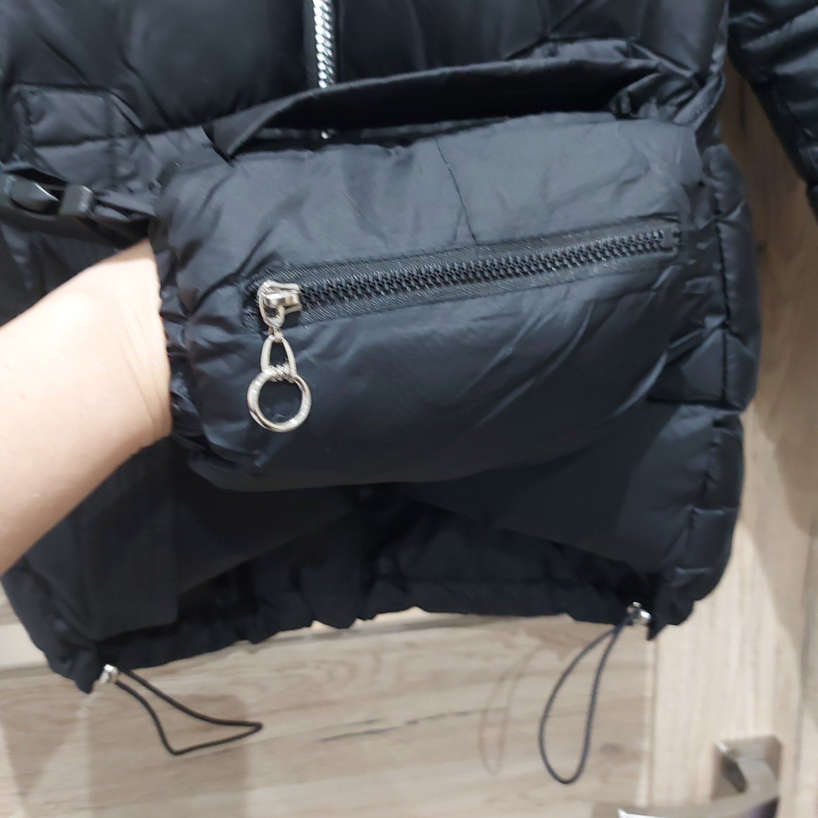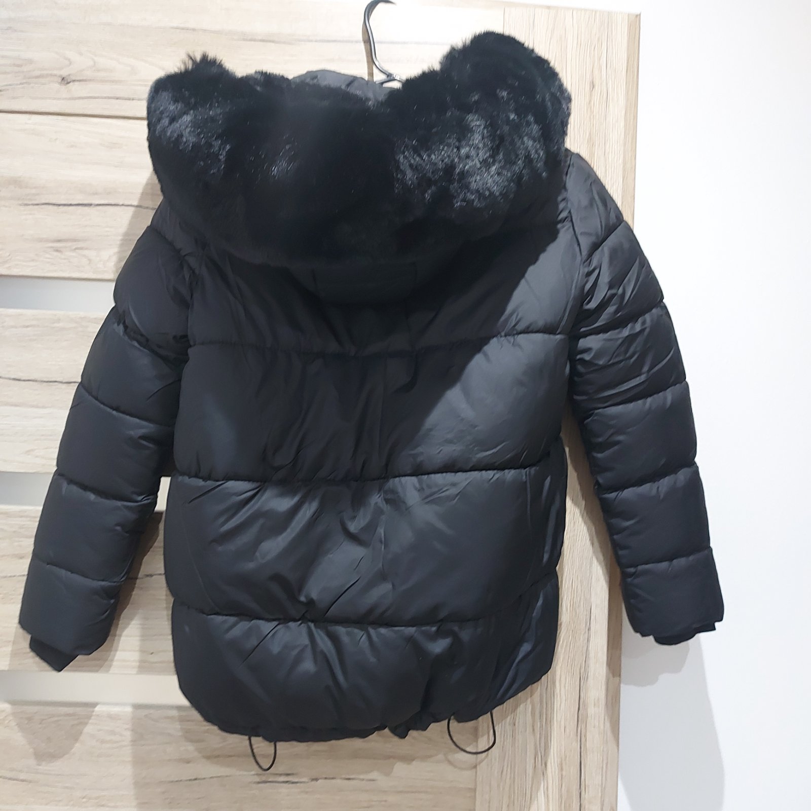 Bunda páperová s kapucňou na ktorej je kožušinka a opaskom na stiahnutie. Premeriam.