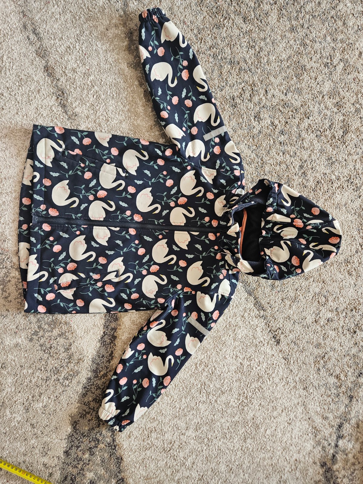 Dievcenska prechodna bunda, vel.128. Reflexne prvky pri zipsoch, na rukave a chrbte. Kapuca sa da odpojit, spodna cast stiahnut, rukavy pritiahnut. Nosena intenzivne na sport, co vidno hlavne na fa...