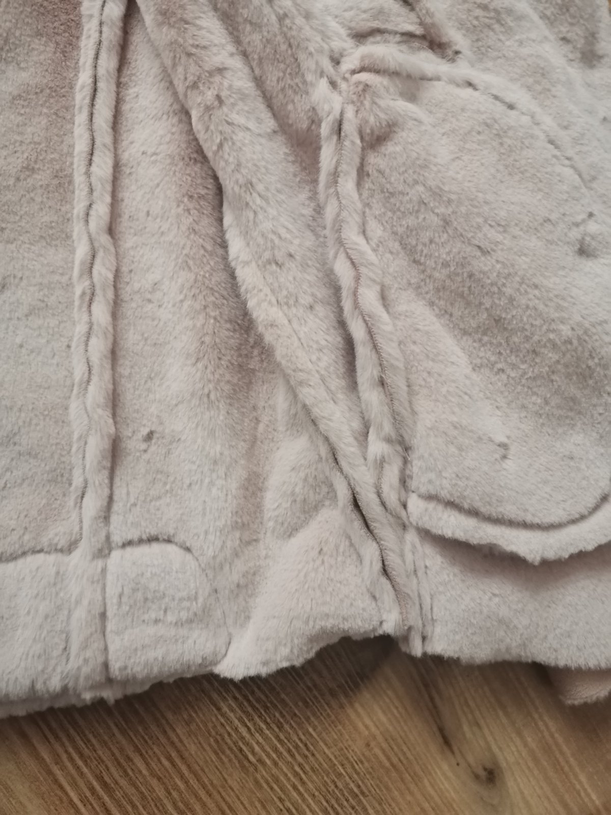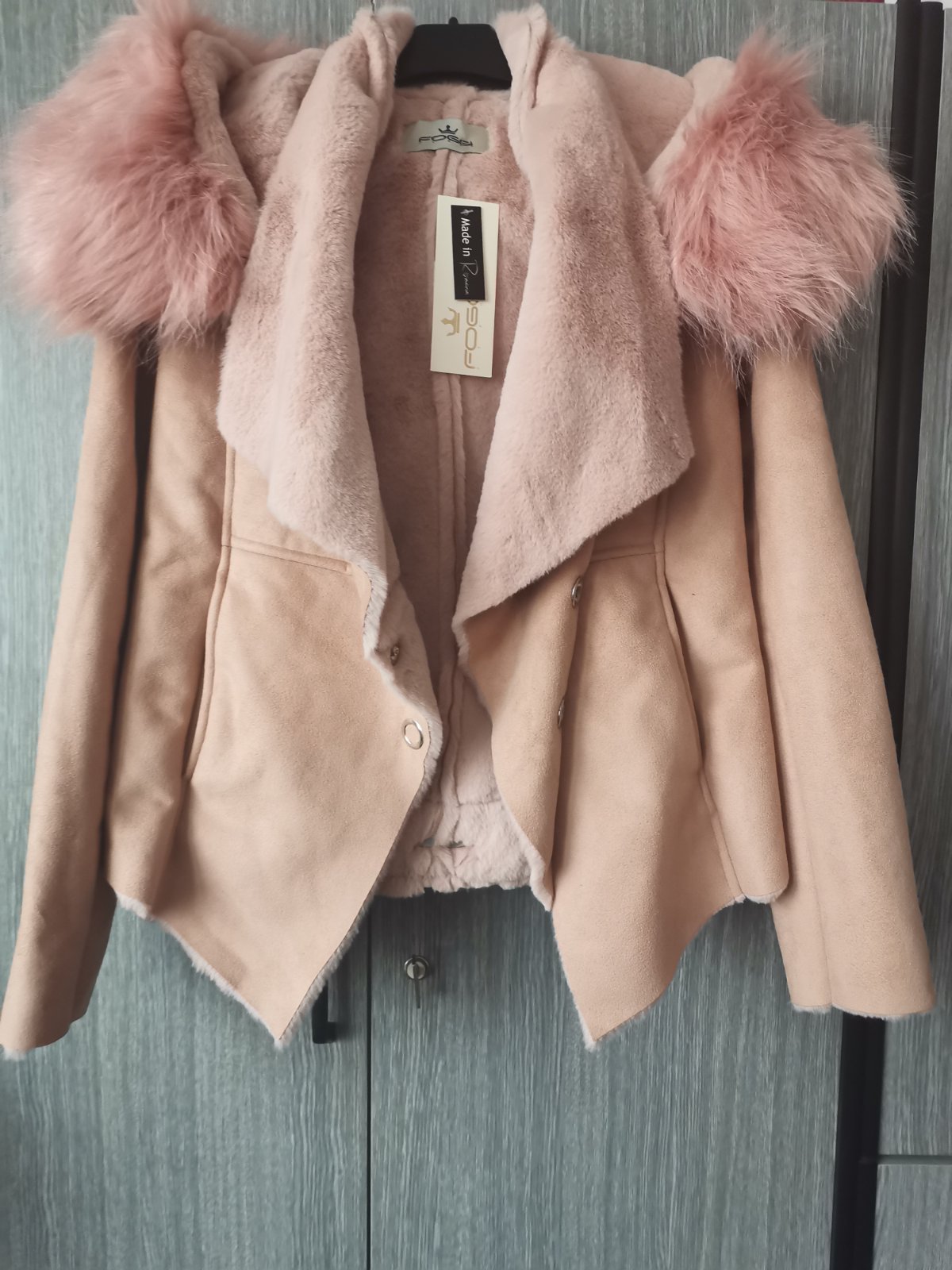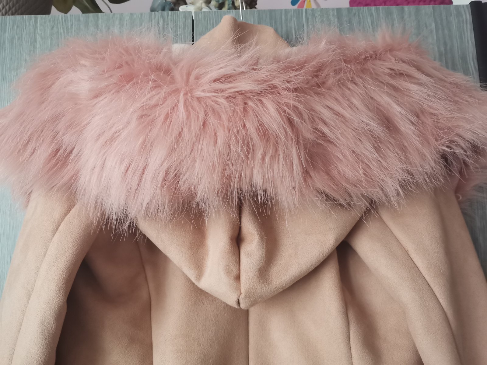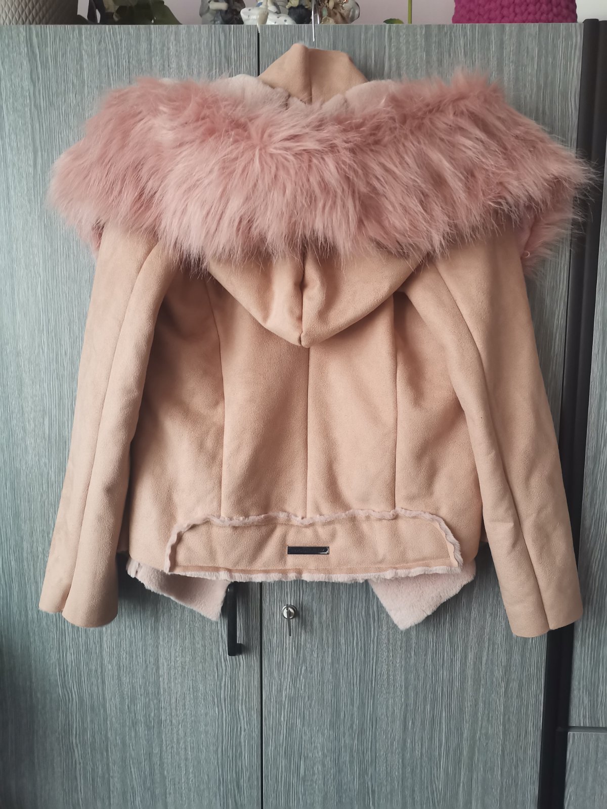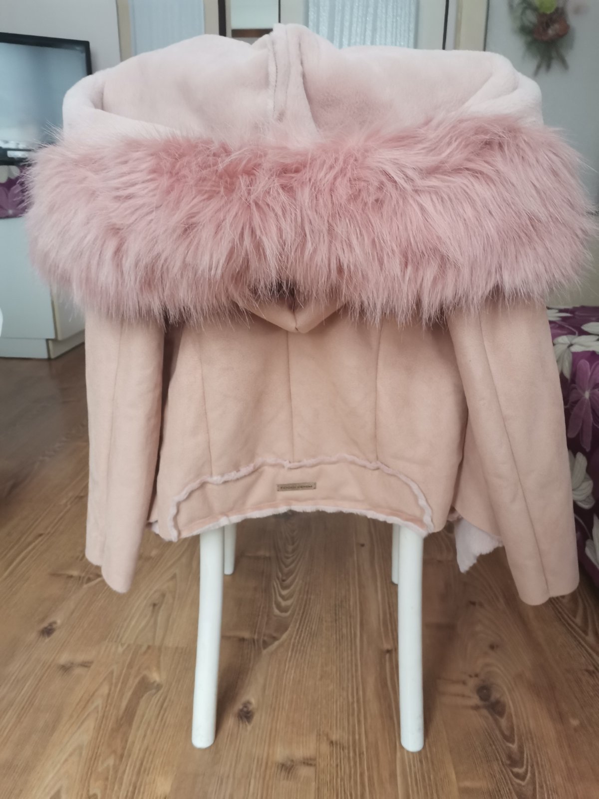 Bunda s veľkou kapucňou, odopína sa, farba béžová, trochu tmavšia ako na foto , kožušinka na kapucni s ružovým nádychom. Nová s visačkou.