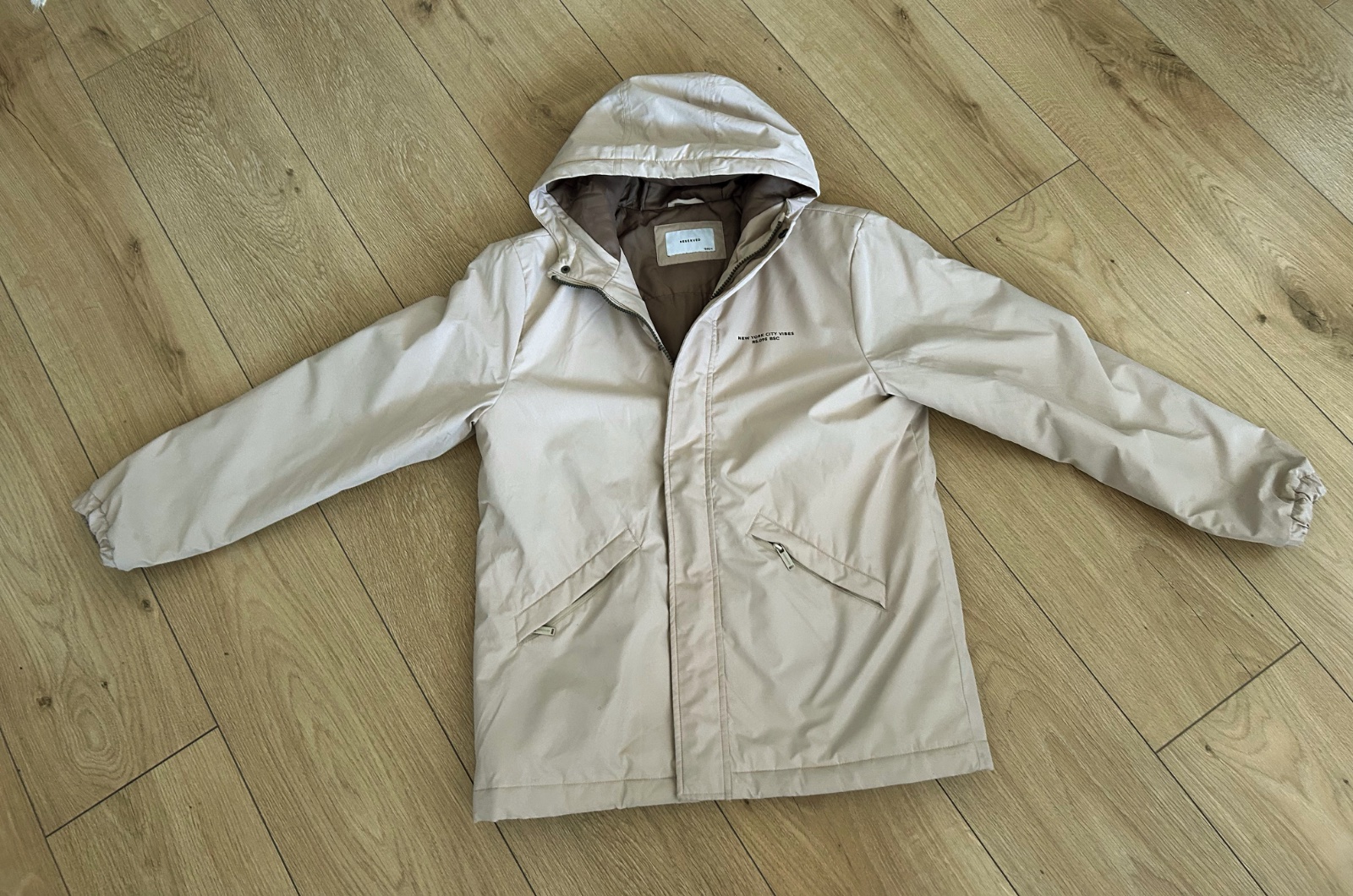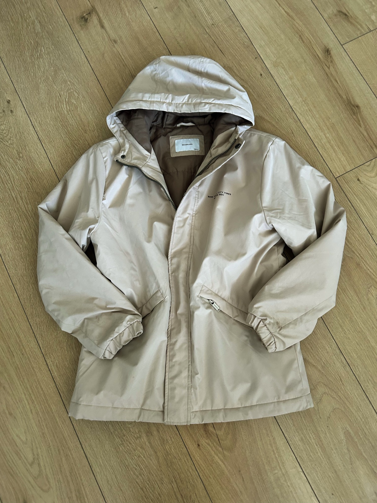 Predĺžená jesenná bunda s kapucňou značky Reserved, veľkosť 158. 2 vonkajšie vrecká, 1 vnútorné, 1vrecko na rukáve. V páse sa dá stiahnuť gumičkou. Kapucňa sa nedá odopnúť. Celková dĺžka 80cm. Šírk...