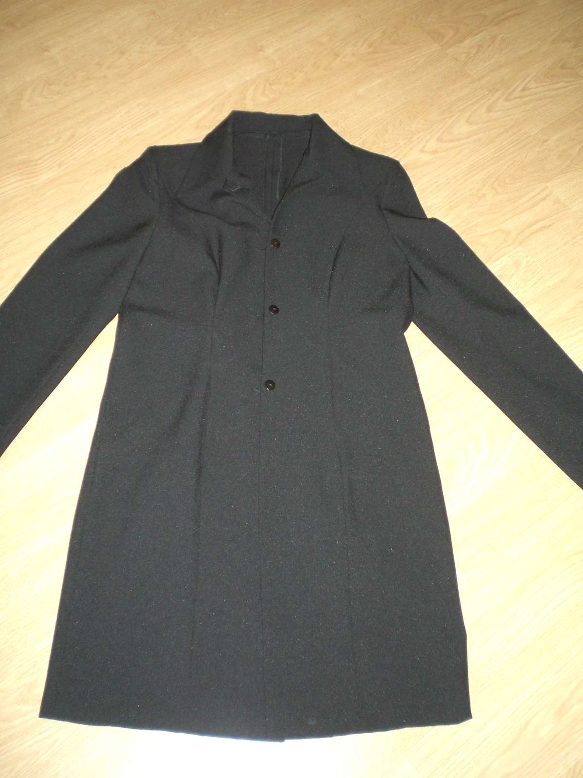 Možnosť stiahnutia v páse opaskom. Krátky rukáv s manžetkou. Nenosené. Dvojradové zapínanie. Podšité. Materiál s miernym odleskom. Zadná časť goliera trochu nazberaná. V prípade záujmu pomeriam.