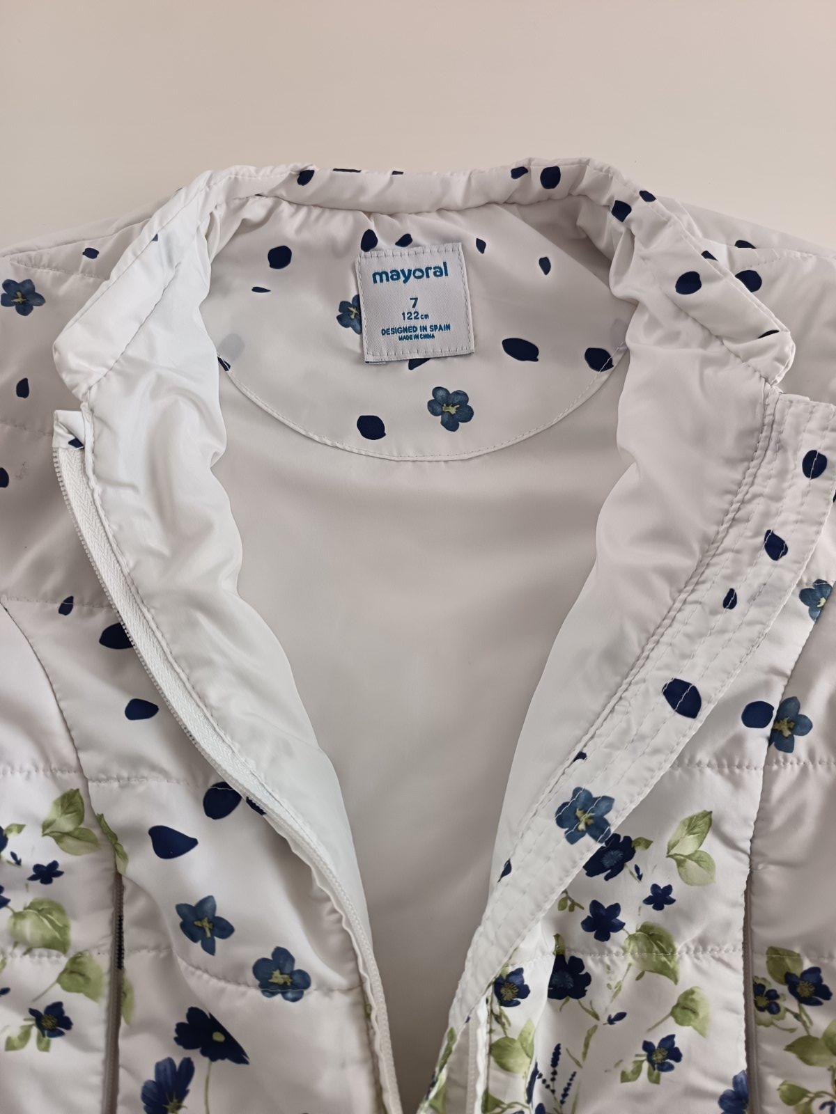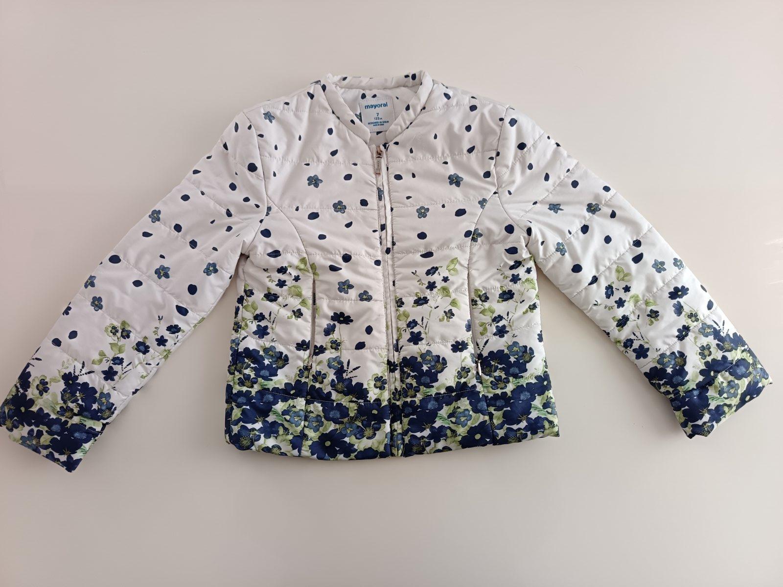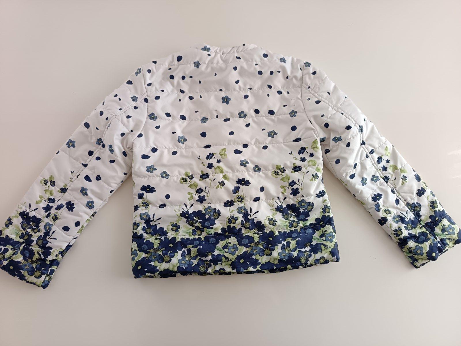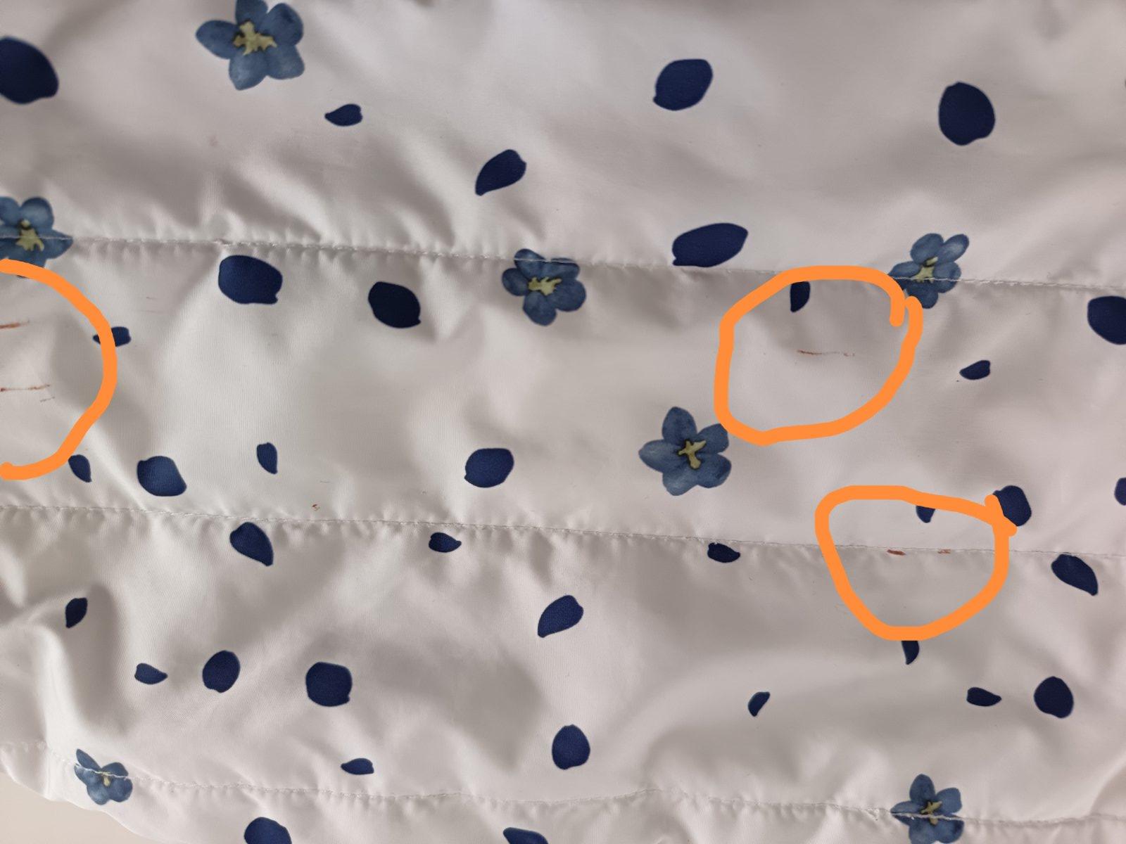 Biela bunda s tmavo modrými kvietkami, zapínanie na zips, dva vrecká, tiež sa zapinaju zipsom, podsita, zo zadnej strany malinke skvrny(viď foto), takmer ich ani nevidno, inak bez poškodenia