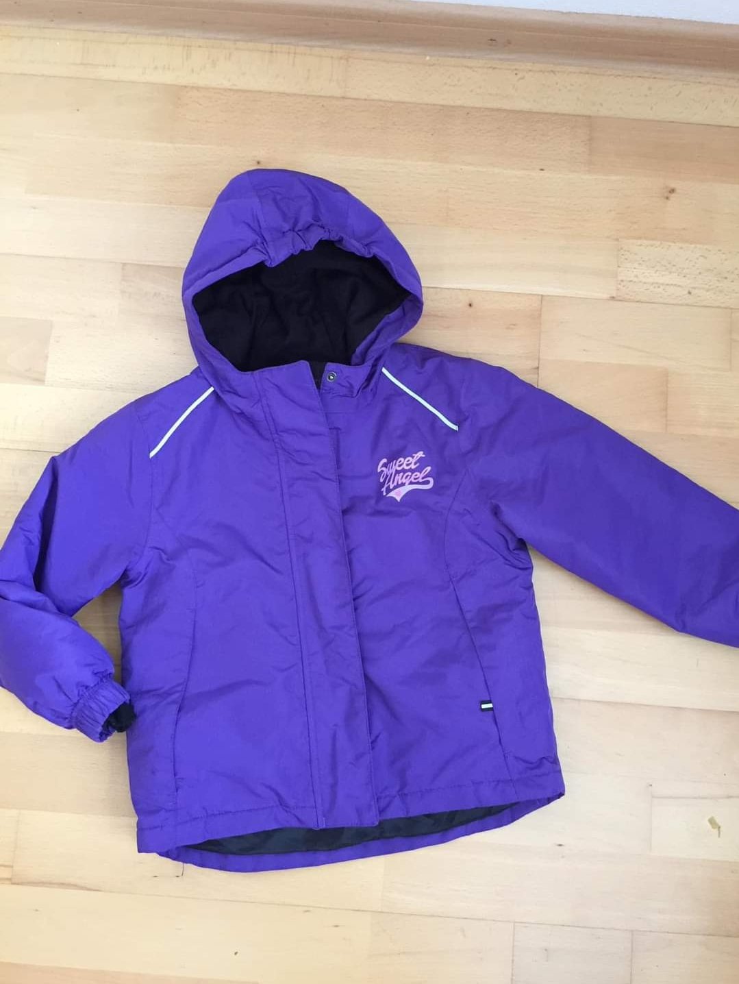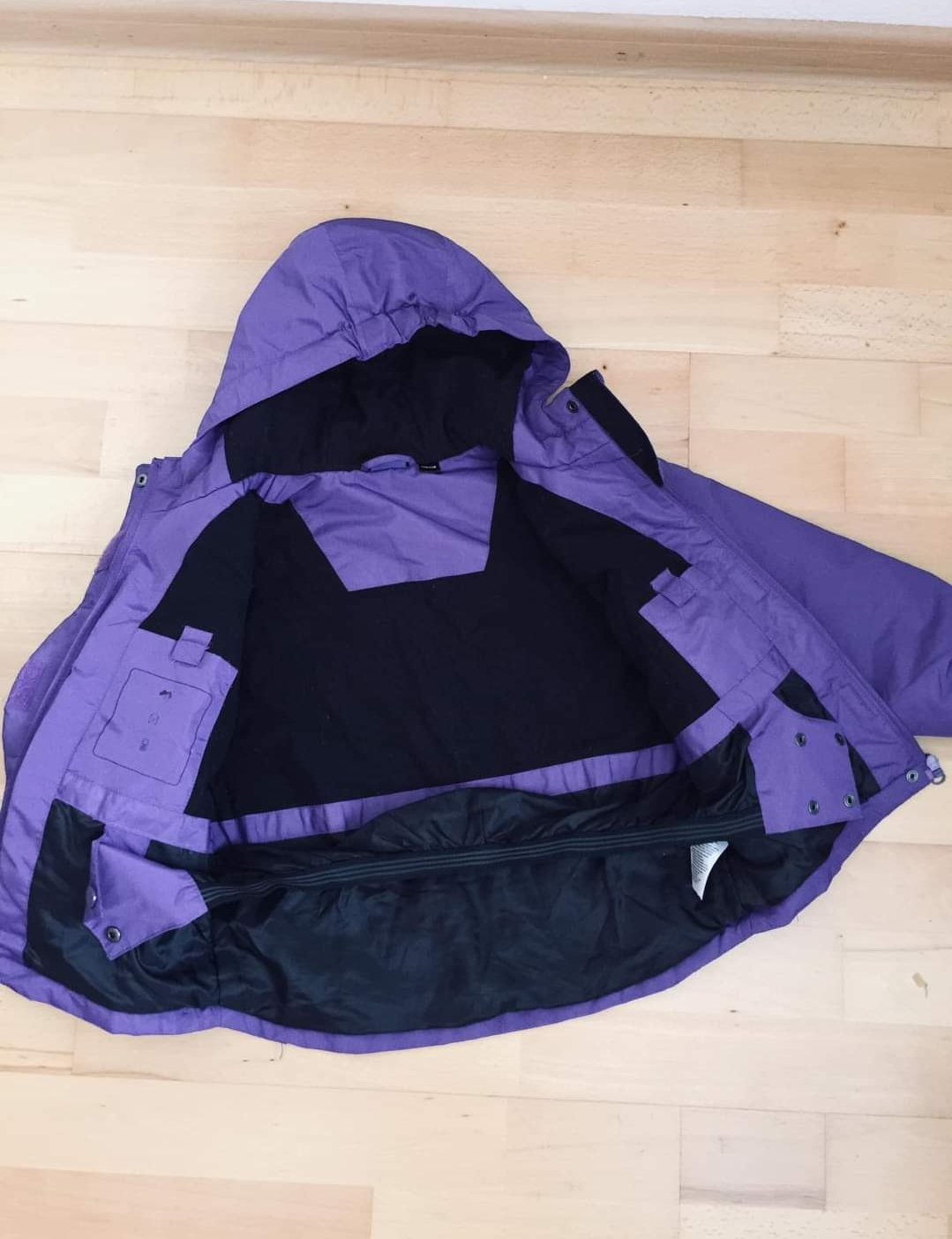 fialová bomberka s kožušinkou, veľkosť 110, kapucka sa dá odopnúť, dobrý nosený stav, nie je príliš hrubá, ale nosili sme ju v pohode aj v zime, dĺžka 42cm, šírka 42cm, rukáv od krku 52cm
