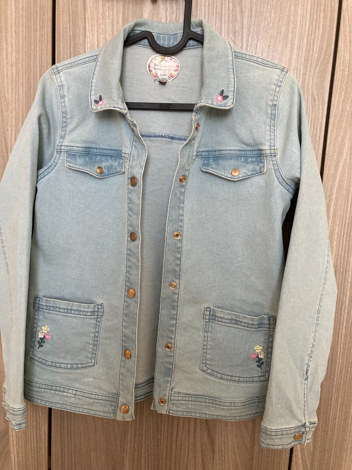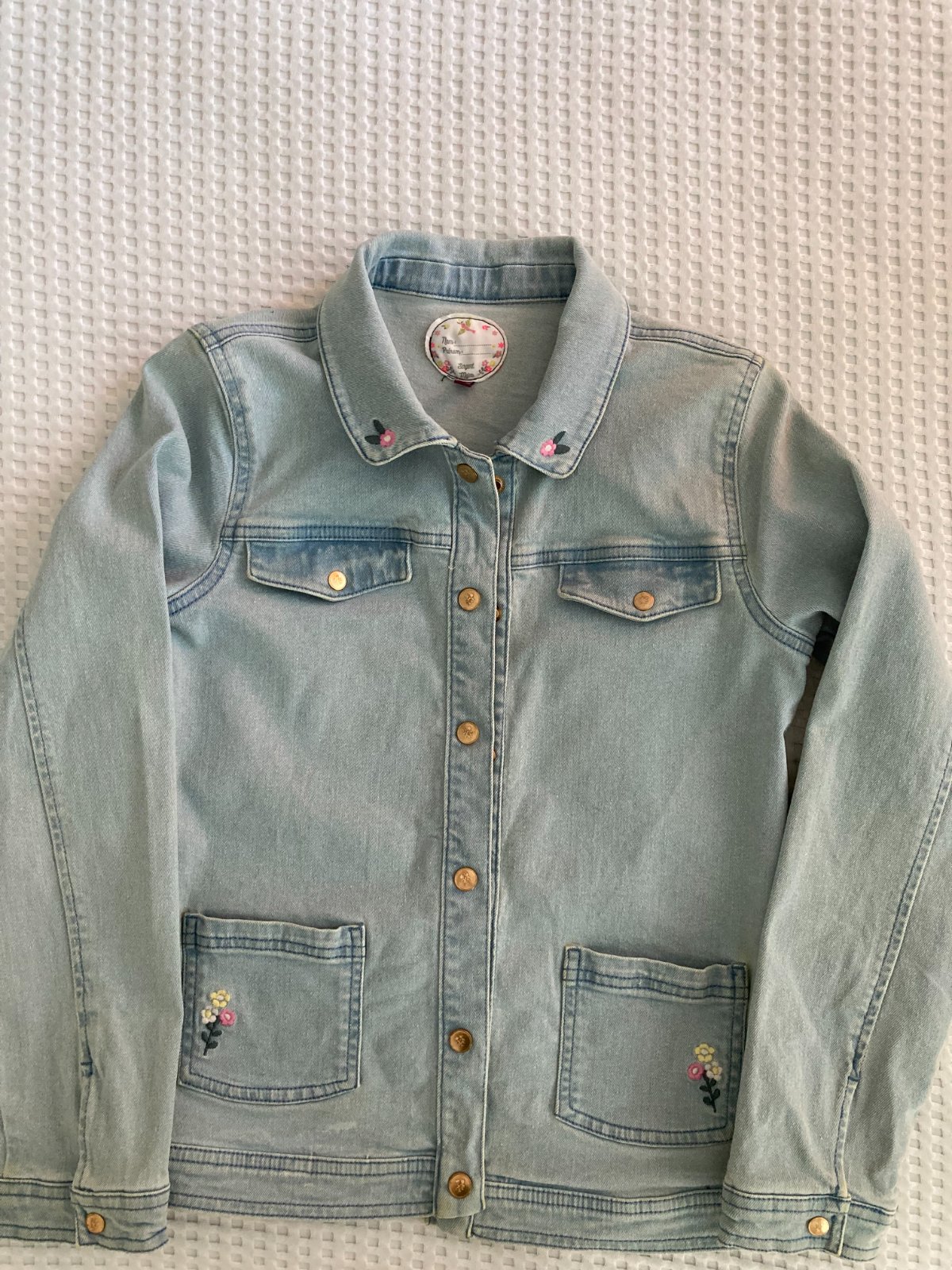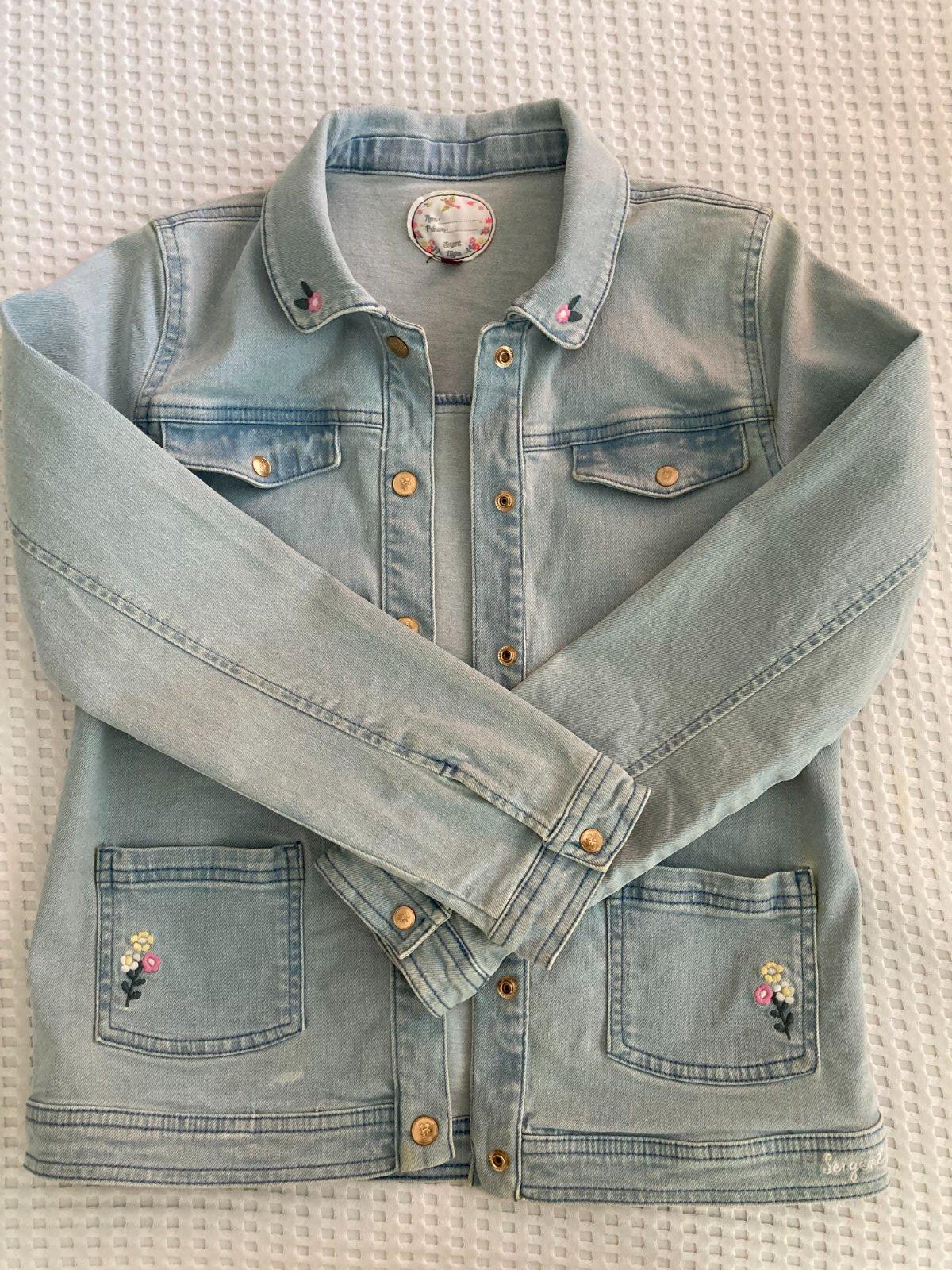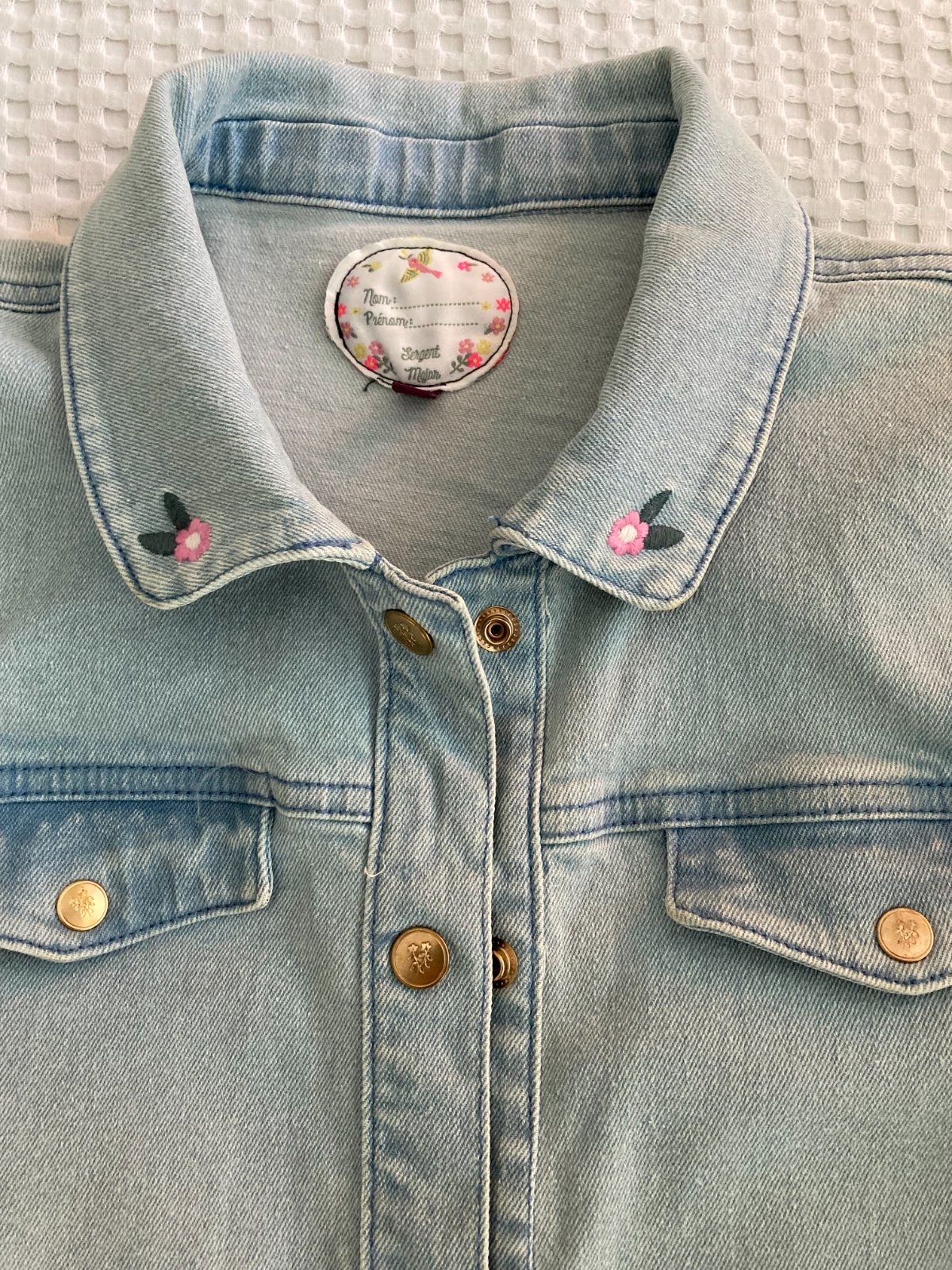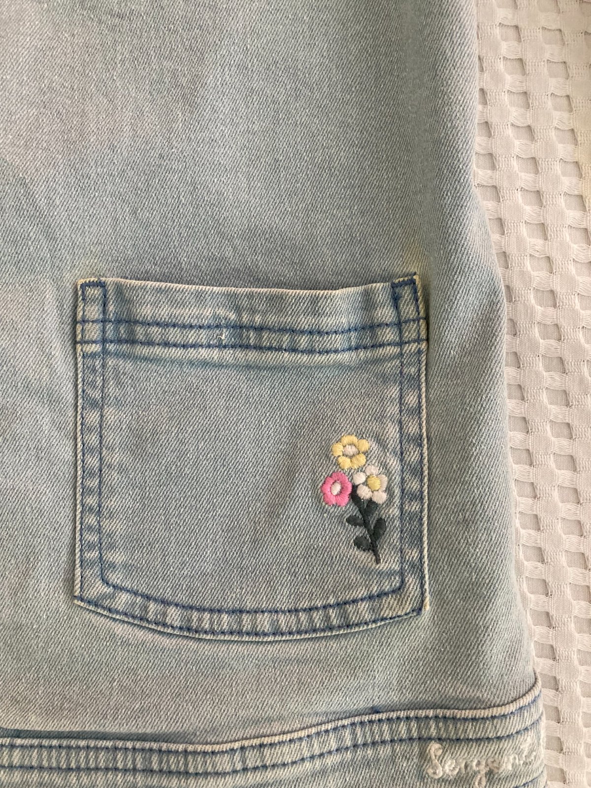svetlomodrá riflovina, s vyšitými kvetinovými detailami