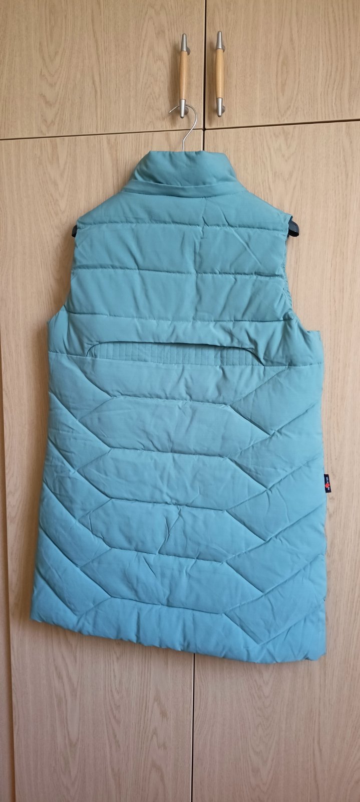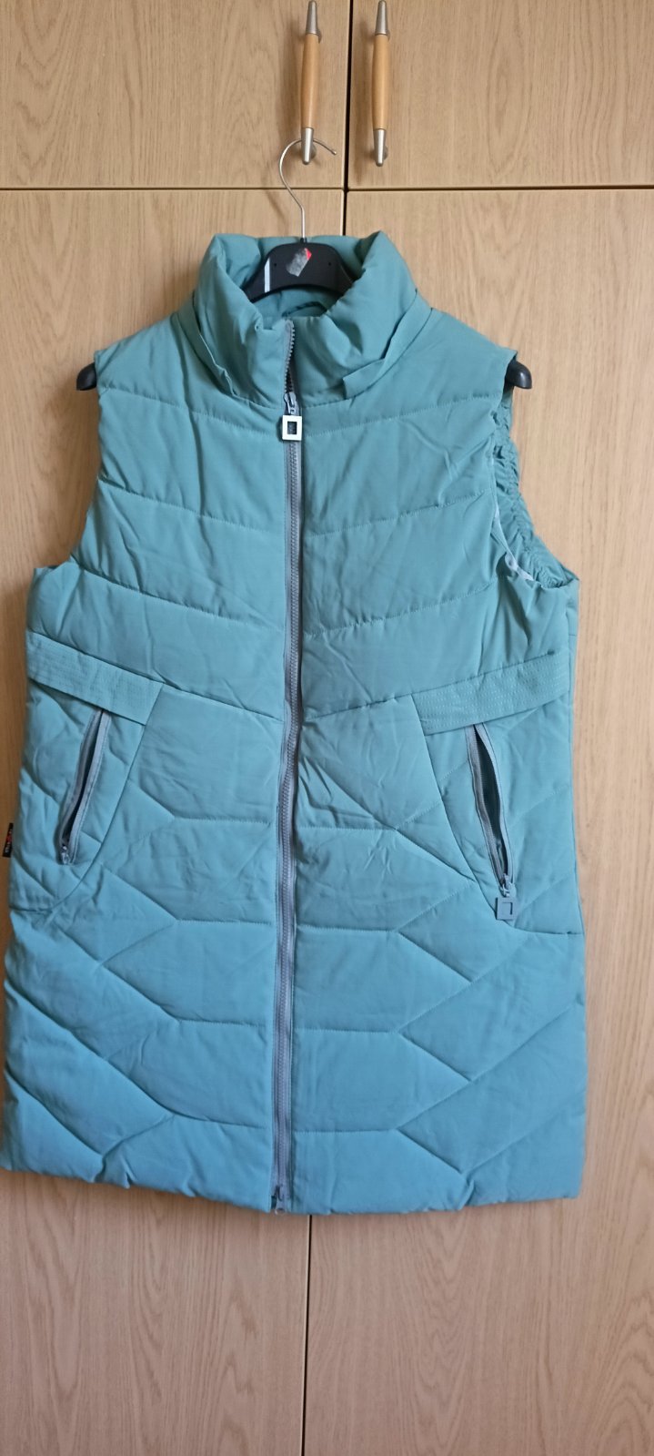Zachovalá vesta , zvnútra teplá, má odnímateľnú kapucňu.Dĺžka vpredu od krku 56cm ,vzadu 51,5cm