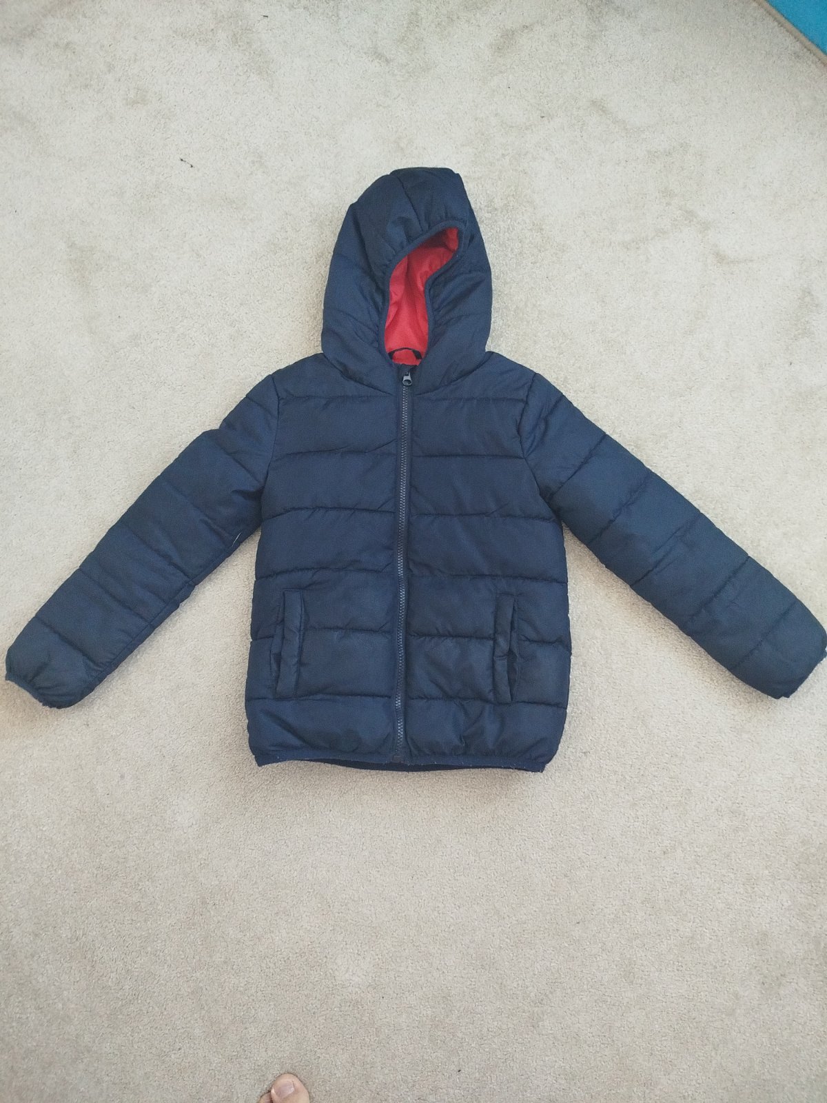 Tmavomodrá bunda s kapucňou prechodná, prešívaná....dĺžka 58cm,pás 2x50cm,rukáv 65cm, ramená 42cm