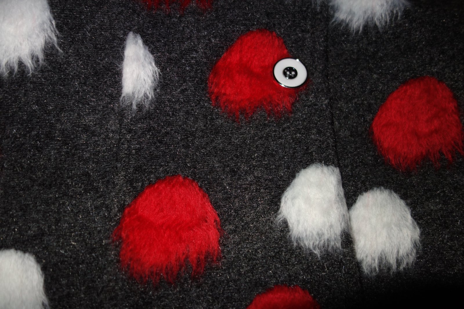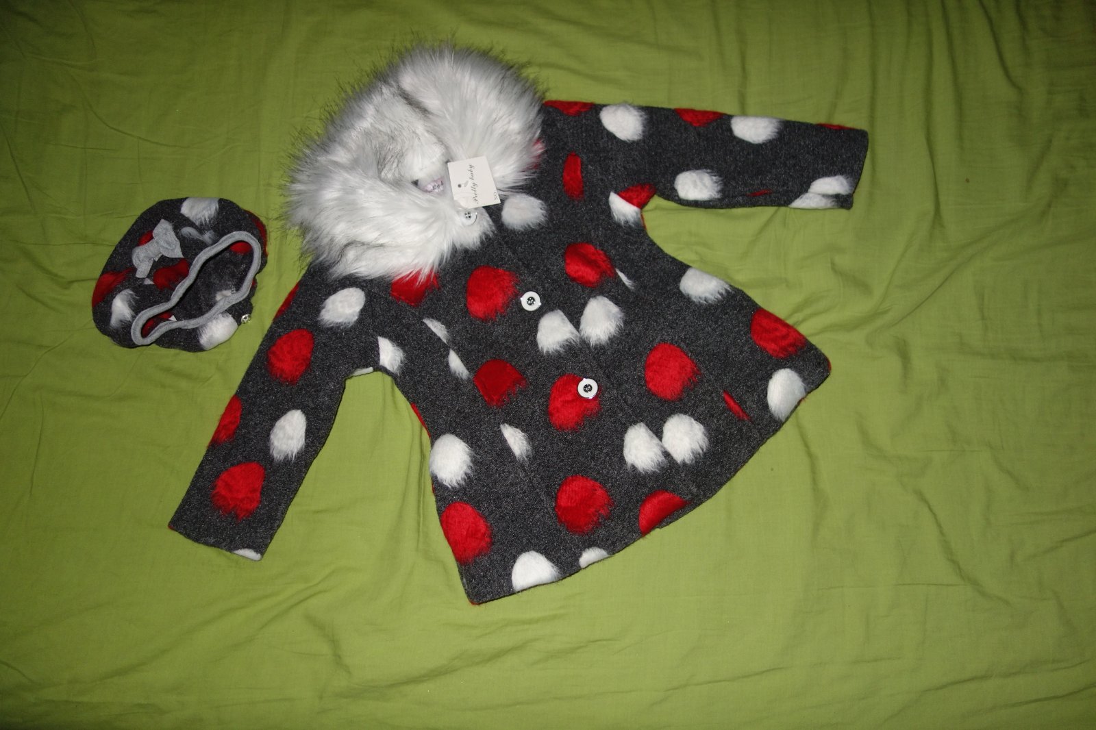 Krasny flausovy kabatik s baretkou- novy, s visackami. Je urceny na zimu, ale len na miernu.