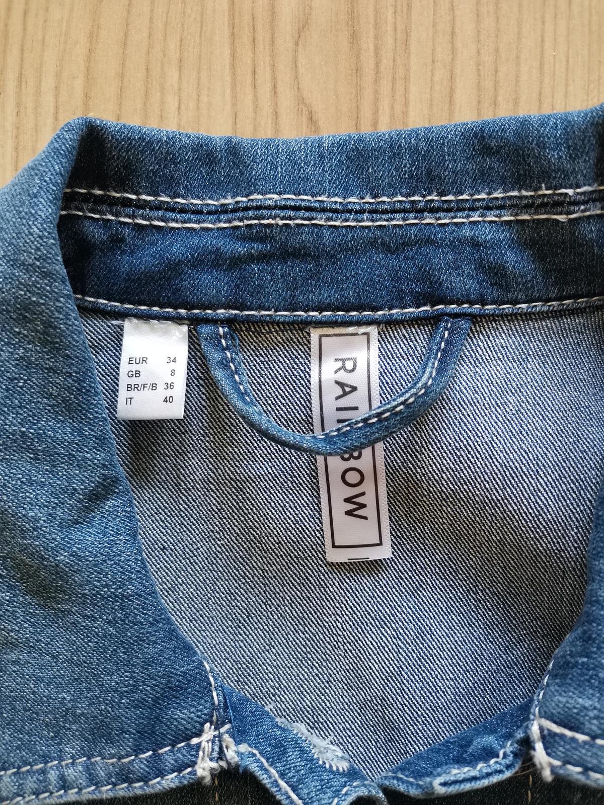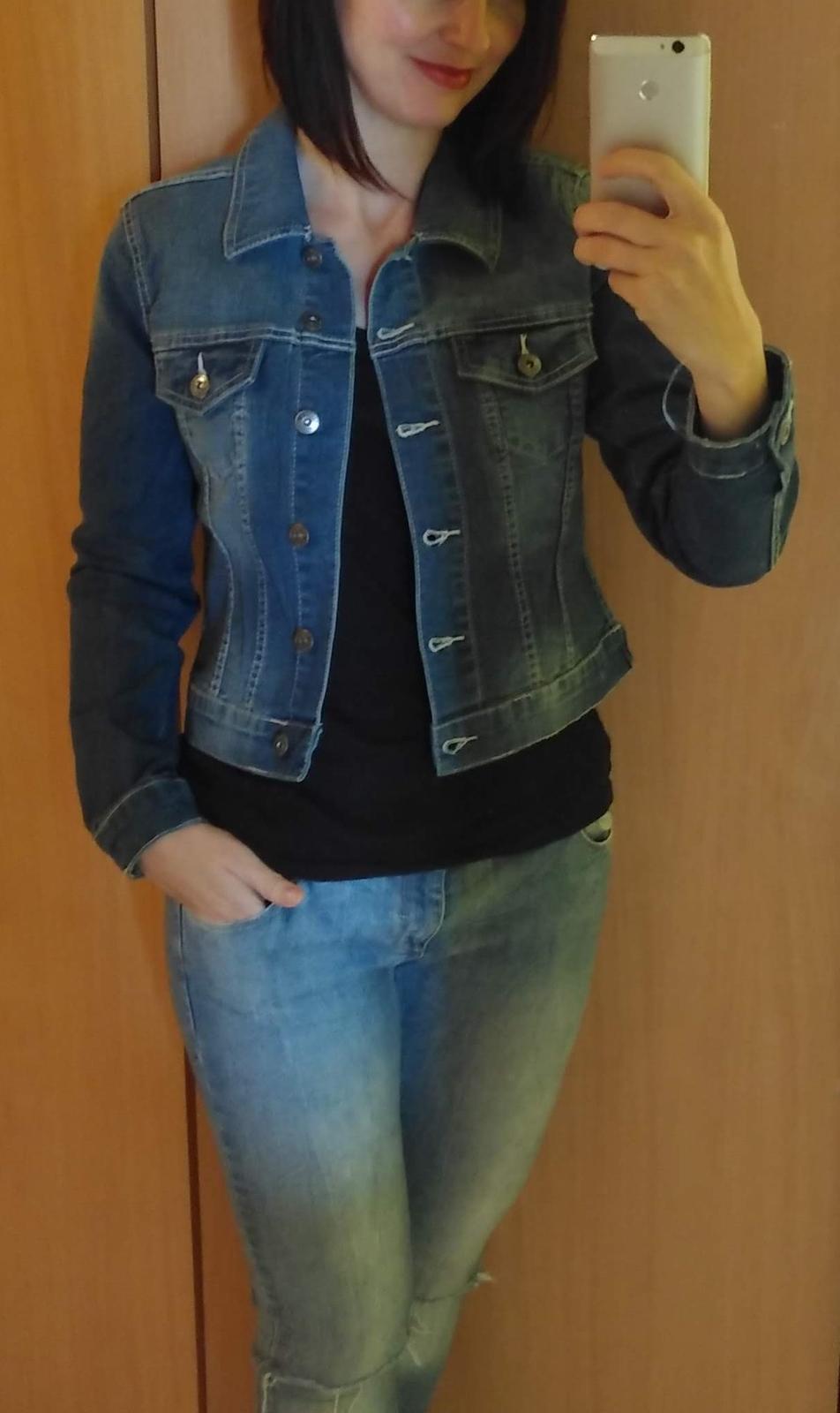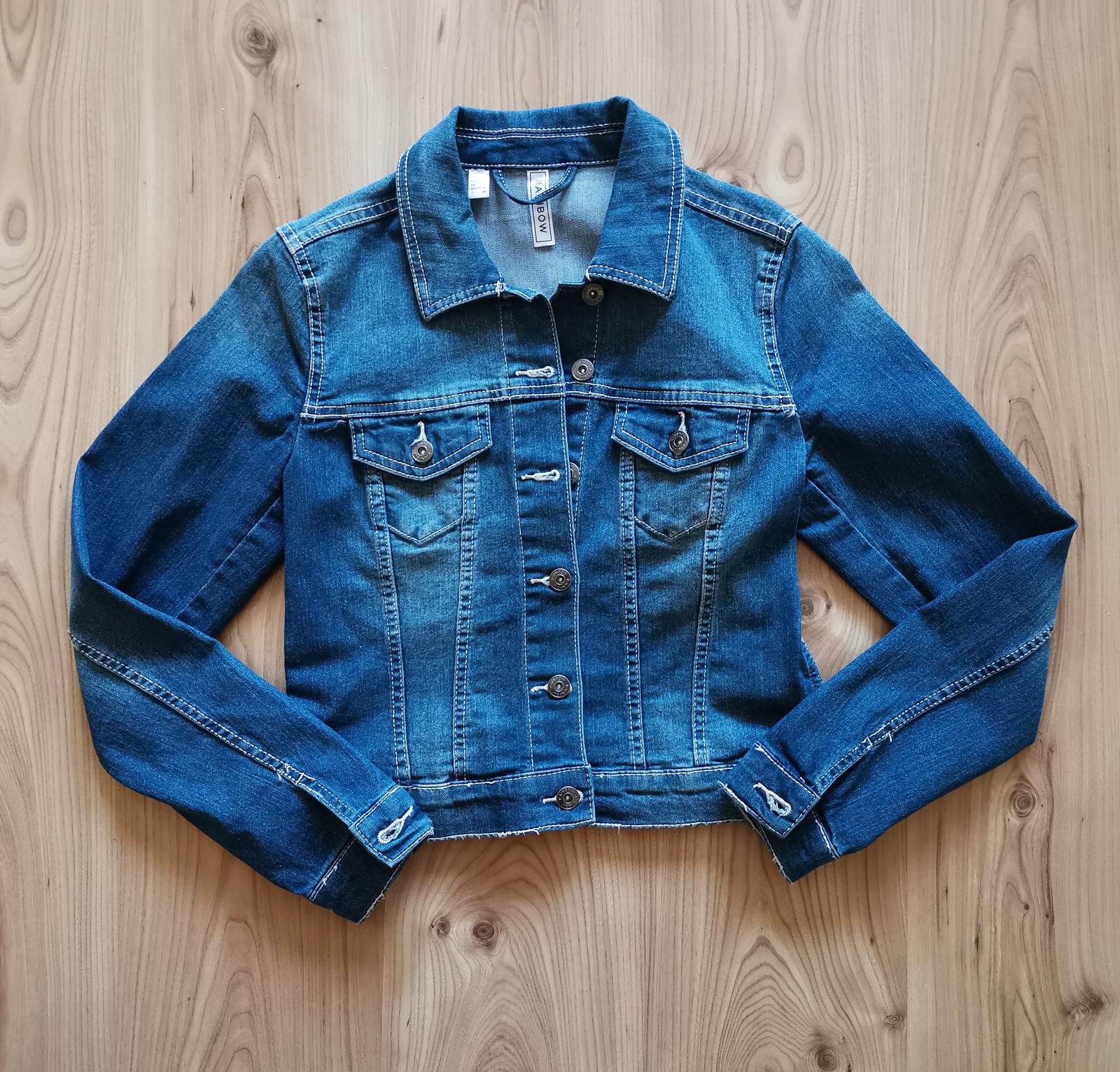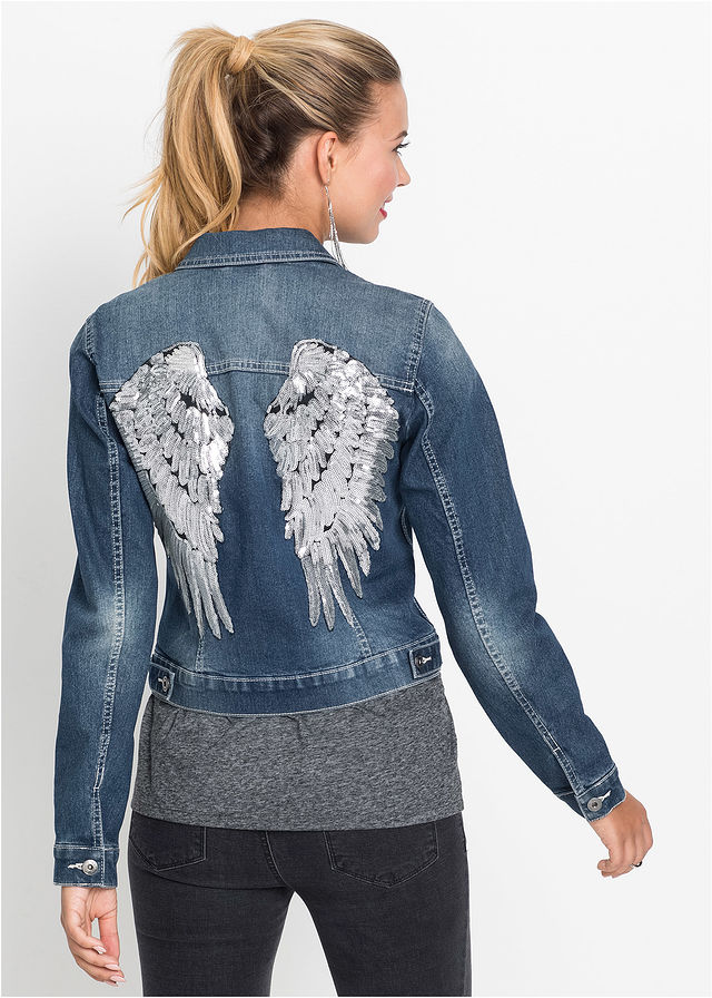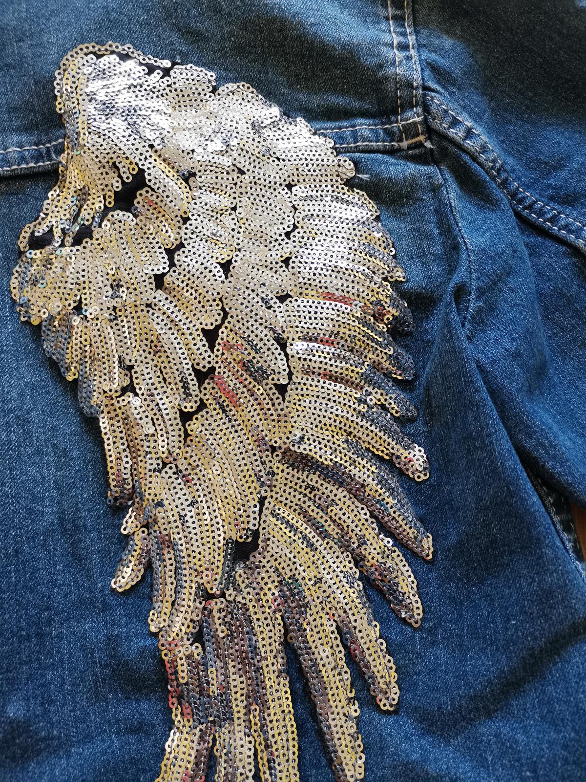 Krásna tmavomodrá rifľová bundička, s aplikáciou krídel na chrbte tvorenou zo strieborných flitrov. Nenosená, úplne nová, veľkosť sedí na S/M.