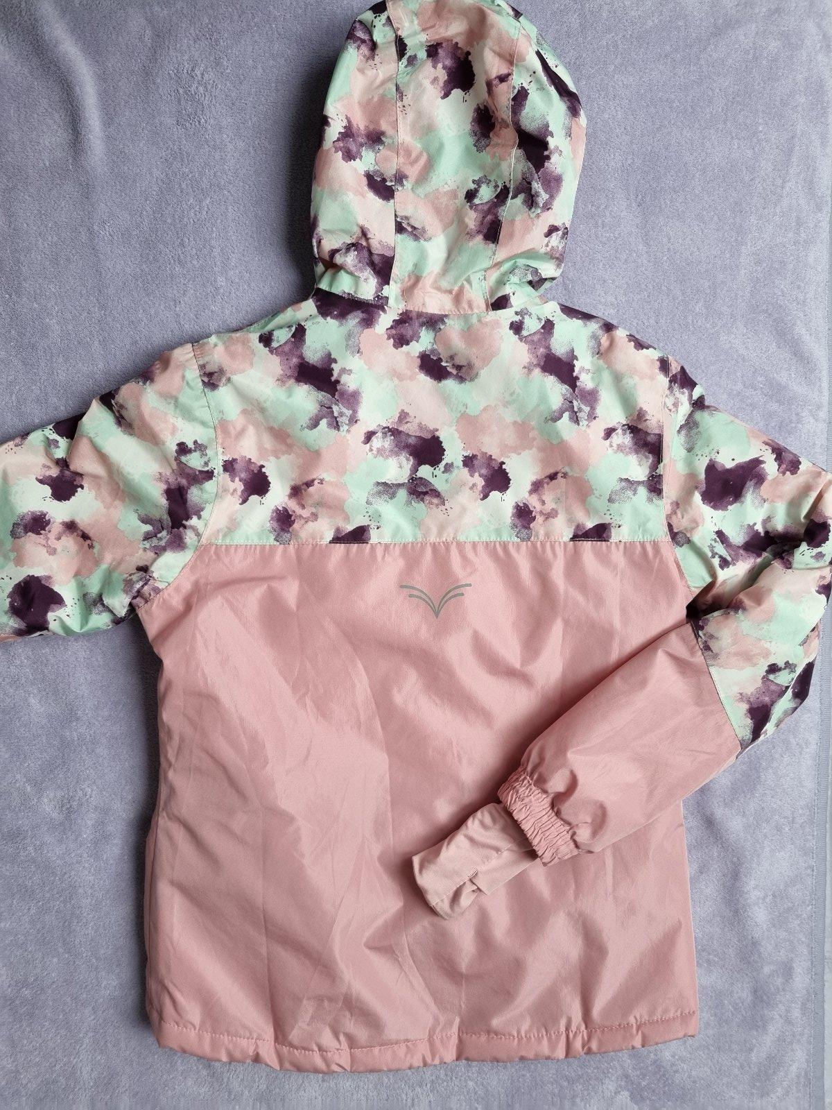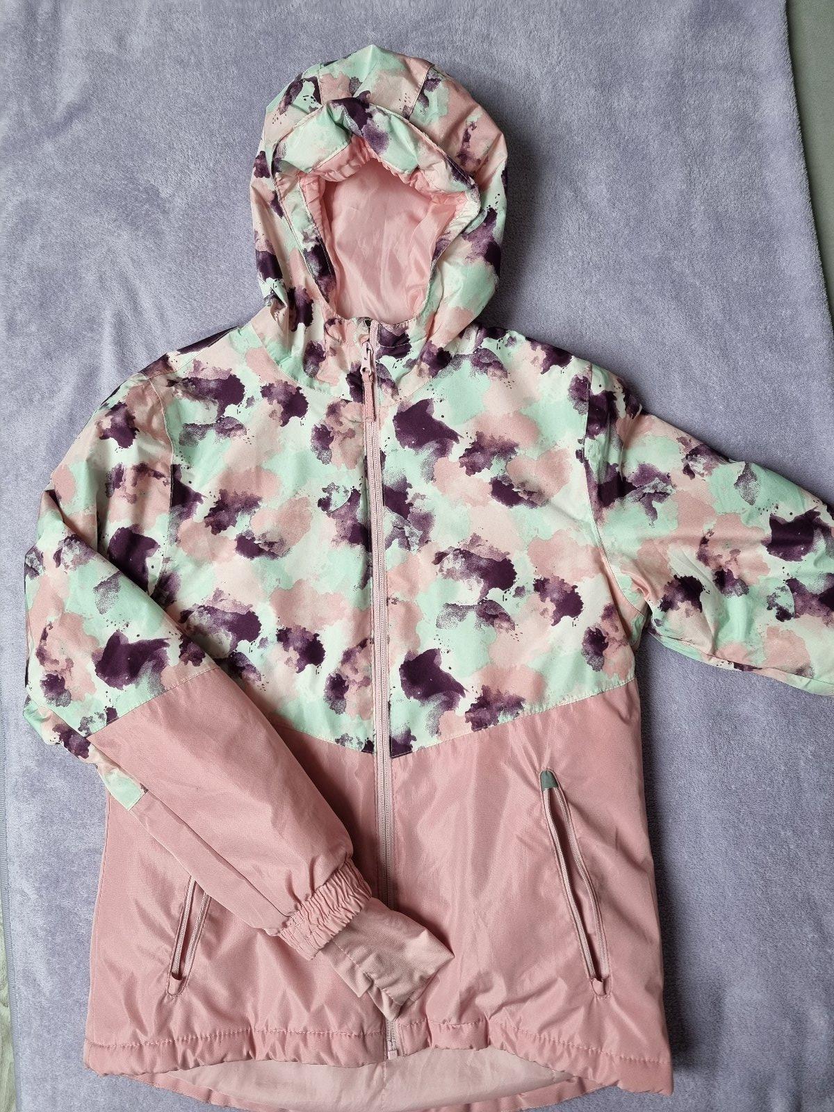 Dievčenská lyžiarska bunda č. 146/152, snežný pás, vnútorné patenty na ruky, vrecko na rukáve na permanentku, reflexné prvky, kapucňa napevno. Zipsy na vreckách sa nedajú zavrieť, chýbajú behúne, inak v poriadku.