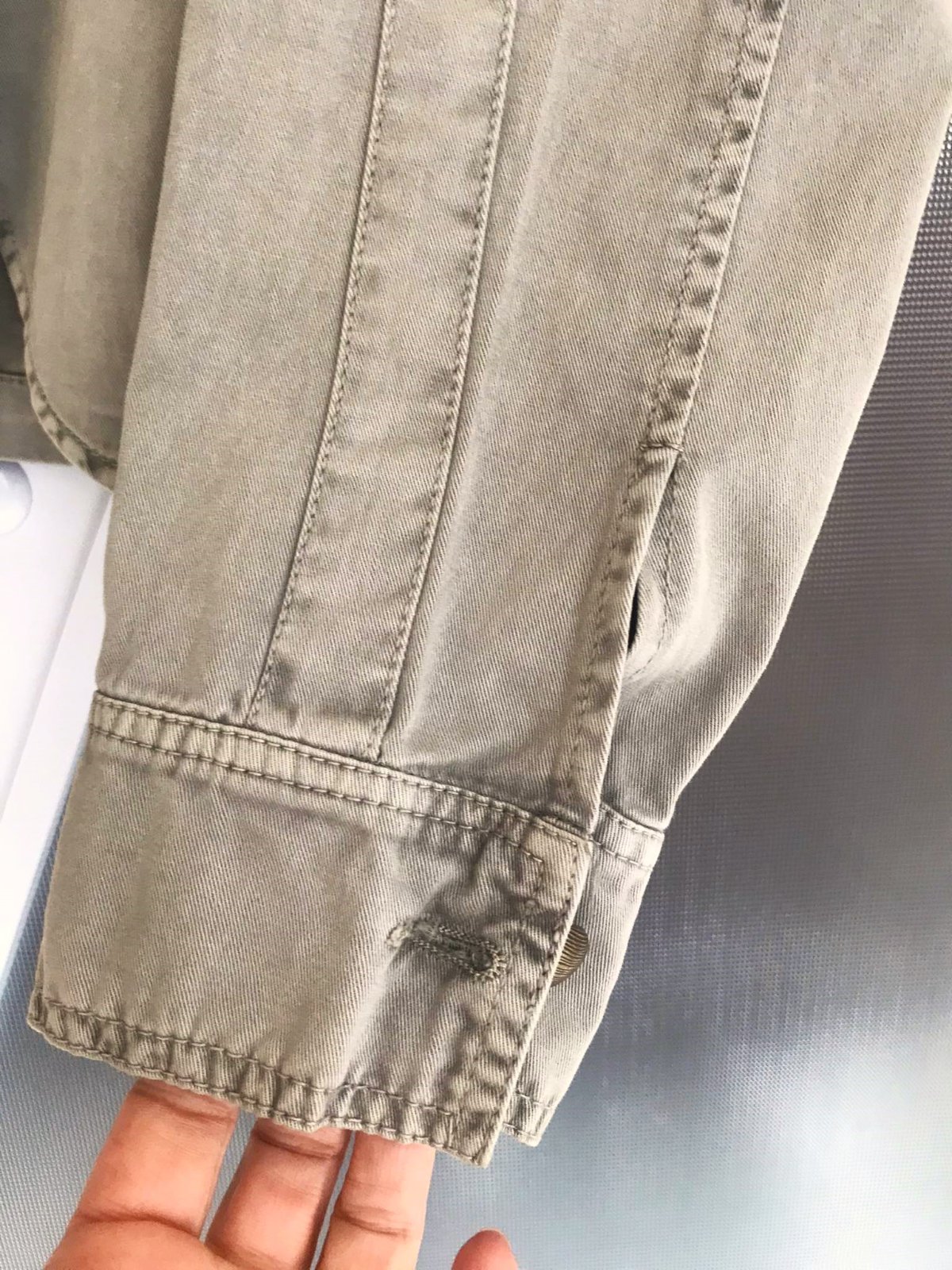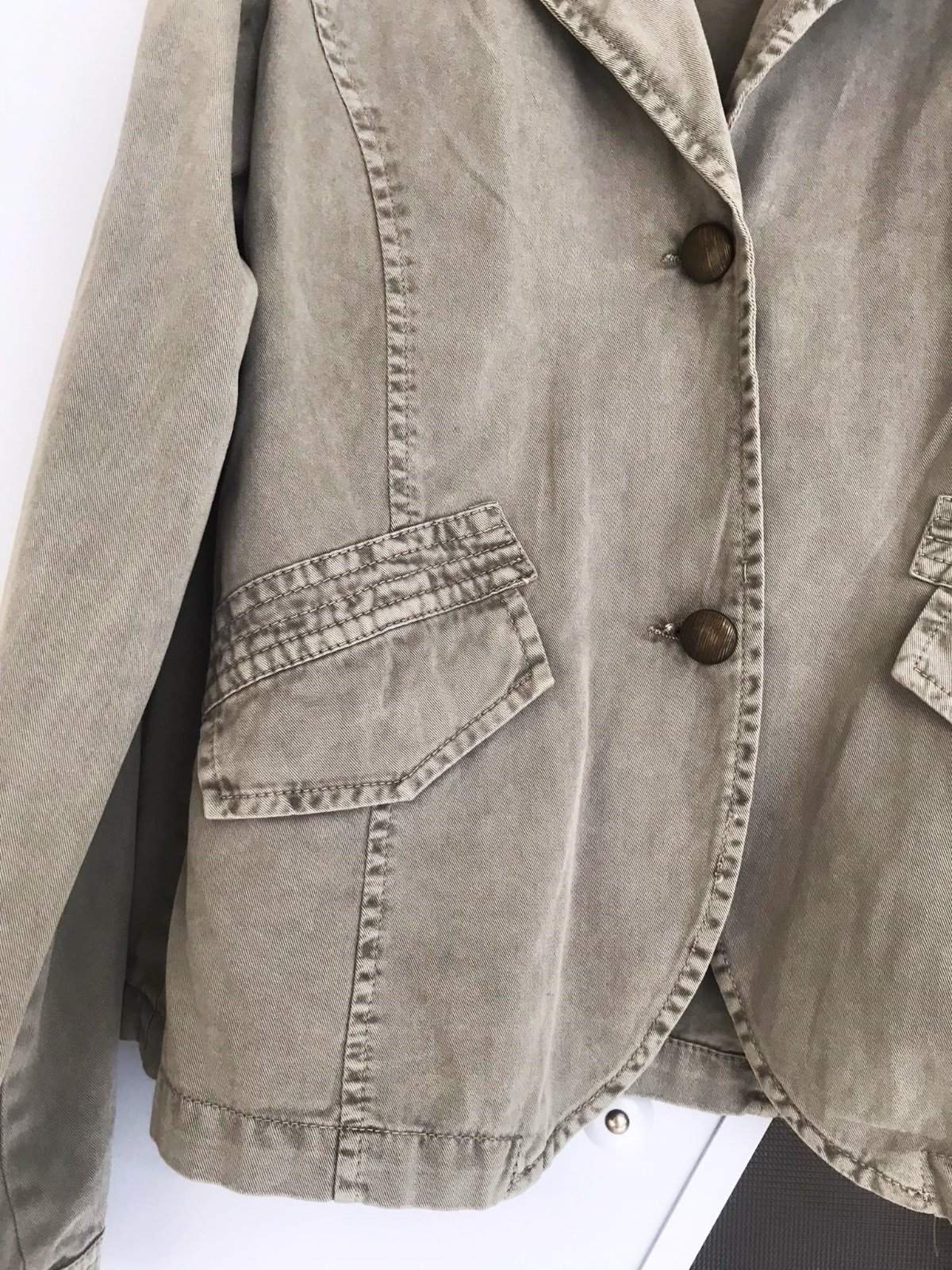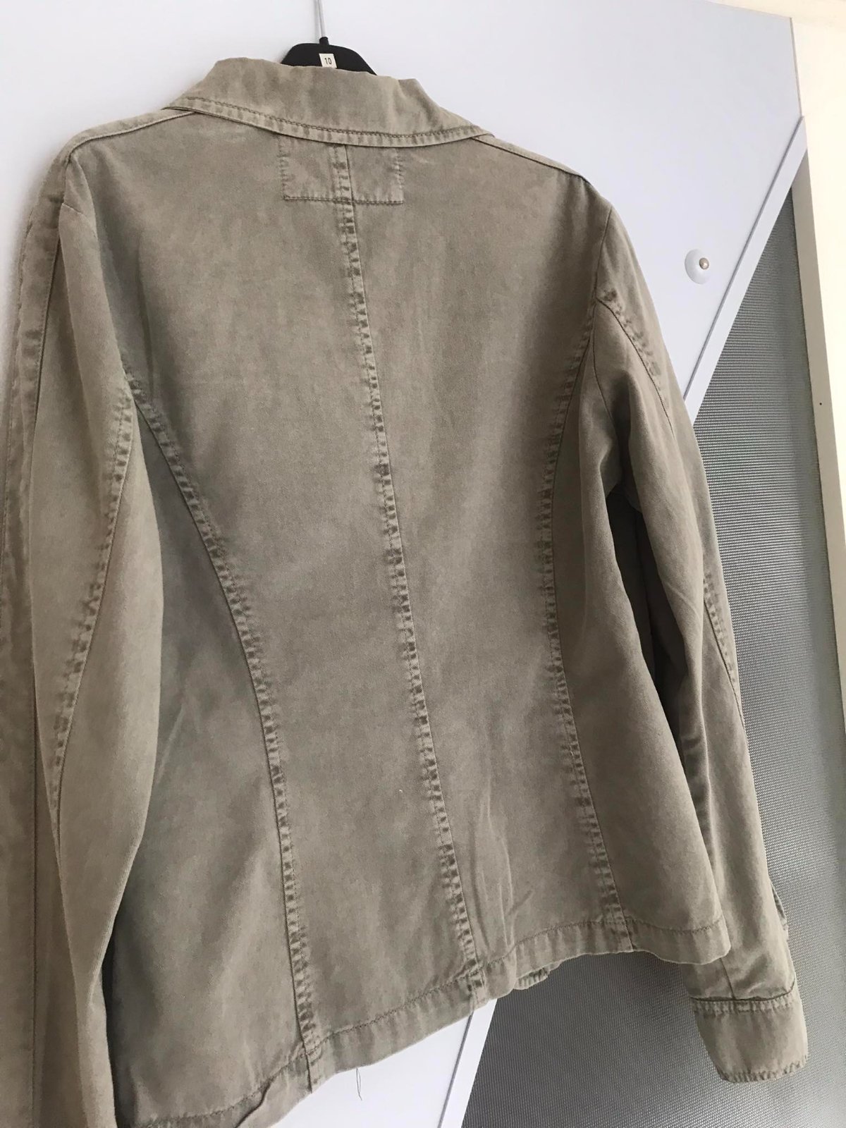 prechodné veľmi kvalitné sako s modernými prvkami,farba olivovo zelená - šedá,materiál niečo ako diftín - bavlna....