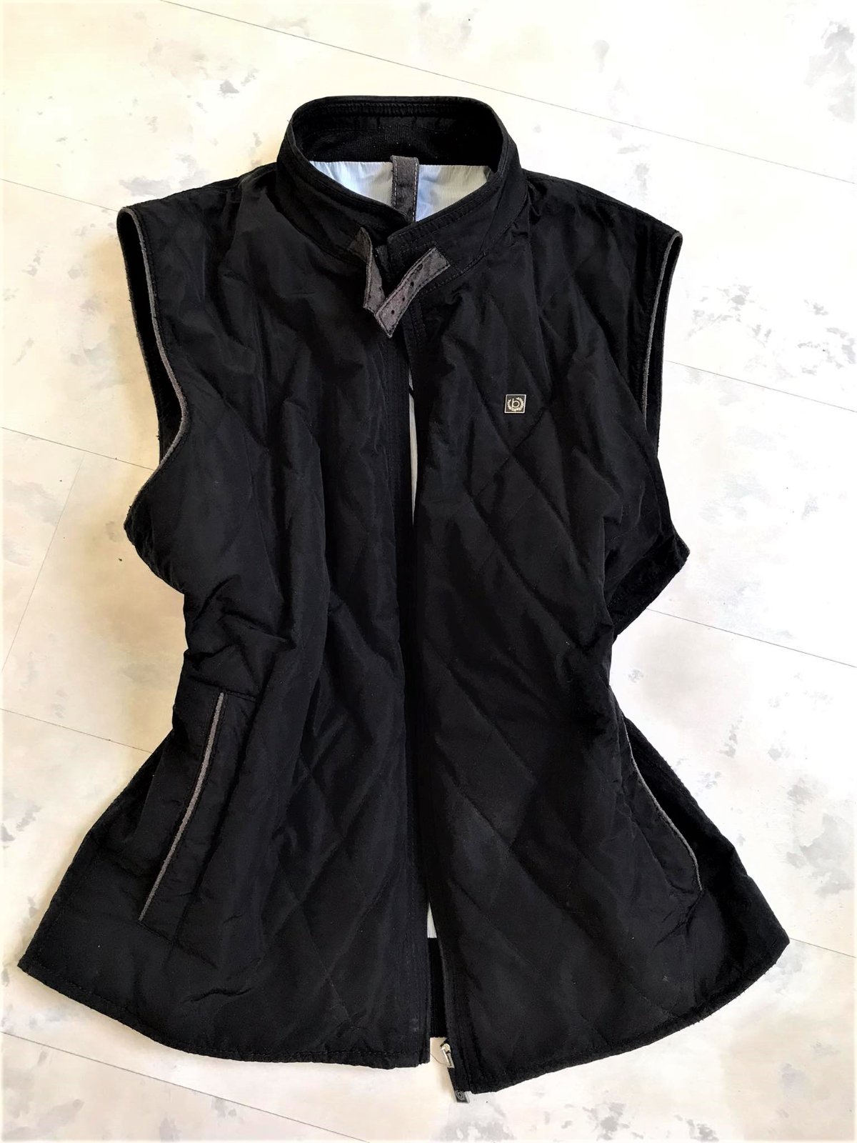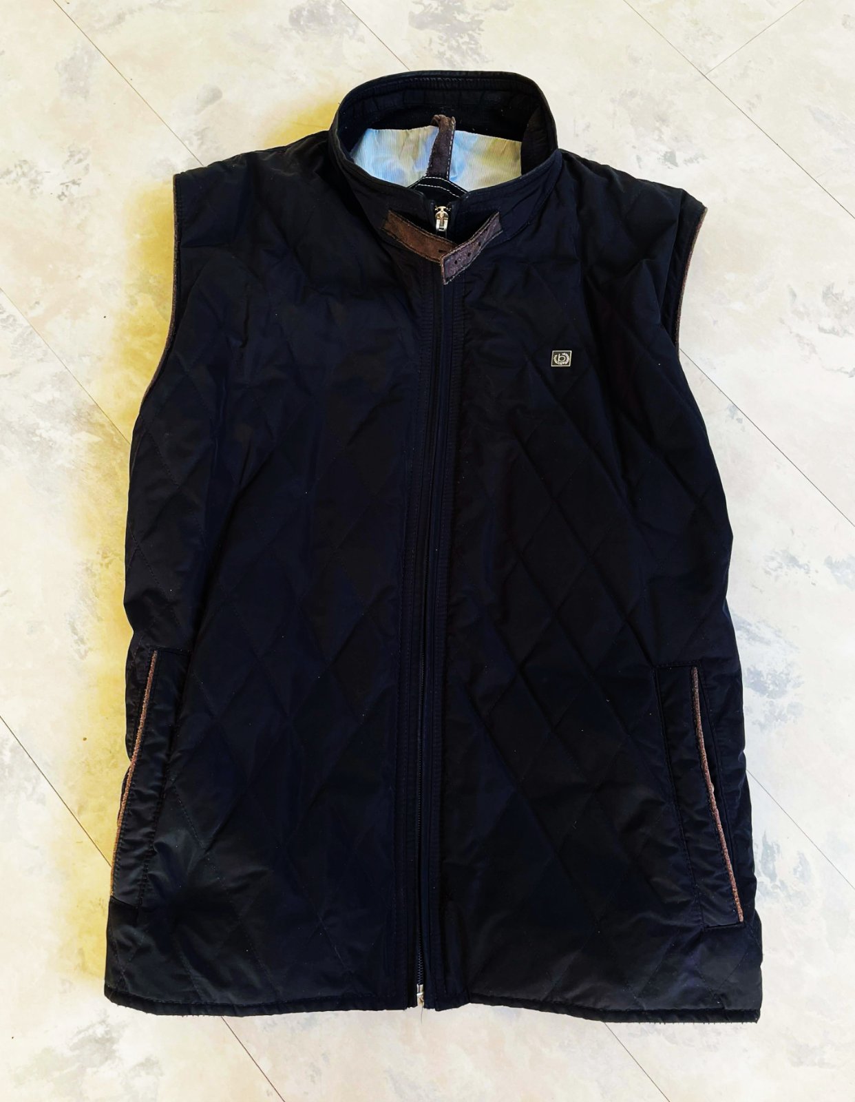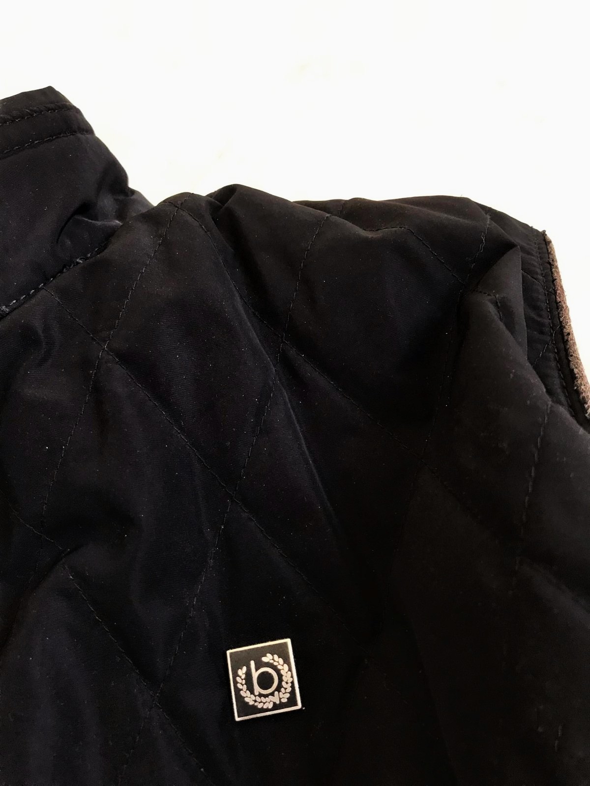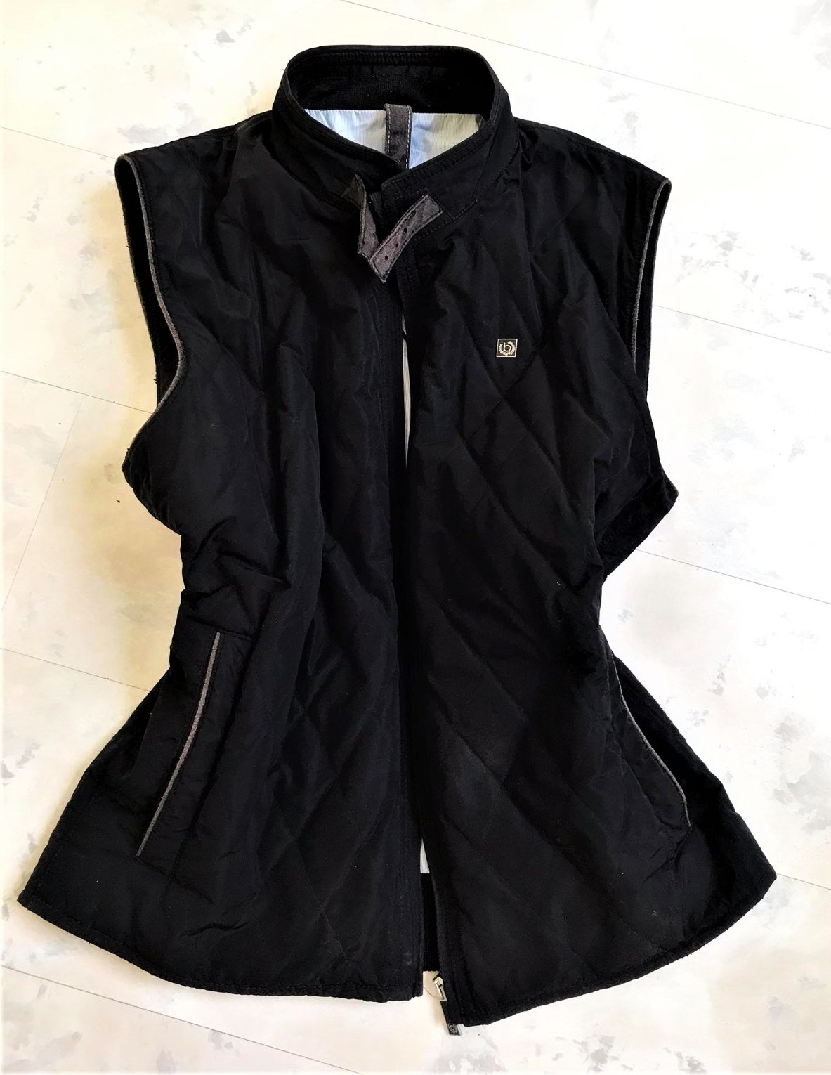 kvalitná značková unisex vesta značky Bugatti s prešívaným dizajnom,zadný diel je prešívané sedlo a úplet - 50% vlna,50% acryl,krásne riešená,podšitá jemným prúžkovaným plátenným futrom,vhodná aj na menej chladnú zimu - do auta,bočné vrecka na cvoky,vnútorné vrecká na mobil,peňaženku a pod,dlžka celkom = 66 cm, šírka = 58 x 2 cm,vrecká,prieramky a na upínačie pri krku je jemne ošúchaná koža - pôsobí to na pohľad dobre - ako vintage obnosené a nevadí to esteticky v nosení
