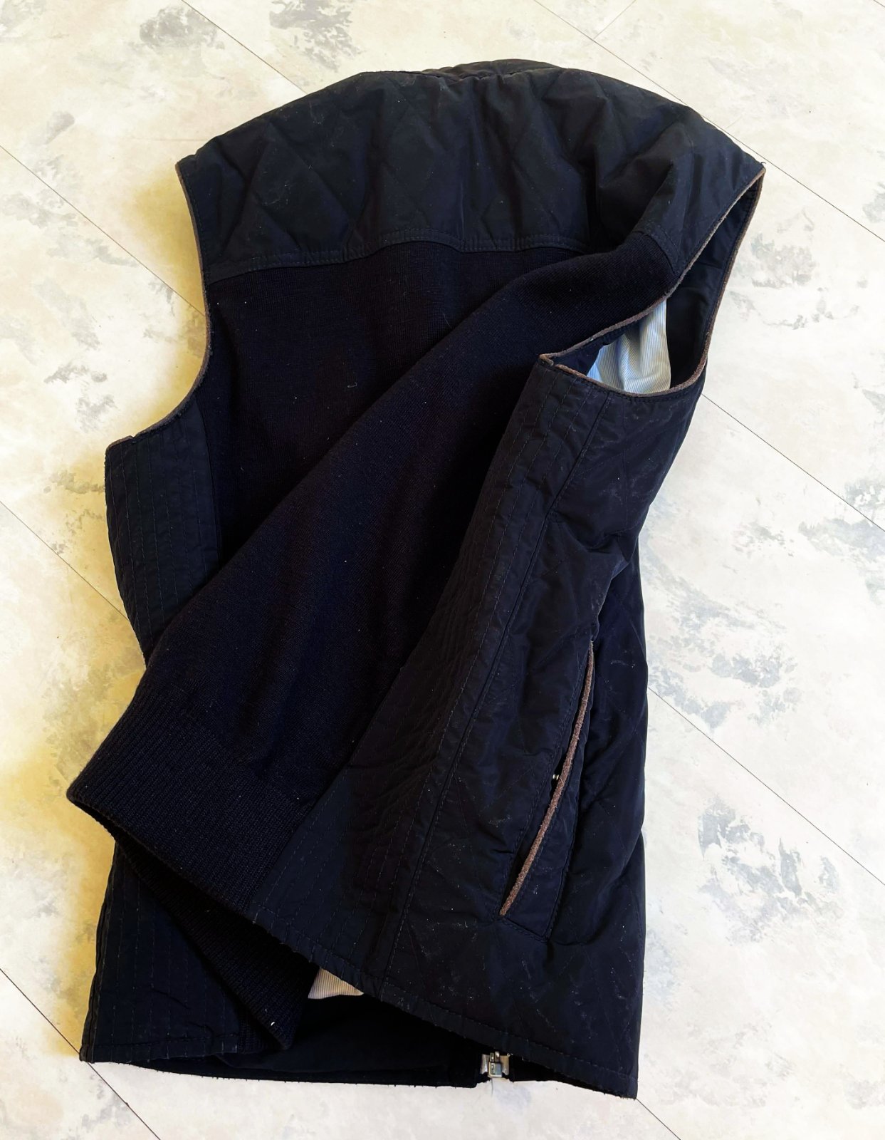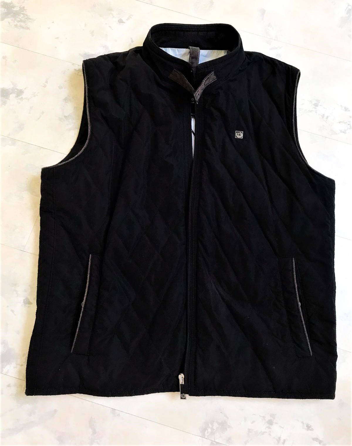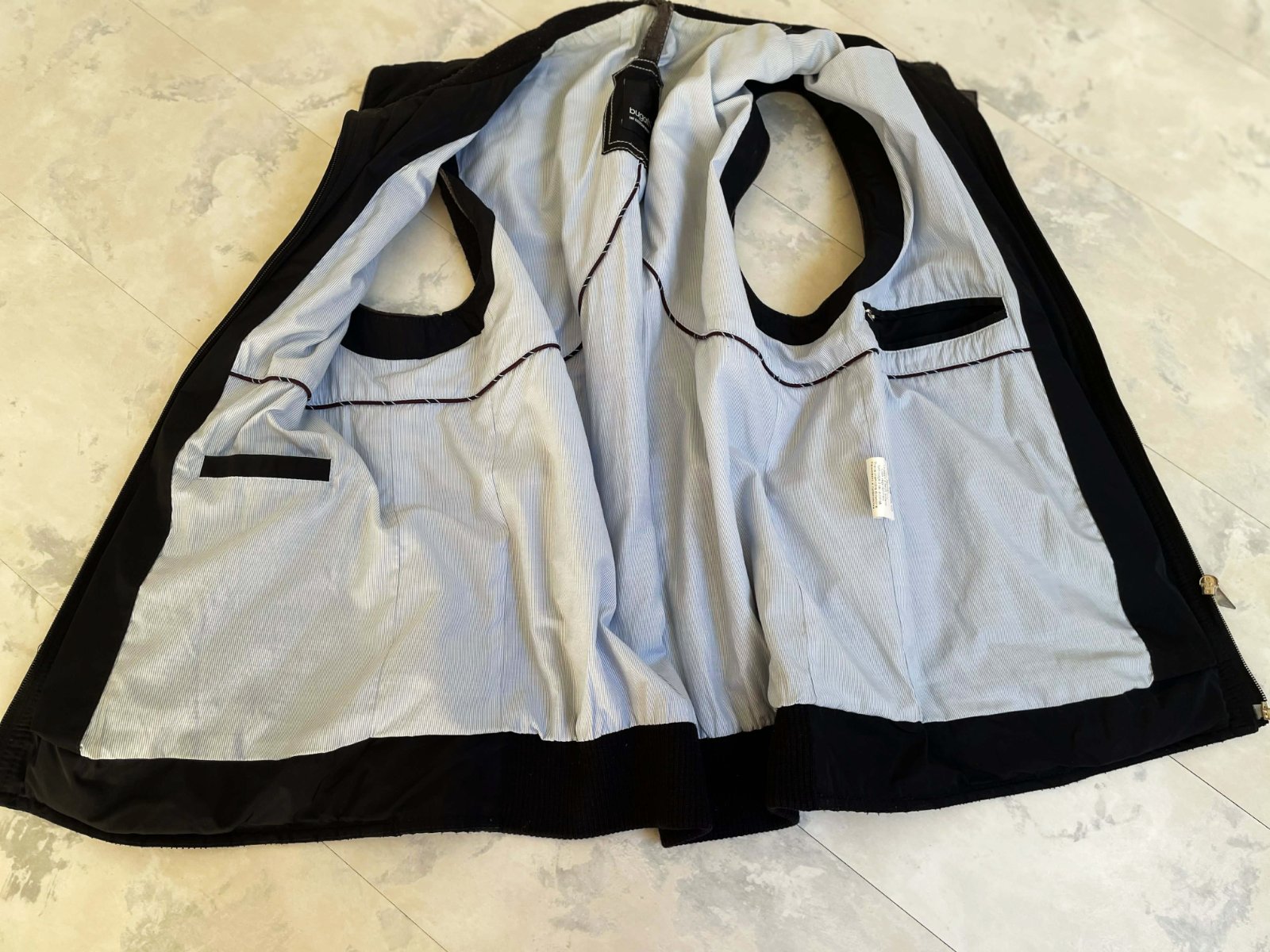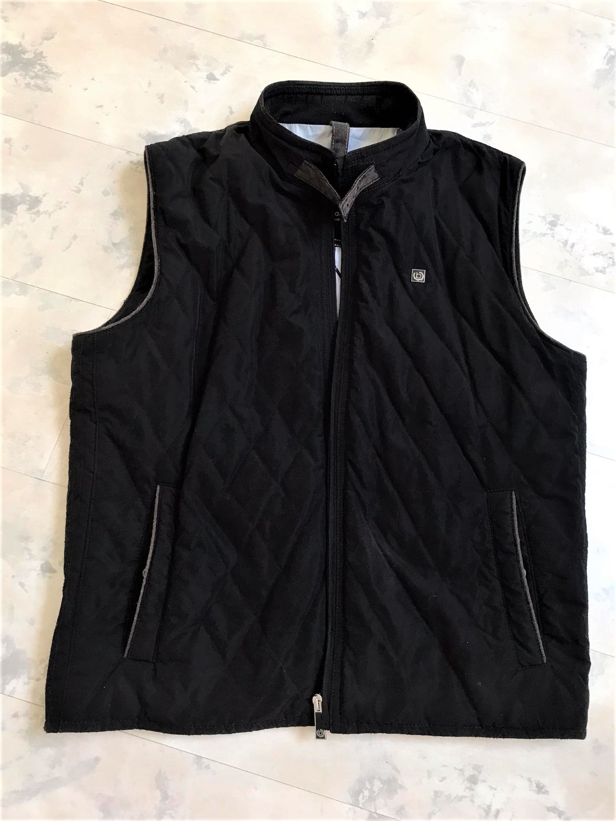 kvalitná značková unisex vesta značky Bugatti s prešívaným dizajnom,zadný diel je prešívané sedlo a úplet - 50% vlna,50% acryl,krásne riešená,podšitá jemným prúžkovaným plátenným futrom,vhodná aj na menej chladnú zimu - do auta,bočné vrecka na cvoky,vnútorné vrecká na mobil,peňaženku a pod,dlžka celkom = 66 cm, šírka = 58 x 2 cm,vrecká,prieramky a na upínačie pri krku je jemne ošúchaná koža - pôsobí to na pohľad dobre - ako vintage obnosené a nevadí to esteticky v nosení