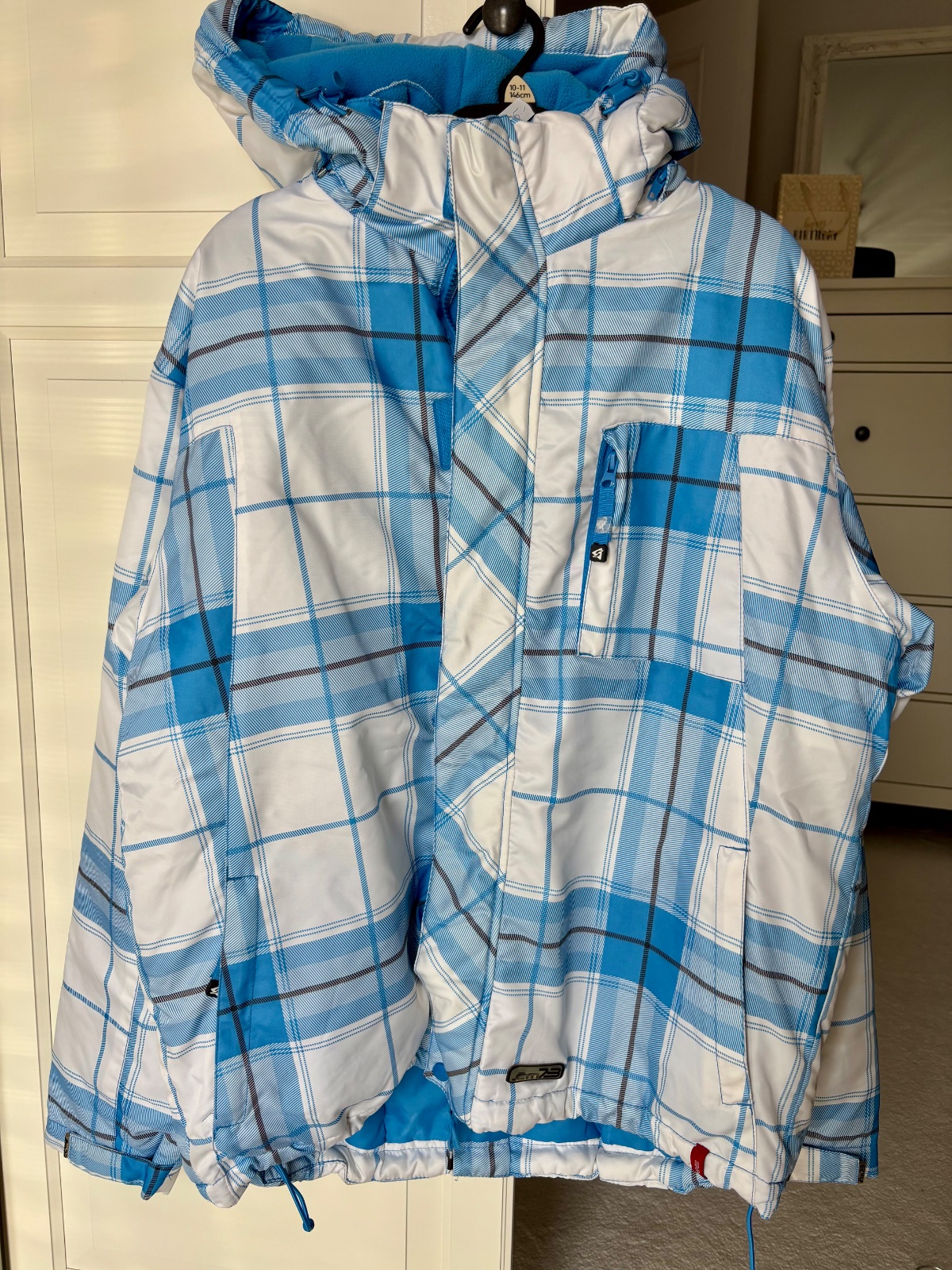 Pod pazuchami 52cm, spodok bundy šírka 50cm, dĺžka bundy 68cm, rukav od kapucne 77cm, kapucňa sa dá odopnúť, párkrát oblečená