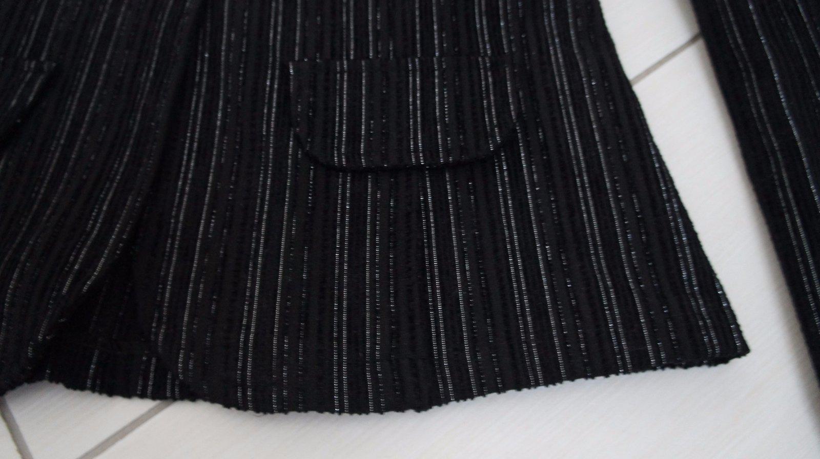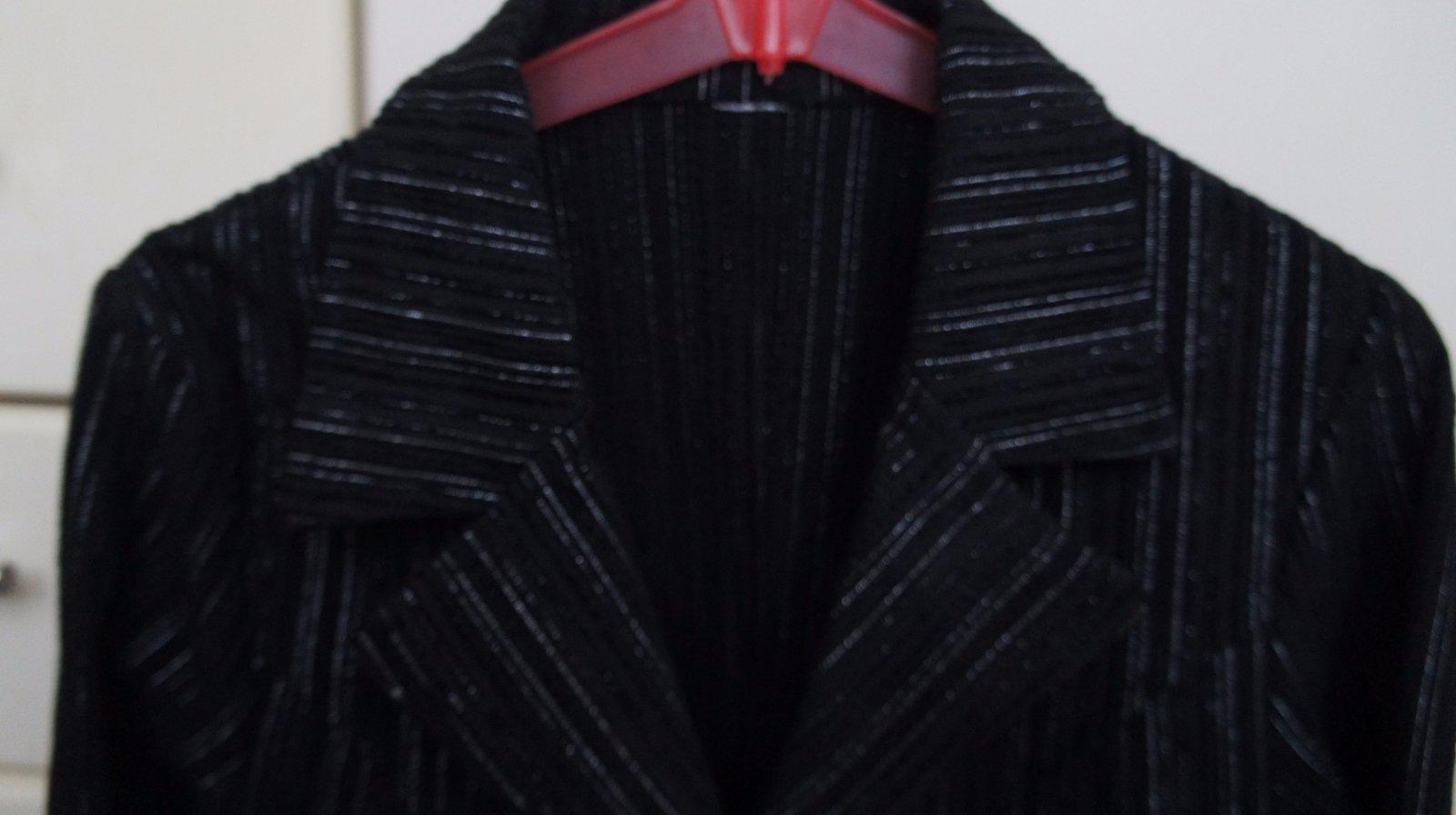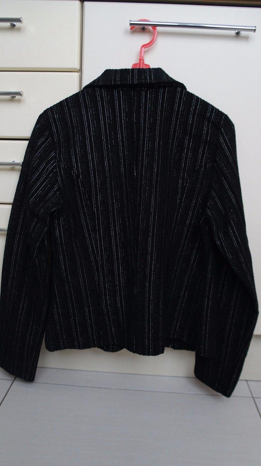 Predám dámske sako. Farebné prevedenie: čierne so strieborným pozdĺžnym prešívaním. Zapínanie na 2 gombíky, vrecká len naznačené (nie sú reálne). Nie je podšité. Látka mierne elastická, takže sa krásne prispôsobí postave. Nie je to sako na leto, je to skôr hrubšia látka. Vo veľmi dobrom nosenom stave, nemá žiadne poškodenia.
