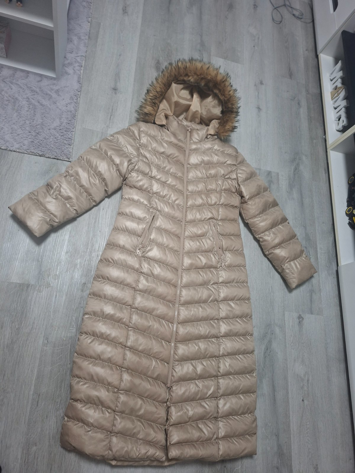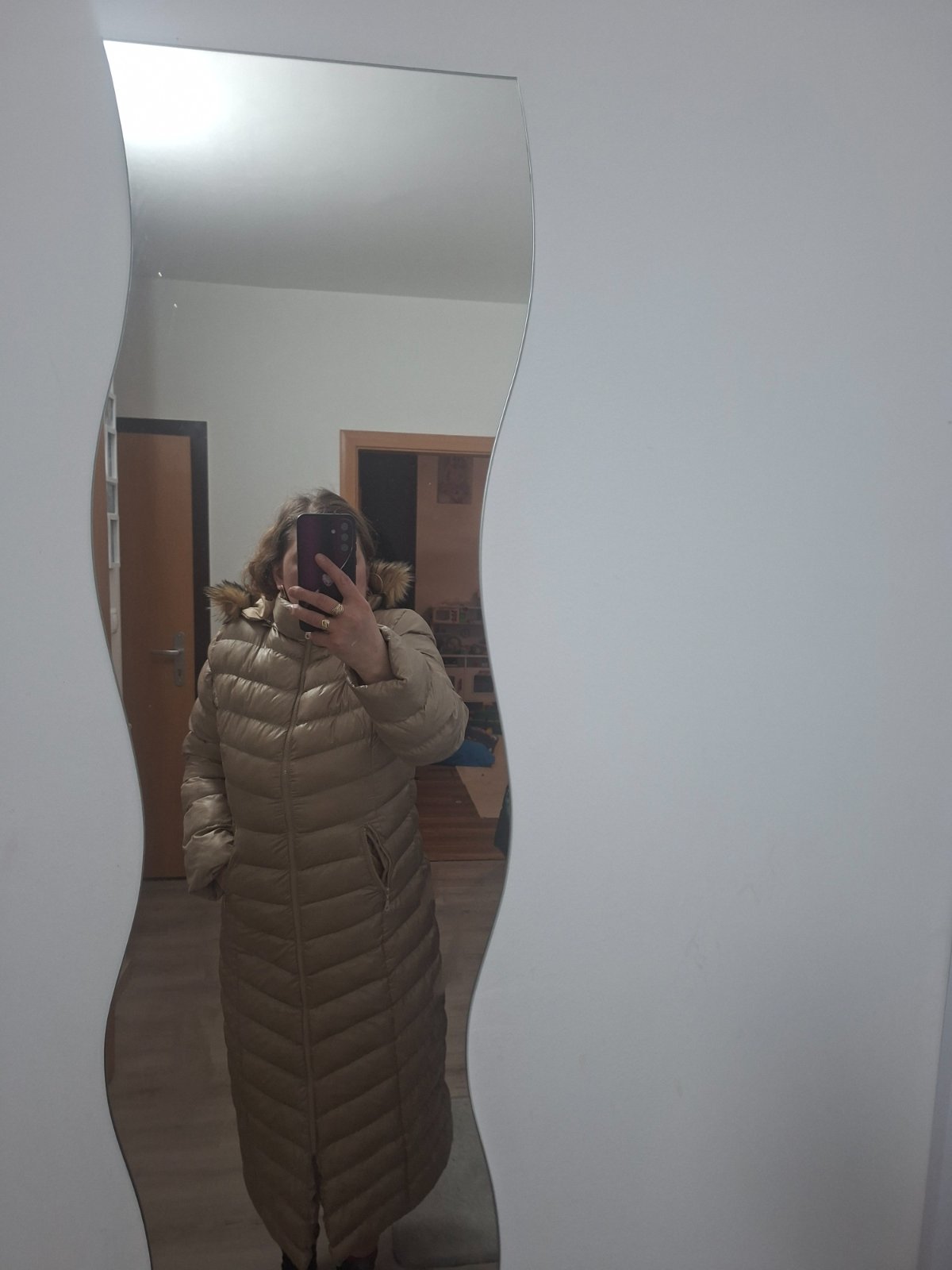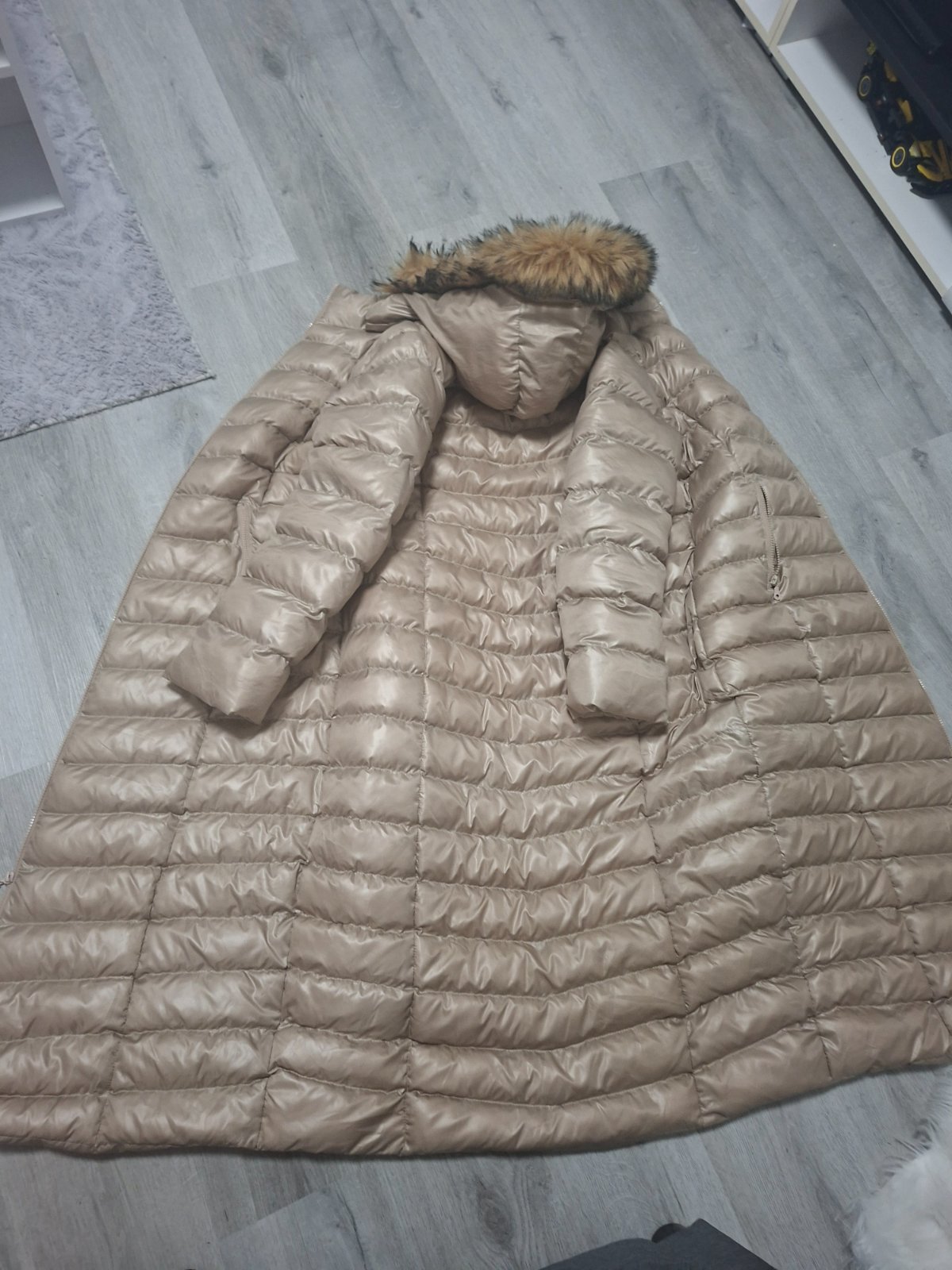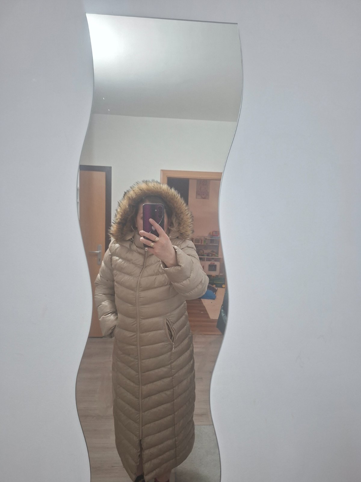 Kúpená tu. Mne nesadla veľkosť. Béžová farba. Ľahučka, tepla. Velkost M,L. Hrudník cca 50 vm, dlzka cca 116 cm. Kapucňa sa da odopnut. Cena 20 eur.