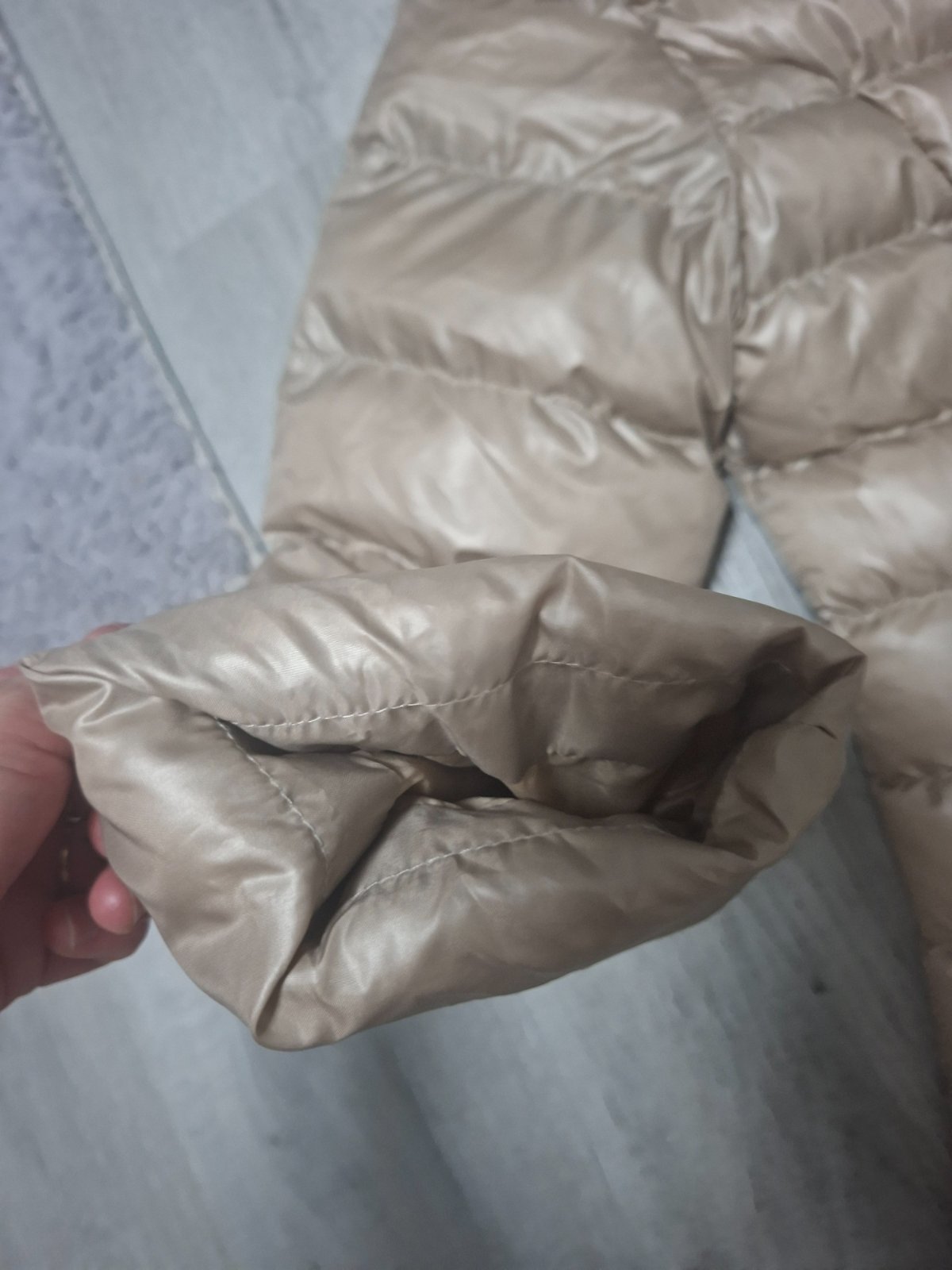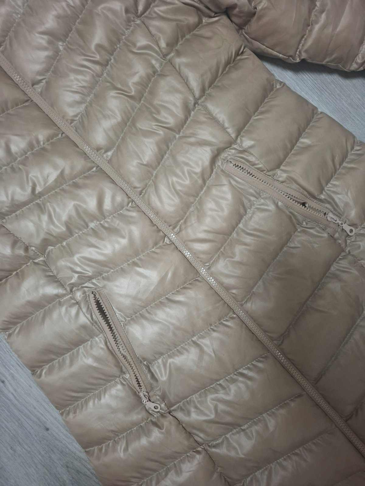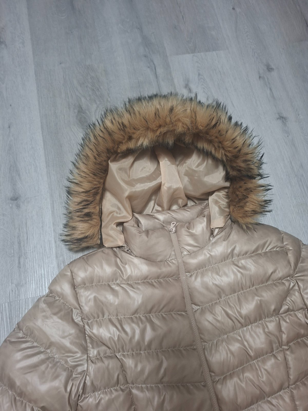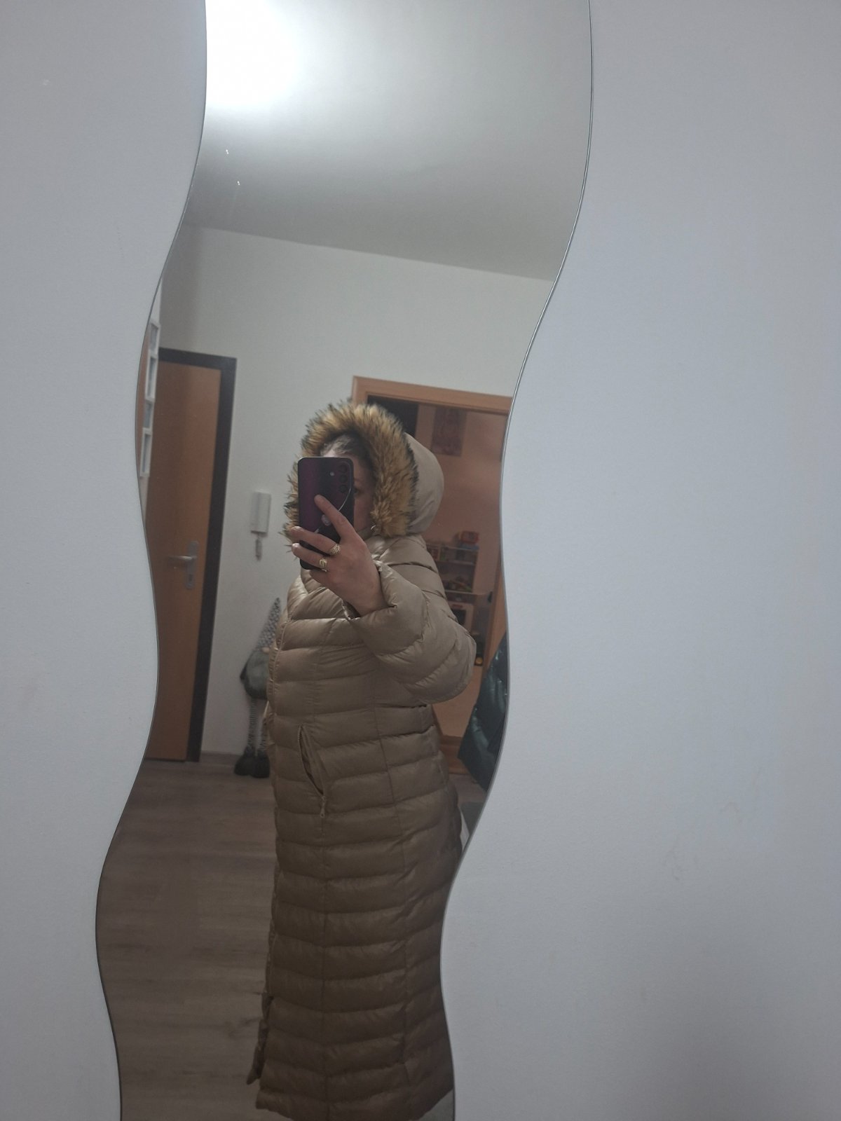 Kúpená tu. Mne nesadla veľkosť. Béžová farba. Ľahučka, tepla. Velkost M,L. Hrudník cca 50 vm, dlzka cca 116 cm. Kapucňa sa da odopnut. Cena 20 eur.