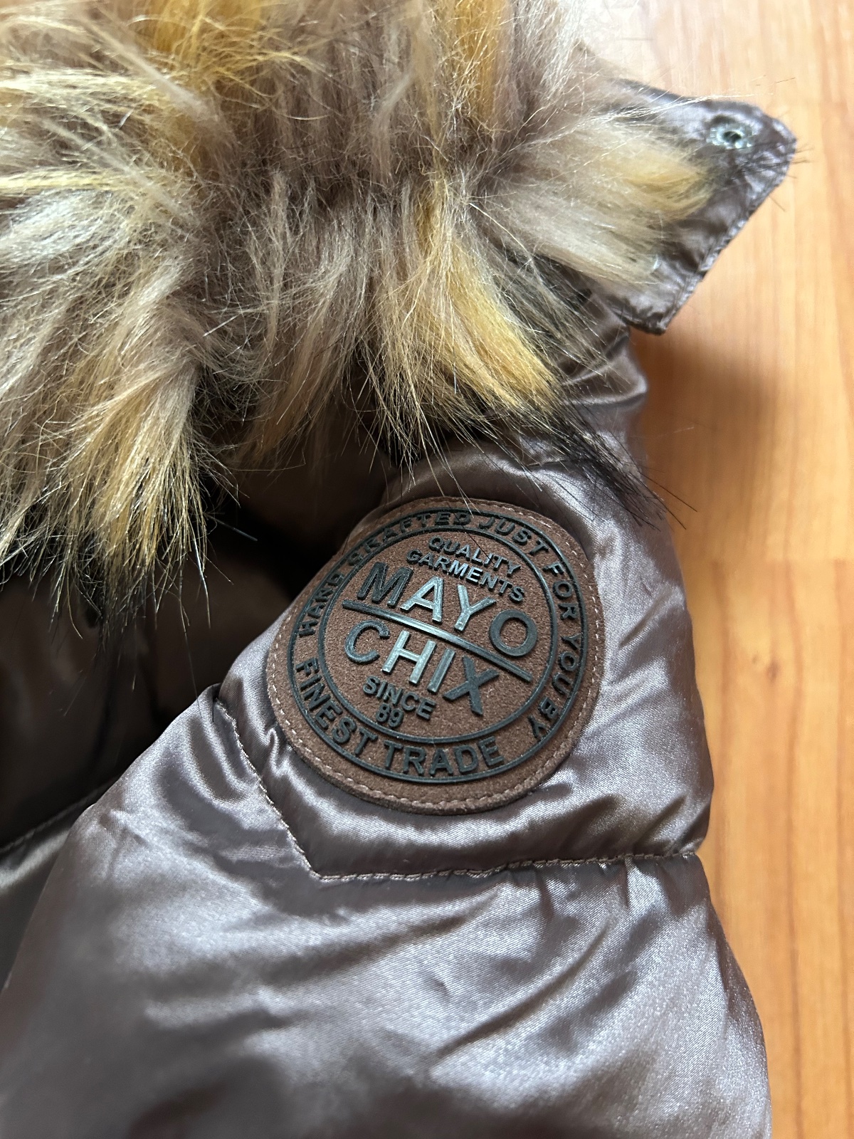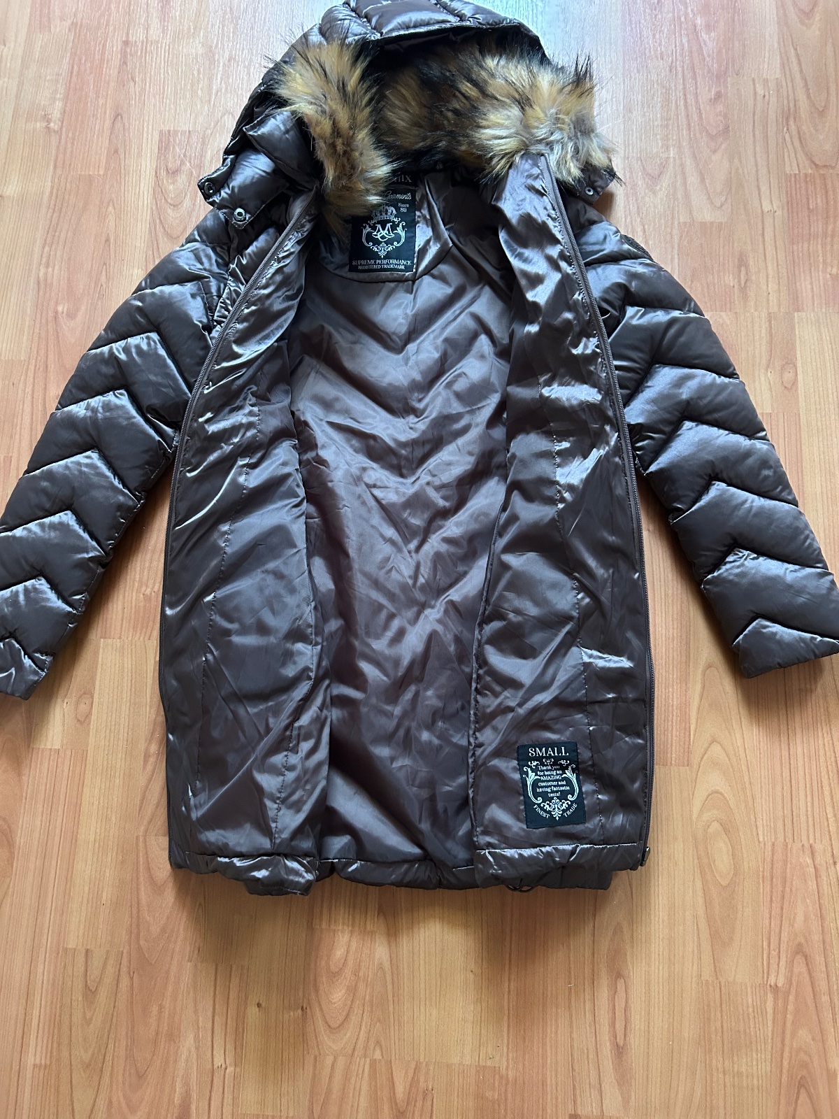 Krásna bundička v top stave, oblečená len raz. Je mi už úzka preto posúvam ďalej. Niekomu ešte spraví radosť. Miery: Rukav - 64cm, hrudník - 45x2cm, pás-40x2cm, boky 48x2cm a celková dĺžka -85cm. Kapucňu aj kožušinka sa dajú dať dole.