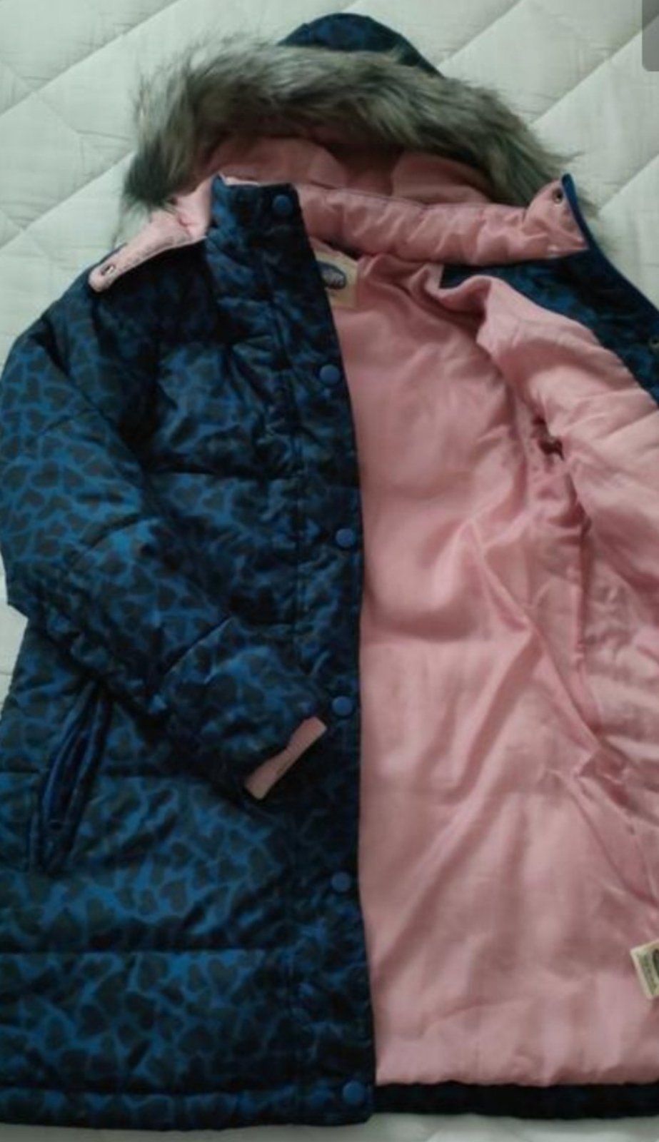 Zimna vetrovka, velmi tepla, zateplena kožušinou, nosena, stav velmi dobry. Velkost pisu 8, tipujem tak 134, treba pomerat. Rozmery nafotene